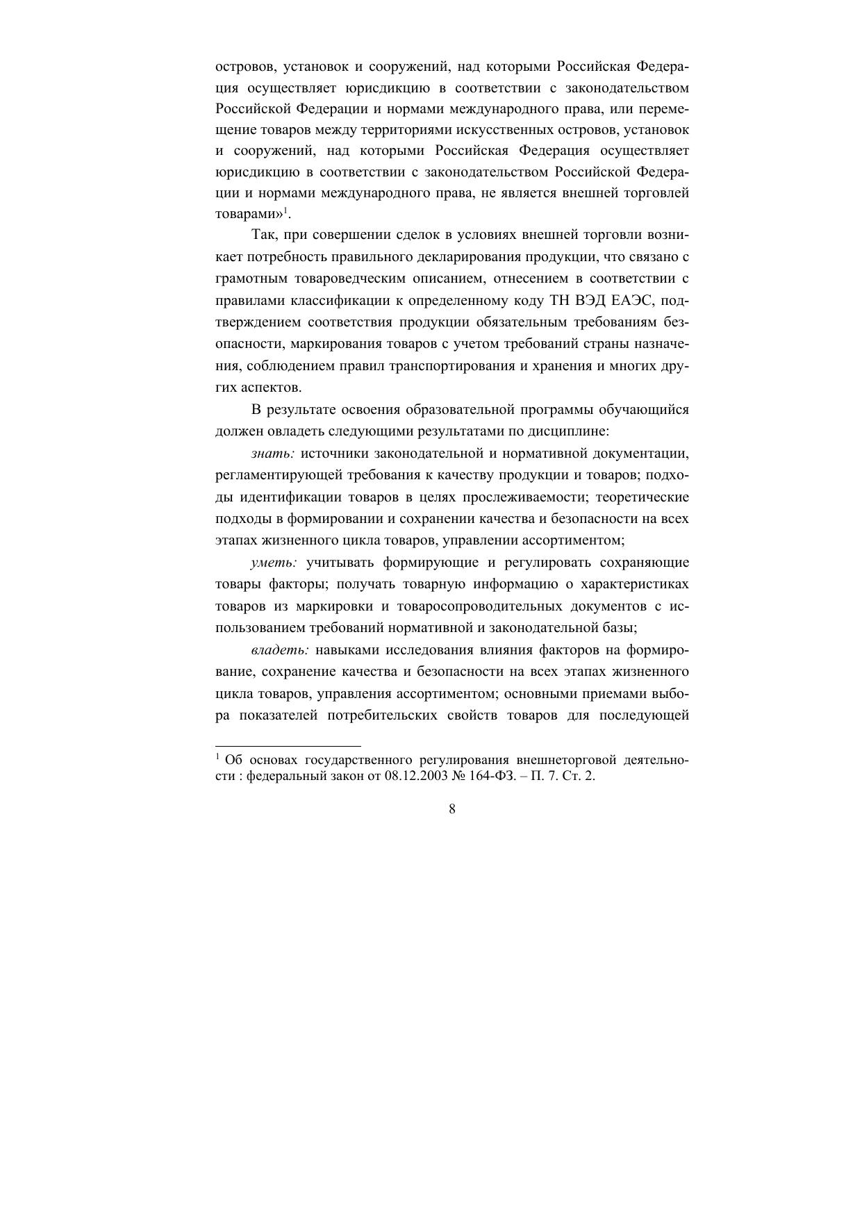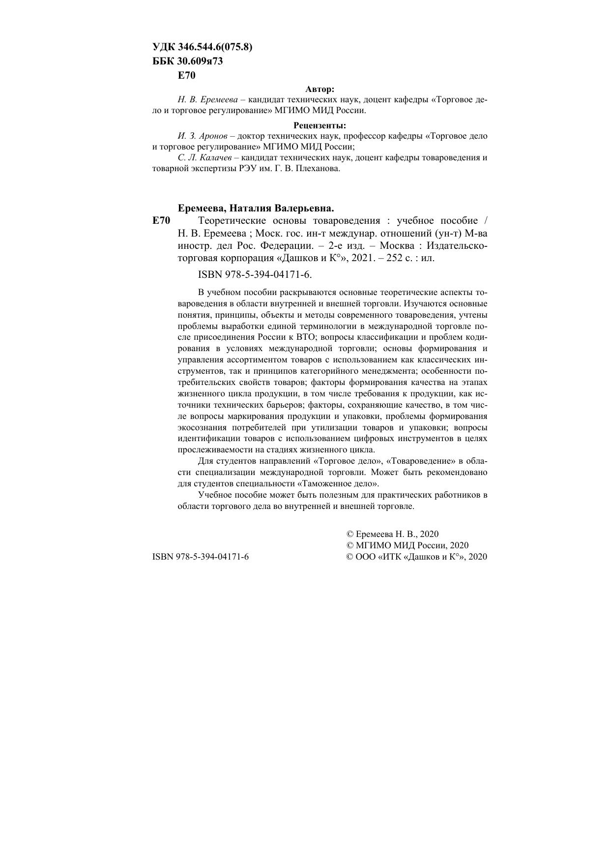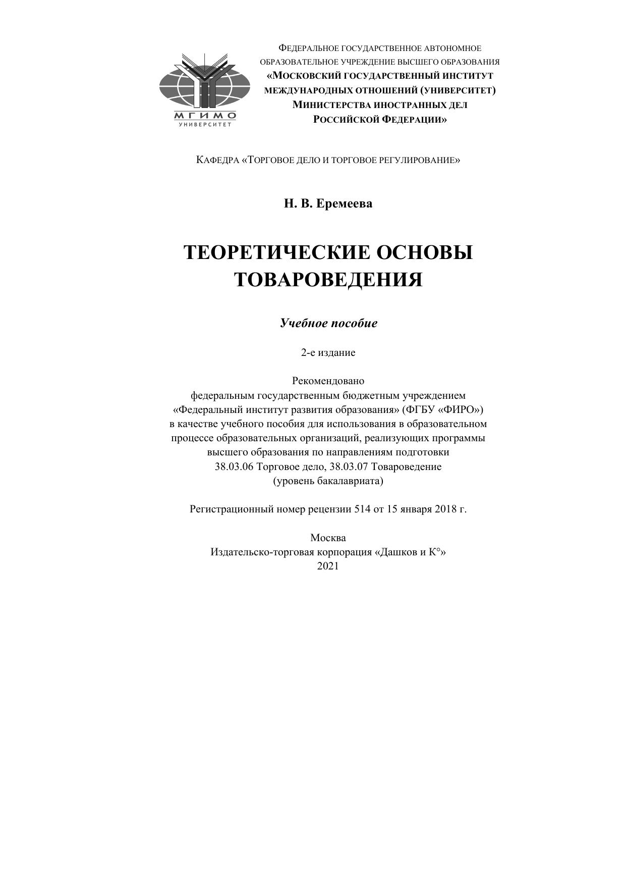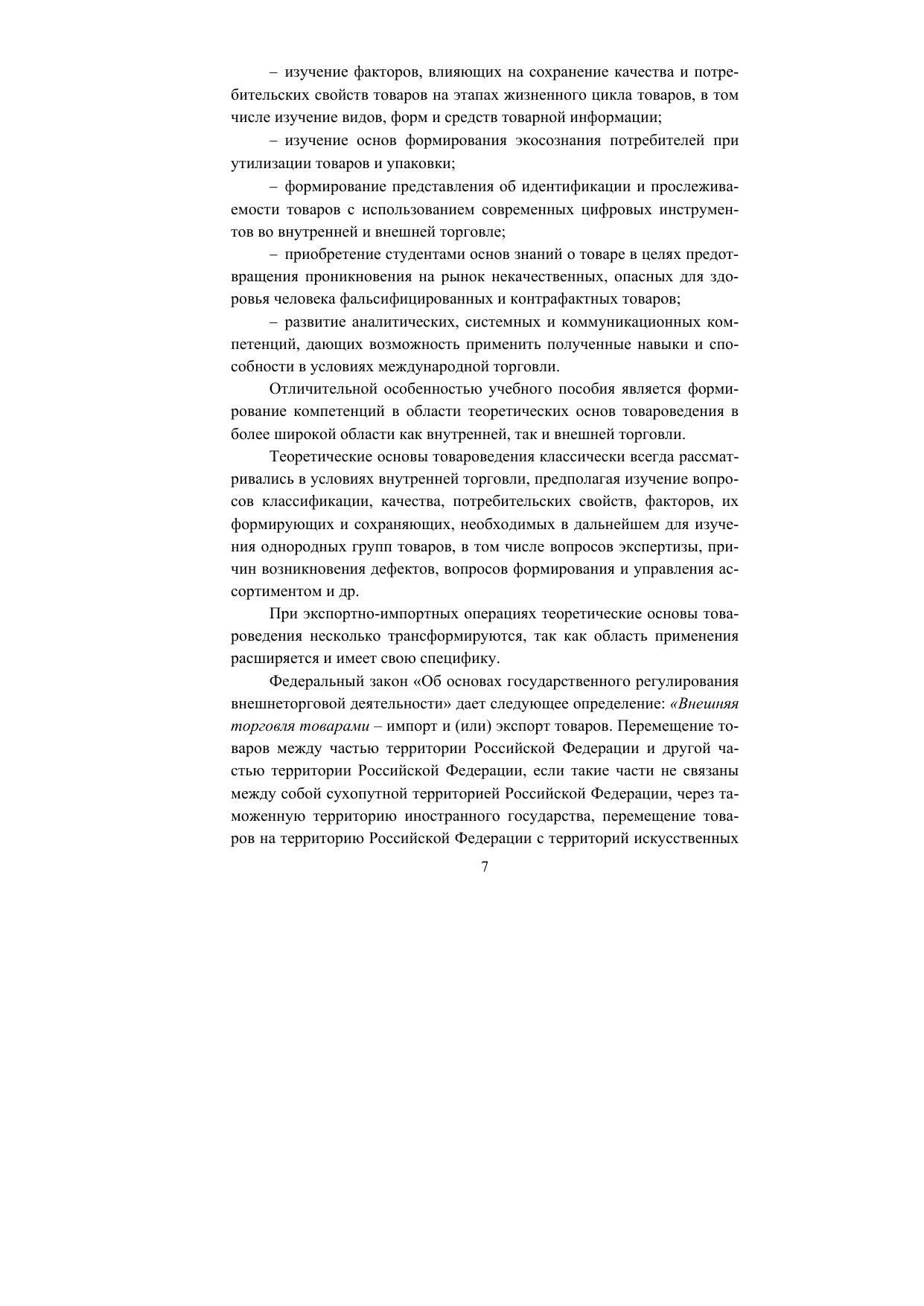 В учебном пособии раскрываются основные теоретические аспекты товароведения в области внутренней и внешней торговли. Изучаются основные понятия, принципы, объекты и методы современного товароведения, учтены проблемы выработки единой терминологии в международной торговле после присоединения России к ВТО; вопросы классификации и проблем кодирования в условиях международной торговли; основы формирования и управления ассортиментом товаров с использованием как классических инструментов, так и принципов категорийного менеджмента; особенности потребительских свойств товаров; факторы формирования качества на этапах жизненного цикла продукции, в том числе требования к продукции, как источники технических барьеров; факторы, сохраняющие качество, в том числе вопросы маркирования продукции и упаковки, проблемы формирования экосознания потребителей при утилизации товаров и упаковки; вопросы идентификации товаров с использованием цифровых инструментов в целях прослеживаемости на стадиях жизненного цикла.