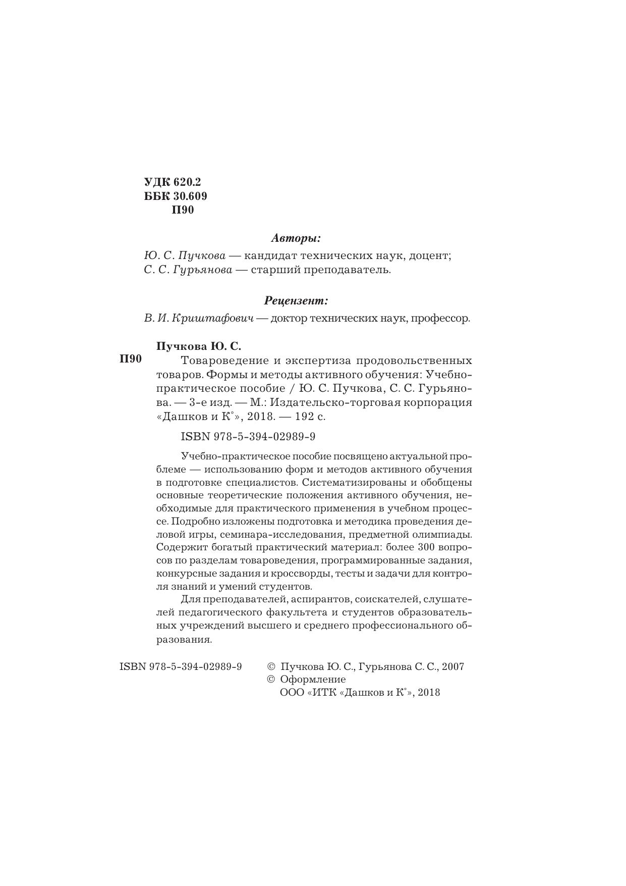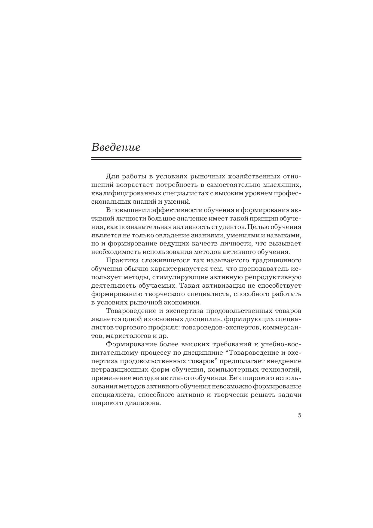 Учебно-практическое пособие посвящено актуальной проблеме — использованию форм и методов активного обучения в подготовке специалистов. Систематизированы и обобщены основные теоретические положения активного обучения, необходимые для практического применения в учебном процессе. Подробно изложены подготовка и методика проведения деловой игры, семинара-исследования, предметной олимпиады. Содержит богатый практический материал: более 300 вопросов по разделам товароведения, программированные задания, конкурсные задания и кроссворды, тесты и задачи для контроля знаний и умений студентов. Для преподавателей, аспирантов, соискателей, слушателей педагогического факультета и студентов образовательных учреждений высшего и среднего профессионального образования.