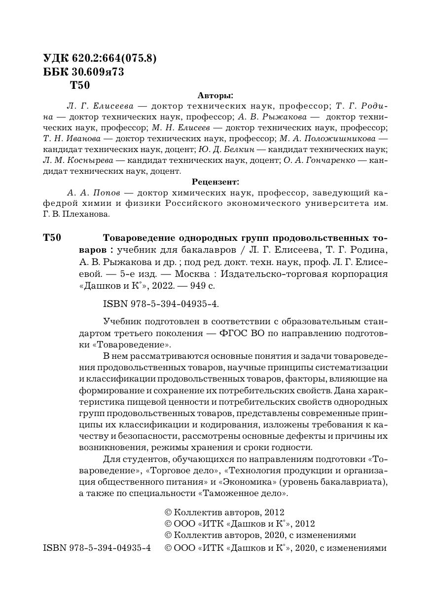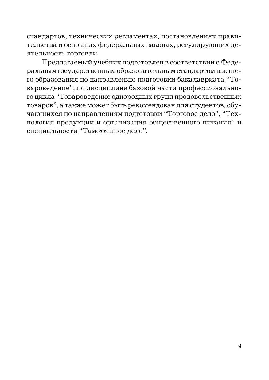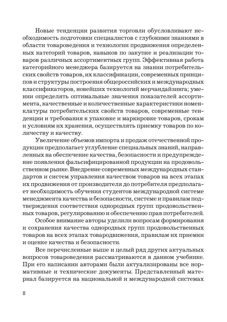 Учебник подготовлен в соответствии с ФГОС третьего поколения по направлению подготовки "Товароведение" по базовой дисциплине профессионального цикла "Товароведение однородных групп продовольственных товаров". В нем рассматриваются основные понятия и задачи товароведения продовольственных товаров, научные принципы систематизации и классификации продовольственных товаров, факторы, влияющие на формирование и сохранение их потребительских свойств. Дана характеристика пищевой ценности и потребительских свойств однородных групп продовольственных товаров, представлены современные принципы их классификации и кодирования, изложены требования к качеству и безопасности, рассмотрены основные дефекты и причины их возникновения, режимы хранения и сроки годности. Для студентов бакалавриата, обучающихся по направлениям подготовки "Товароведение", "Торговое дело", "Технология продукции и организация общественного питания" и "Экономика".