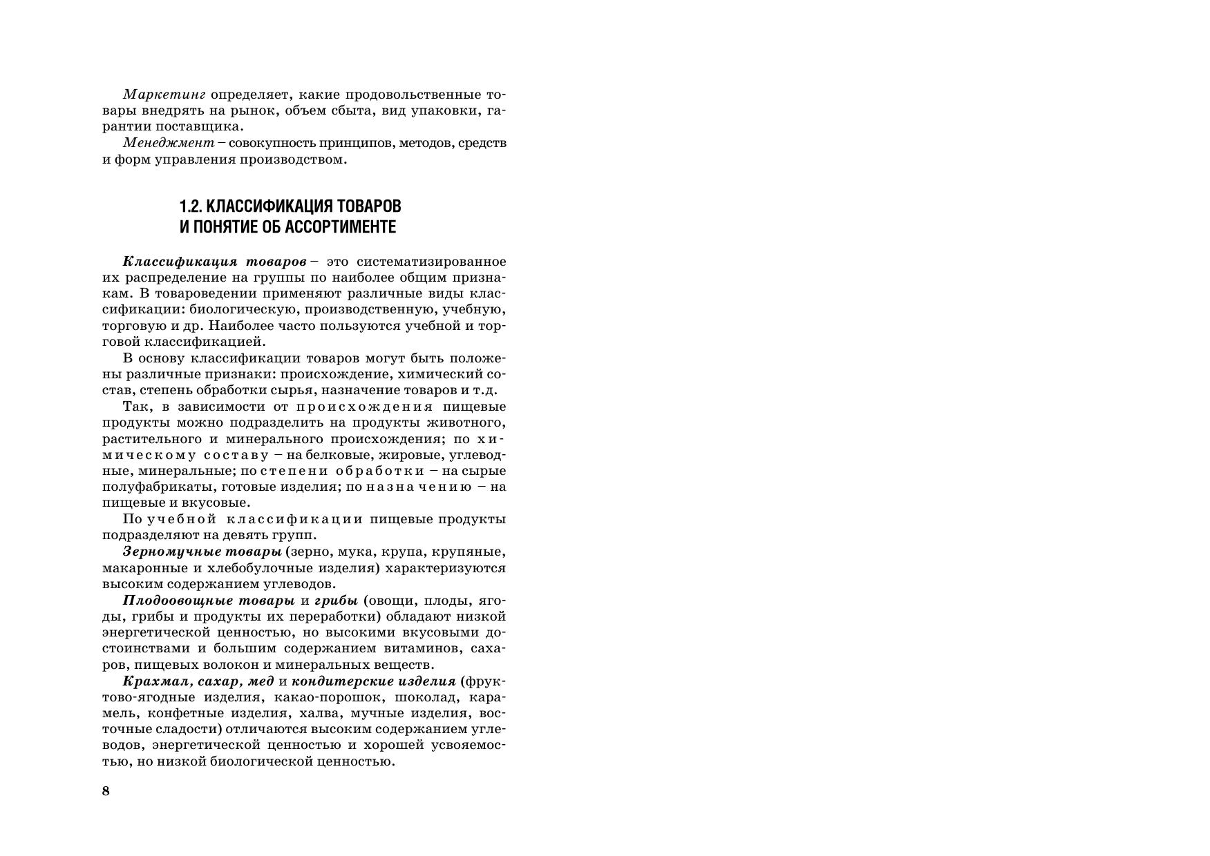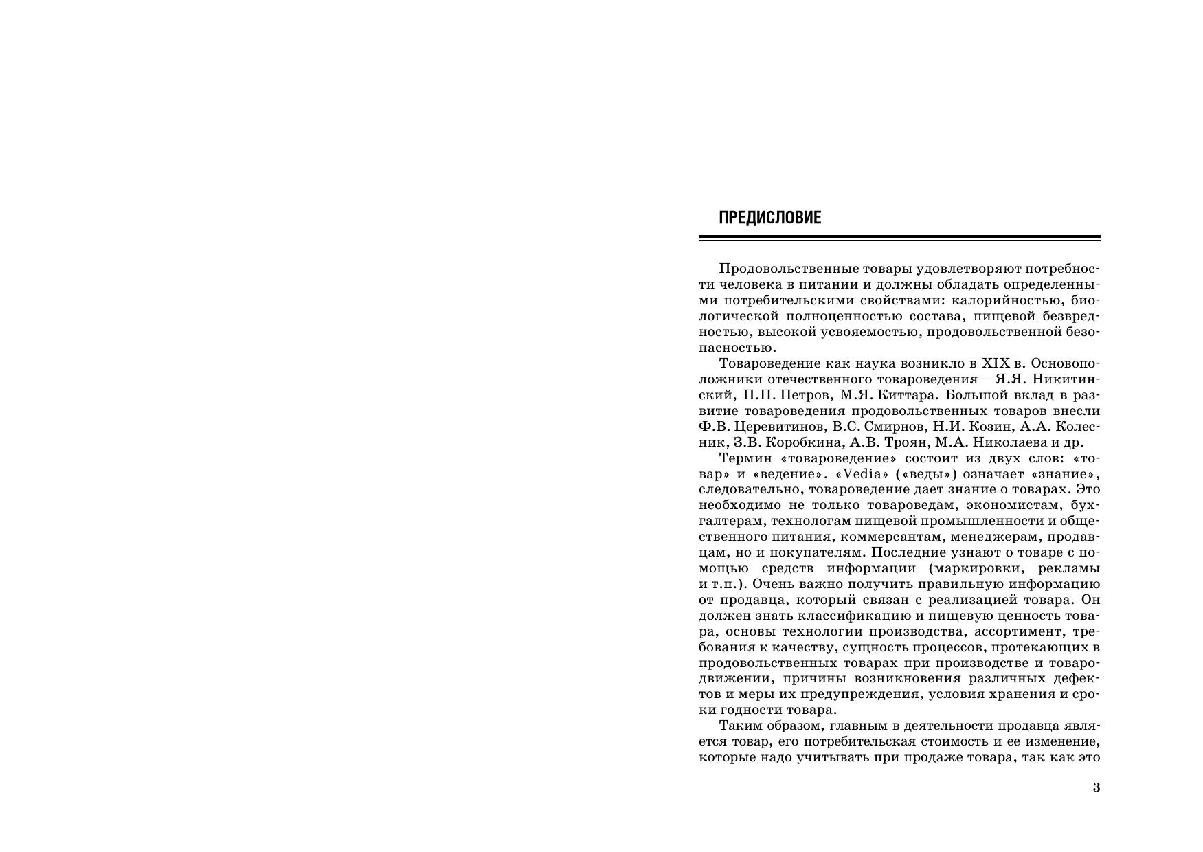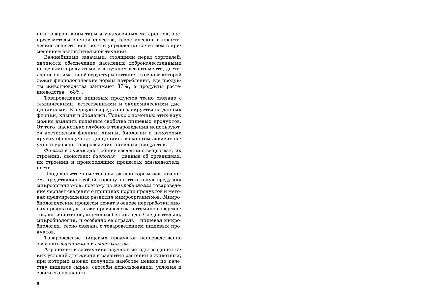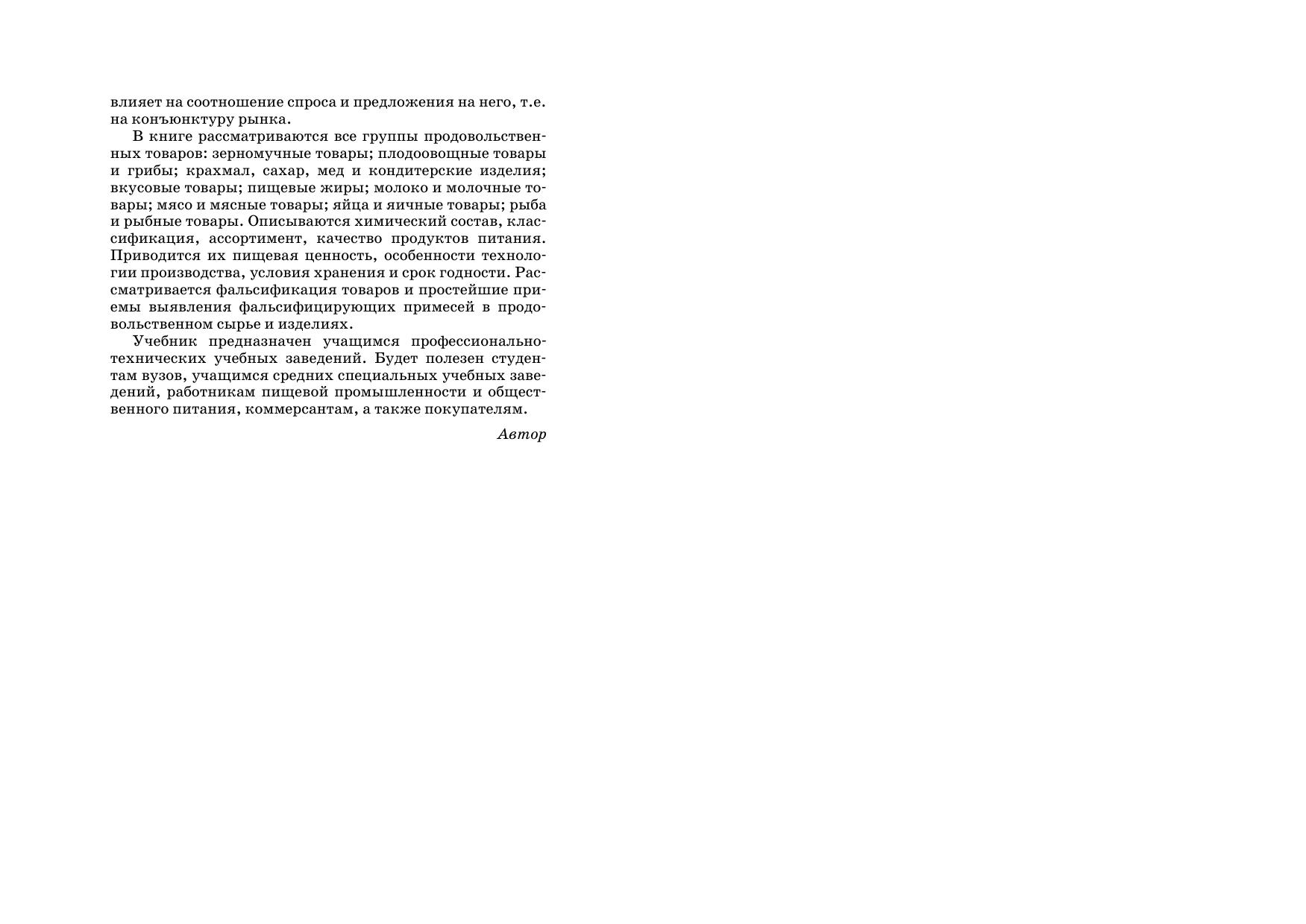Описываются пищевая ценность, химический состав, классификация, ассортимент, качество продуктов питания. Рассматриваются: зерномучные товары плодоовощные товары и грибы крахмал, сахар, мед и кондитерские изделия вкусовые товары пищевые жиры молоко и молочные товары мясо и мясные товары яйца и яичные товары рыба и рыбные товары. Приводятся особенности технологии их производства, условия хранения и срок годности, фальсификация товаров и простейшие приемы выявления фальсифицирующих примесей. Предыдущее издание вышло в 2009 г. Для студентов вузов, учащихся ССУЗов и ПТУ, а также товароведов, экономистов, бухгалтеров, технологов пищевой промышленности, покупателей.