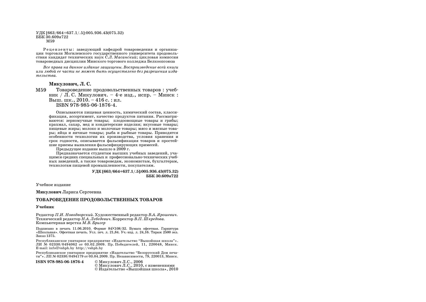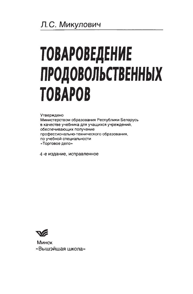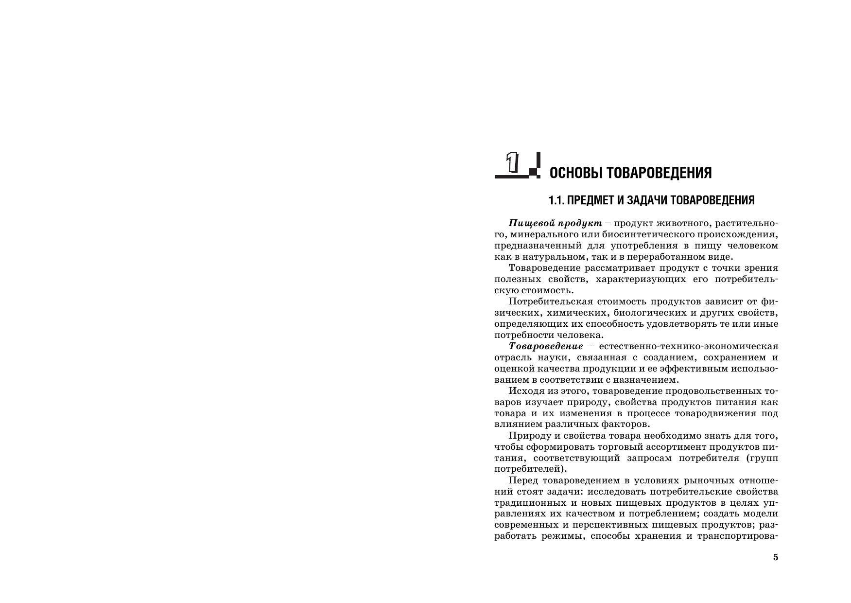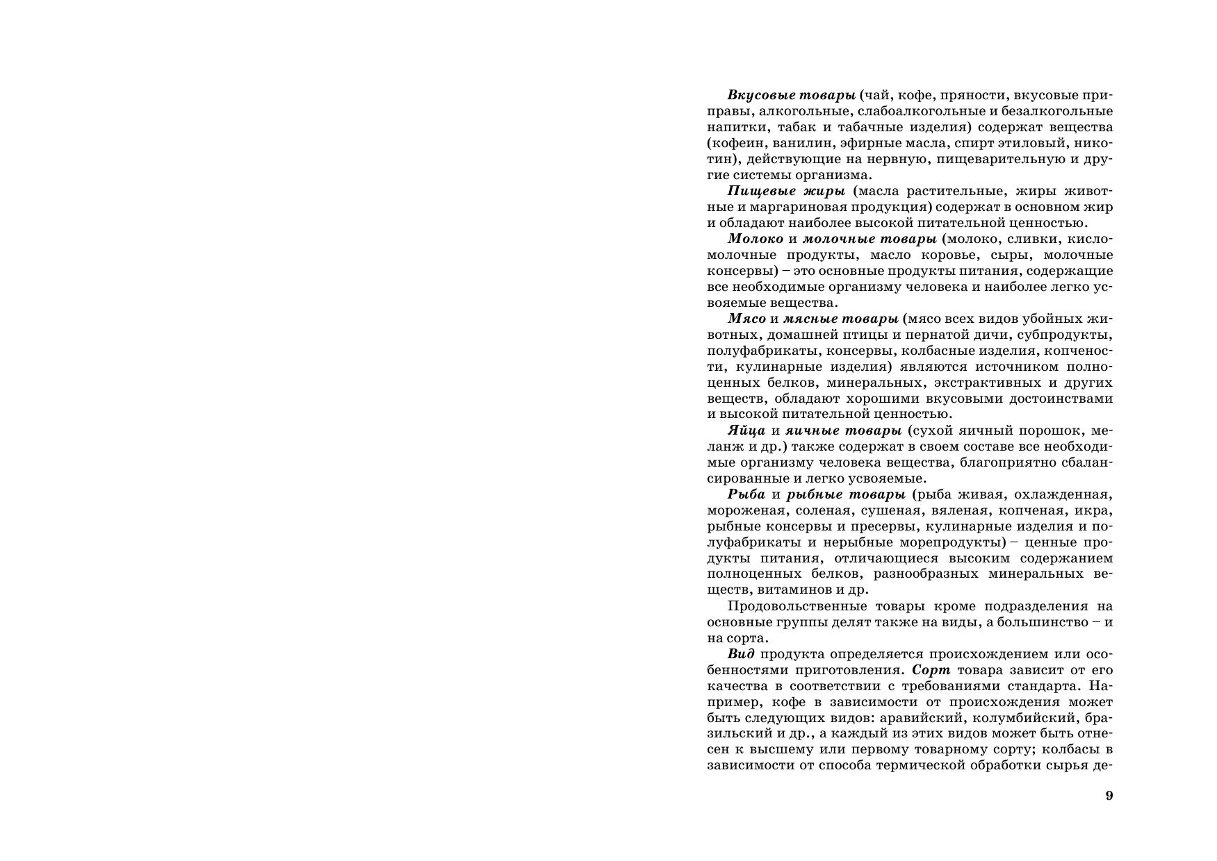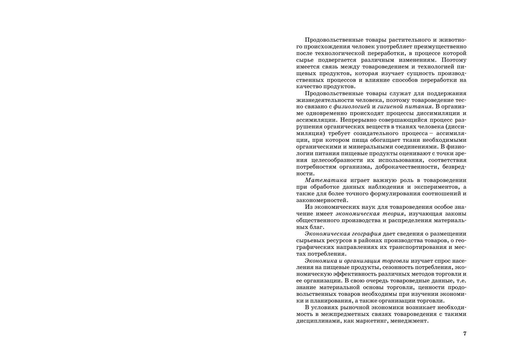 Описываются пищевая ценность, химический состав, классификация, ассортимент, качество продуктов питания. Рассматриваются: зерномучные товары плодоовощные товары и грибы крахмал, сахар, мед и кондитерские изделия вкусовые товары пищевые жиры молоко и молочные товары мясо и мясные товары яйца и яичные товары рыба и рыбные товары. Приводятся особенности технологии их производства, условия хранения и срок годности, фальсификация товаров и простейшие приемы выявления фальсифицирующих примесей. Предыдущее издание вышло в 2009 г. Для студентов вузов, учащихся ССУЗов и ПТУ, а также товароведов, экономистов, бухгалтеров, технологов пищевой промышленности, покупателей.