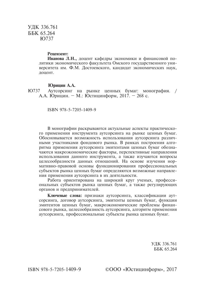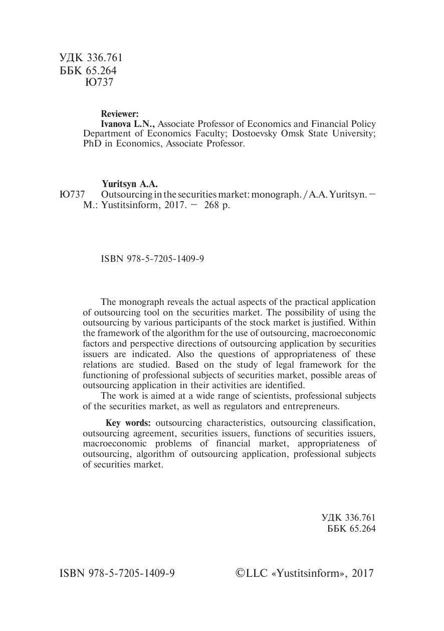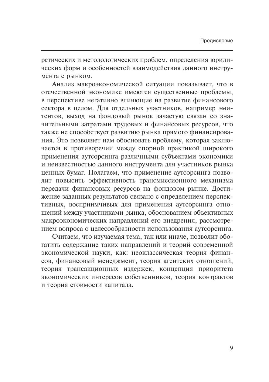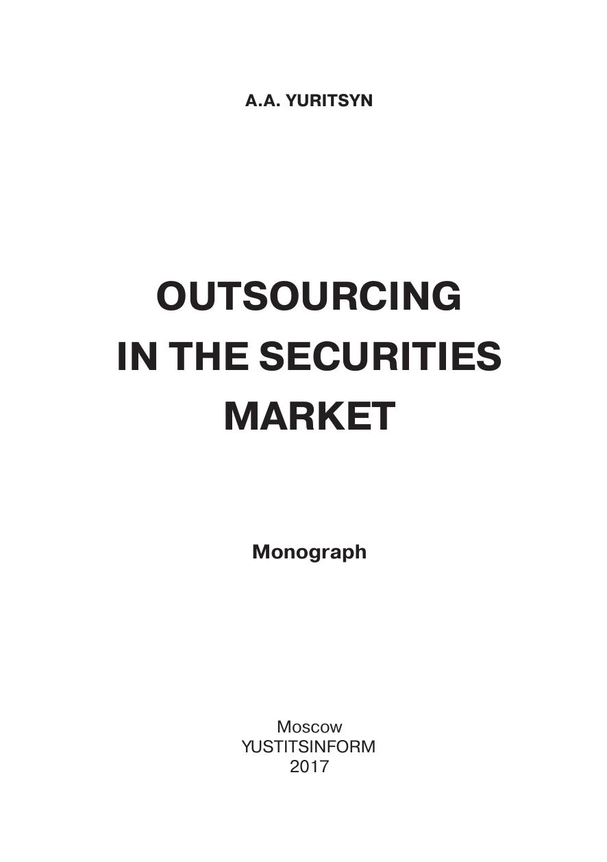 В монографии раскрываются актуальные аспекты практического применения инструмента аутсорсинга на рынке ценных бумаг. Обосновывается возможность использования аутсорсинга различными участниками фондового рынка. В рамках построения алгоритма применения аутсорсинга эмитентами ценных бумаг обозначаются макроэкономические факторы, перспективные направления использования данного инструмента, а также изучаются вопросы целесообразности данных отношений. На основе изучения нормативно-правовой основы функционирования профессиональных субъектов рынка ценных бумаг определяются возможные направления применения аутсорсинга в их деятельности.