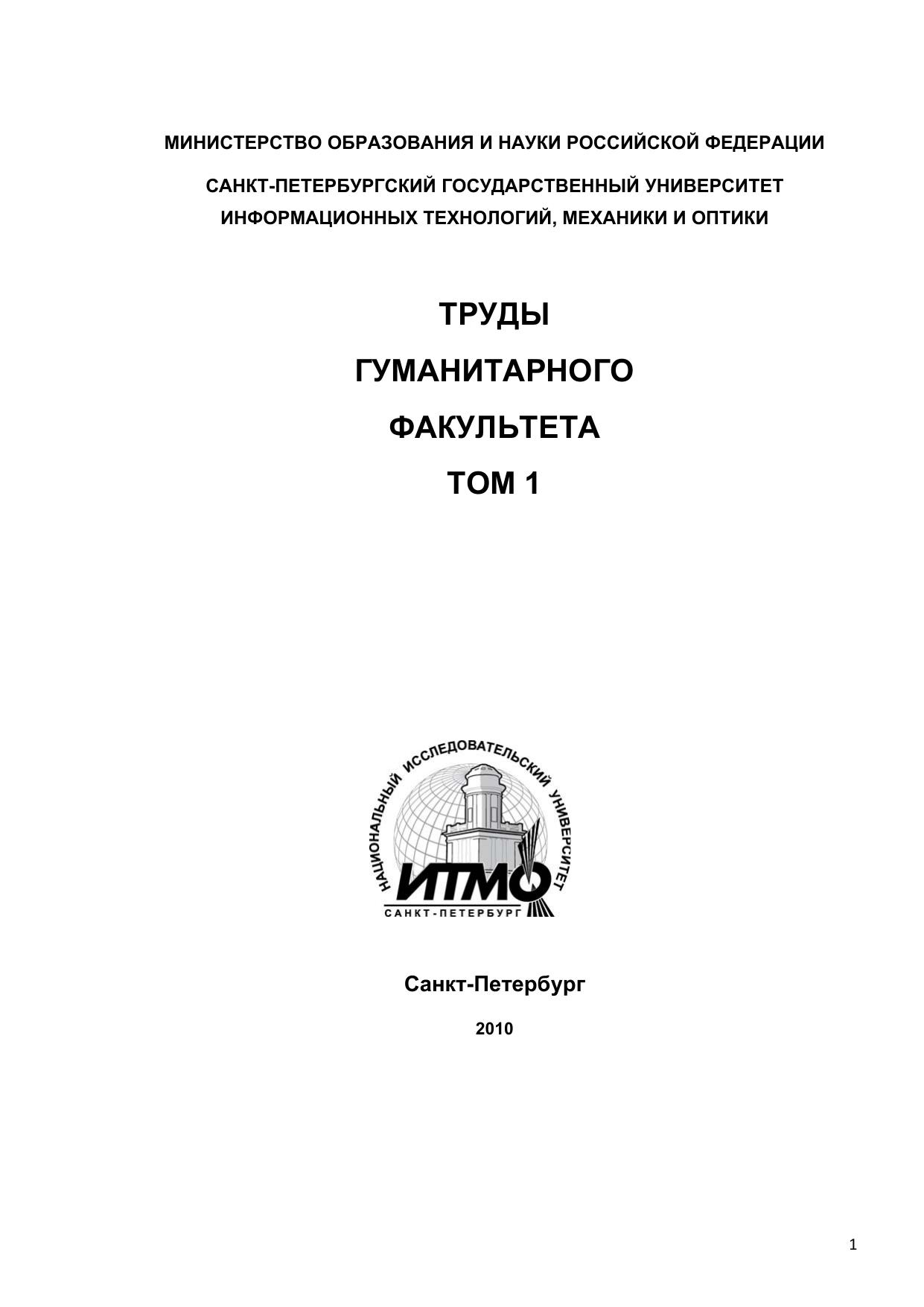 Труды гуманитарного факультета СПбГУ ИТМО: Сборник научных статей в 2 т. Том 1