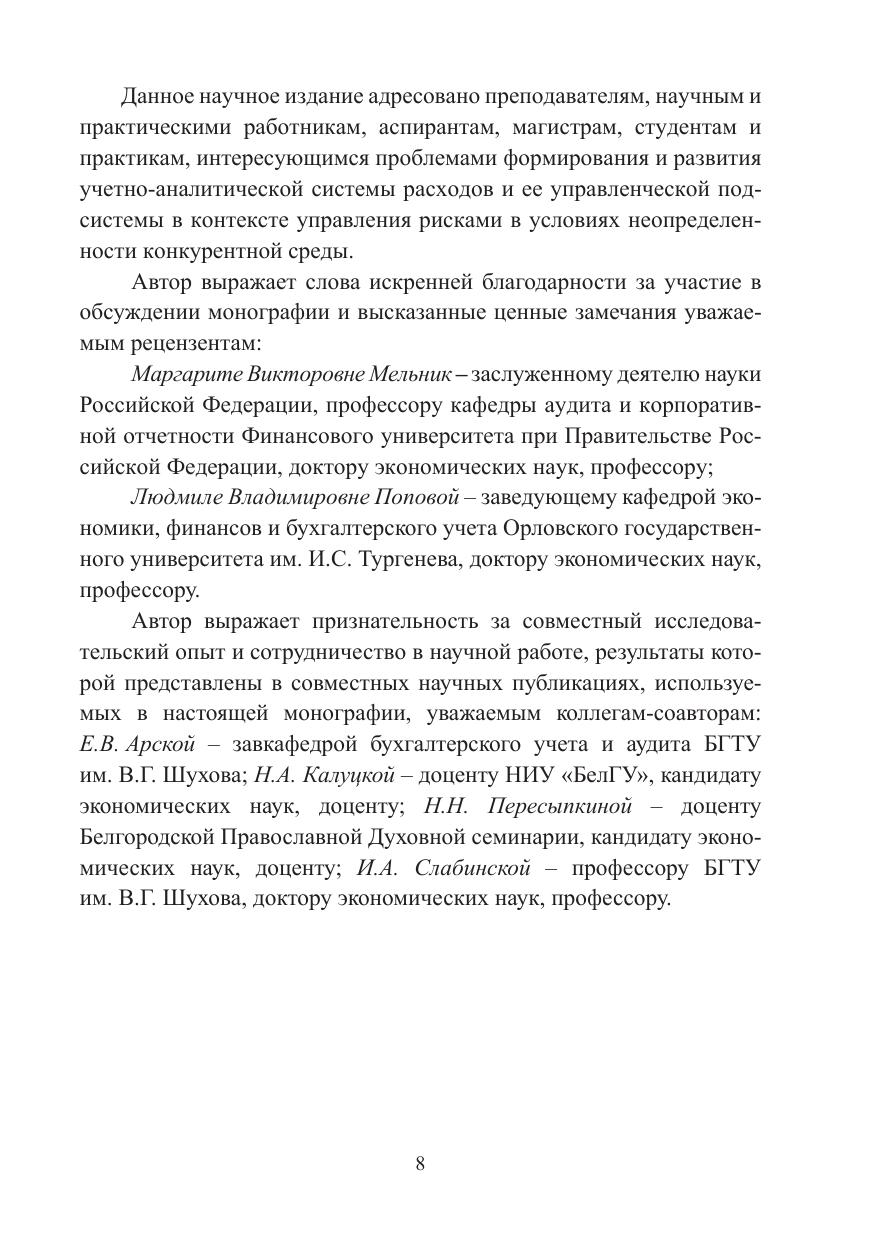 Монография может быть полезной преподавателям, научным и практическими работникам, аспирантам, магистрам, студентам, другим исследователям и практикам, интересующимся проблемами формирования и развития учетно-аналитической системы расходов и ее управленческой подсистемы в контексте управления рисками в условиях неопределенности конкурентной среды.