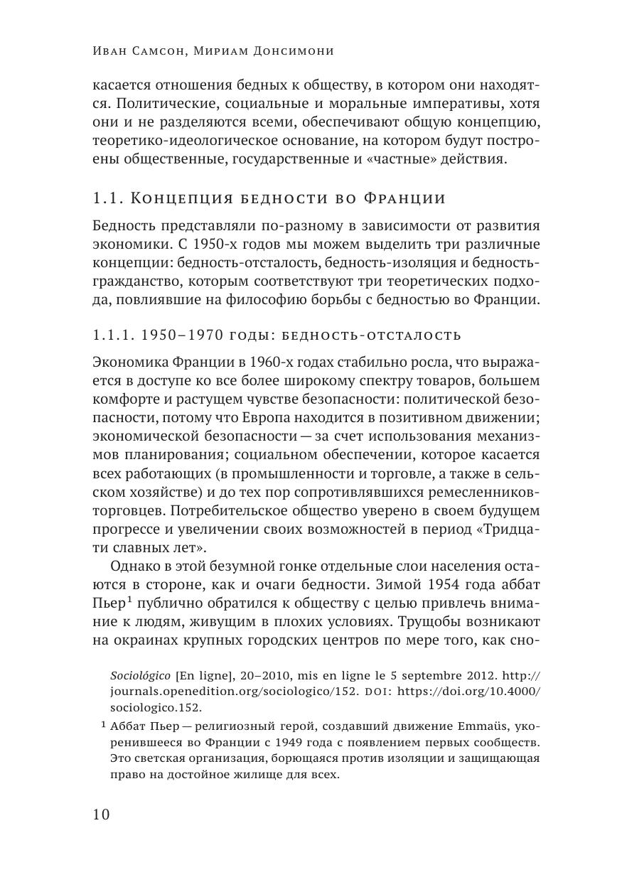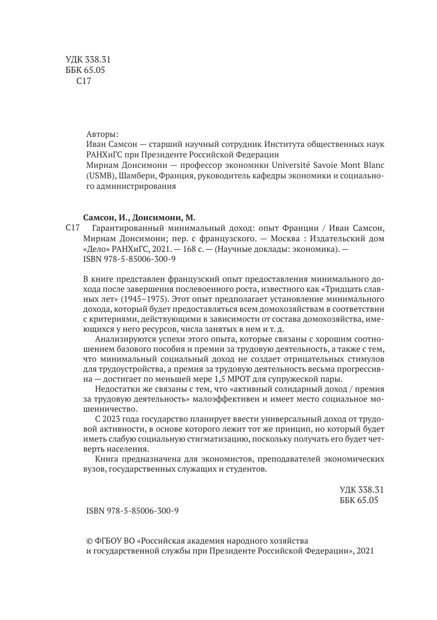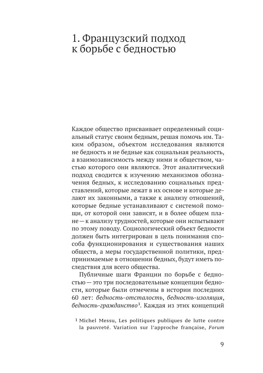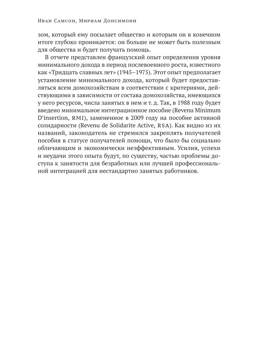 В книге представлен французский опыт предоставления минимального дохода после завершения послевоенного роста, известного как «Тридцать славных лет» (1945–1975). Этот опыт предполагает установление минимального дохода, который будет предоставляться всем домохозяйствам в соответствии с критериями, действующими в зависимости от состава домохозяйства, имеющихся у него ресурсов, числа занятых в нем и т. д.