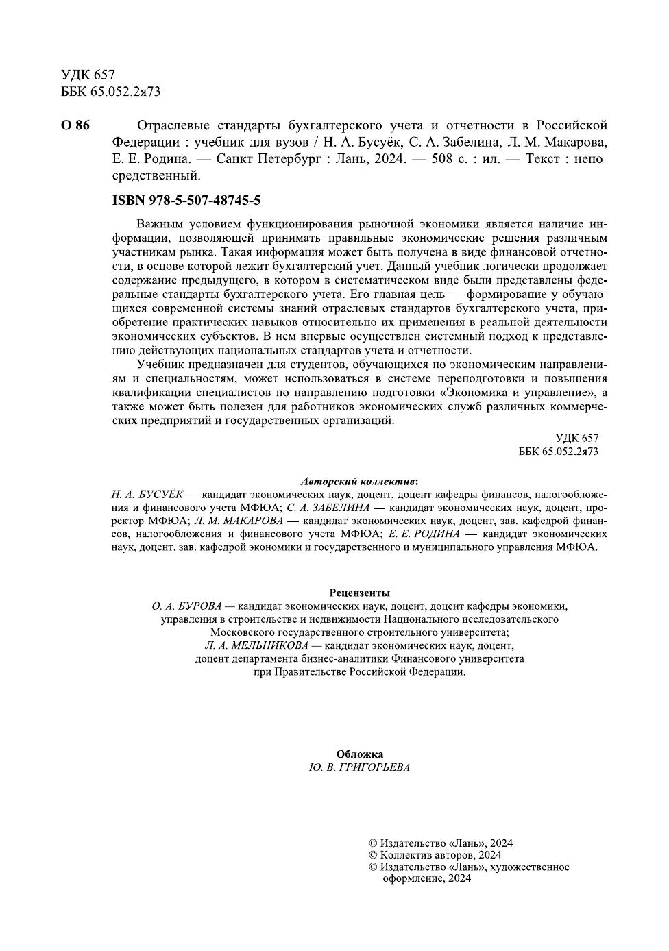Важным условием функционирования рыночной экономики является наличие инфор-мации, позволяющей принимать правильные экономические решения различным участни-кам рынка. Такая информация может быть получена в виде финансовой отчетности, в ос-нове которой лежит бухгалтерский учет. Данный учебник логически продолжает содержа-ние предыдущего, в котором в систематическом виде были представлены федеральные стандарты бухгалтерского учета. Его главная цель — формирование у обучающихся со-временной системы знаний отраслевых стандартов бухгалтерского учета, приобретение практических навыков относительно их применения в реальной деятельности экономиче-ских субъектов. В нем впервые осуществлен системный подход к представлению действу-ющих национальных стандартов учета и отчетности. Учебник предназначен для студентов, обучающихся по экономическим направлениям и специальностям, может использоваться в системе переподготовки и повышения квали-фикации специалистов по направлению подготовки «Экономика и управление», а также может быть полезен для работников экономических служб различных коммерческих пред-приятий и государственных организаций