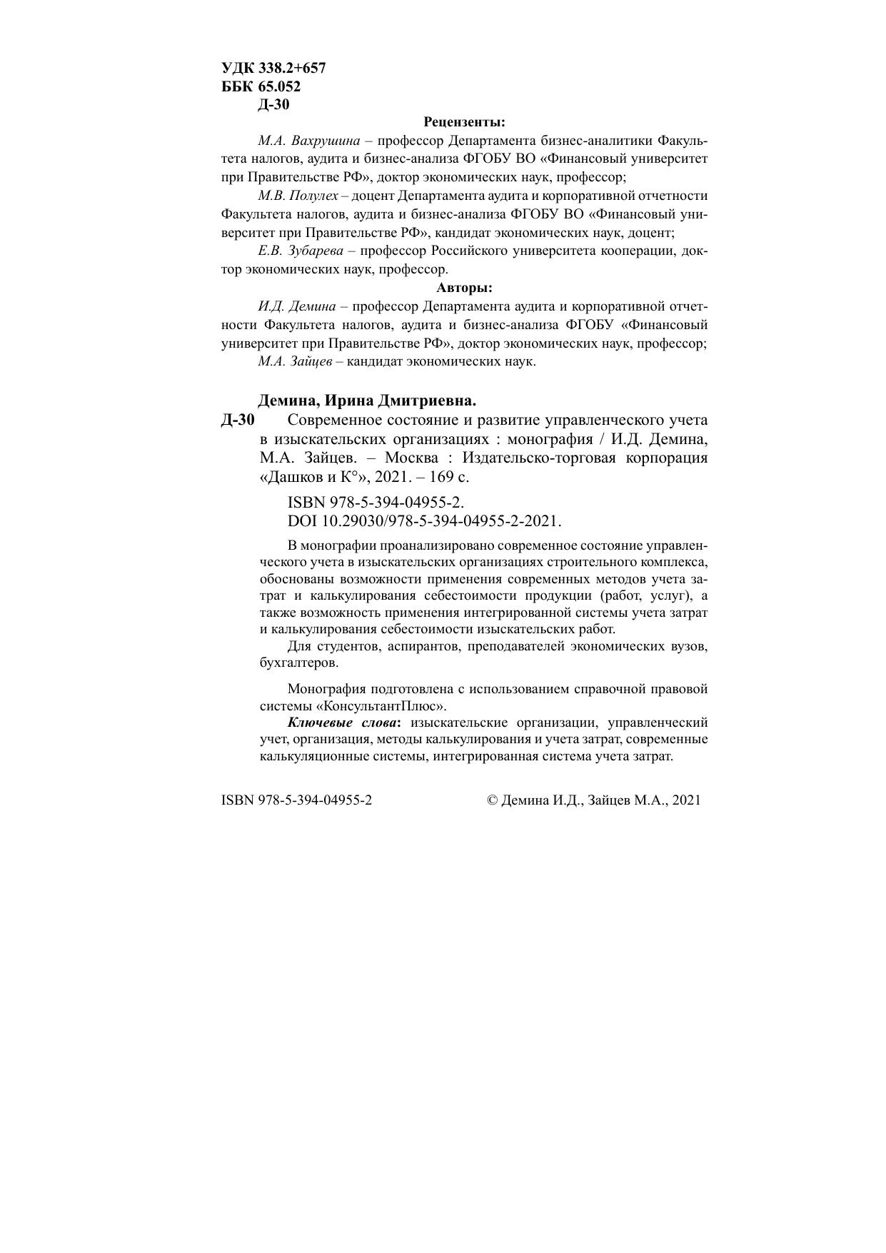 Монография подготовлена с использованием справочной правовой системы «КонсультантПлюс» Ключевые слова: изыскательские организации, управленческий учет, организация, методы калькулирования и учета затрат, современные калькуляционные системы, интегрированная система учета затрат.