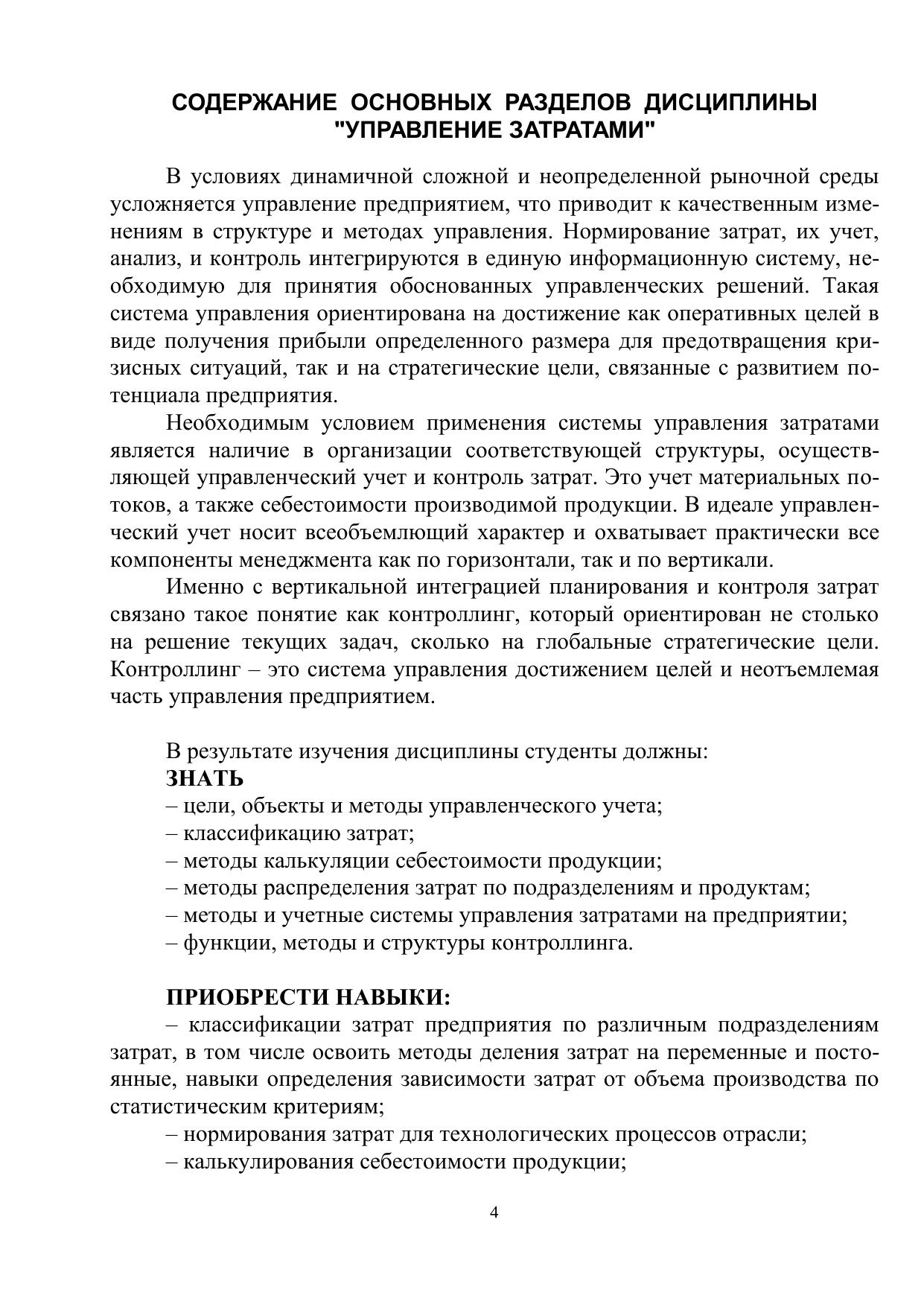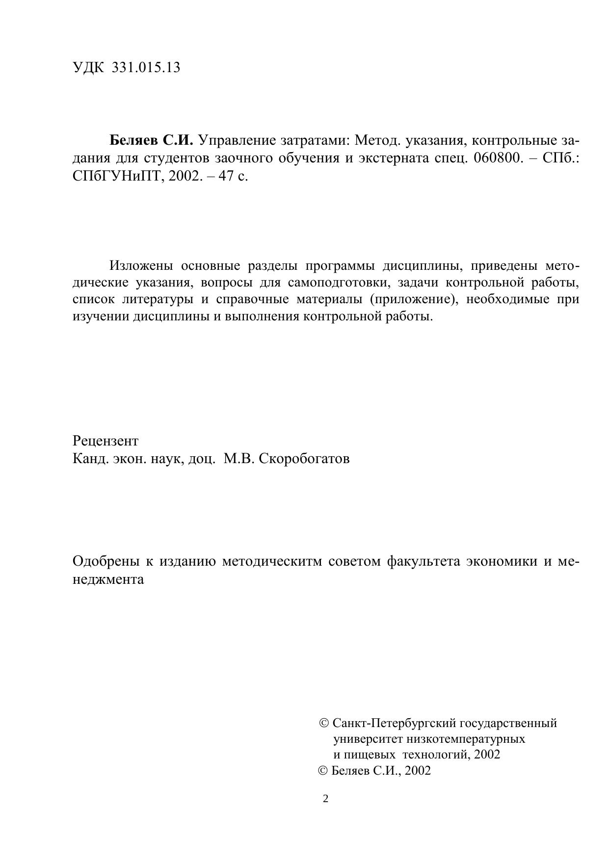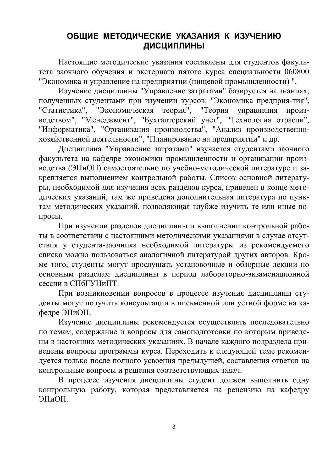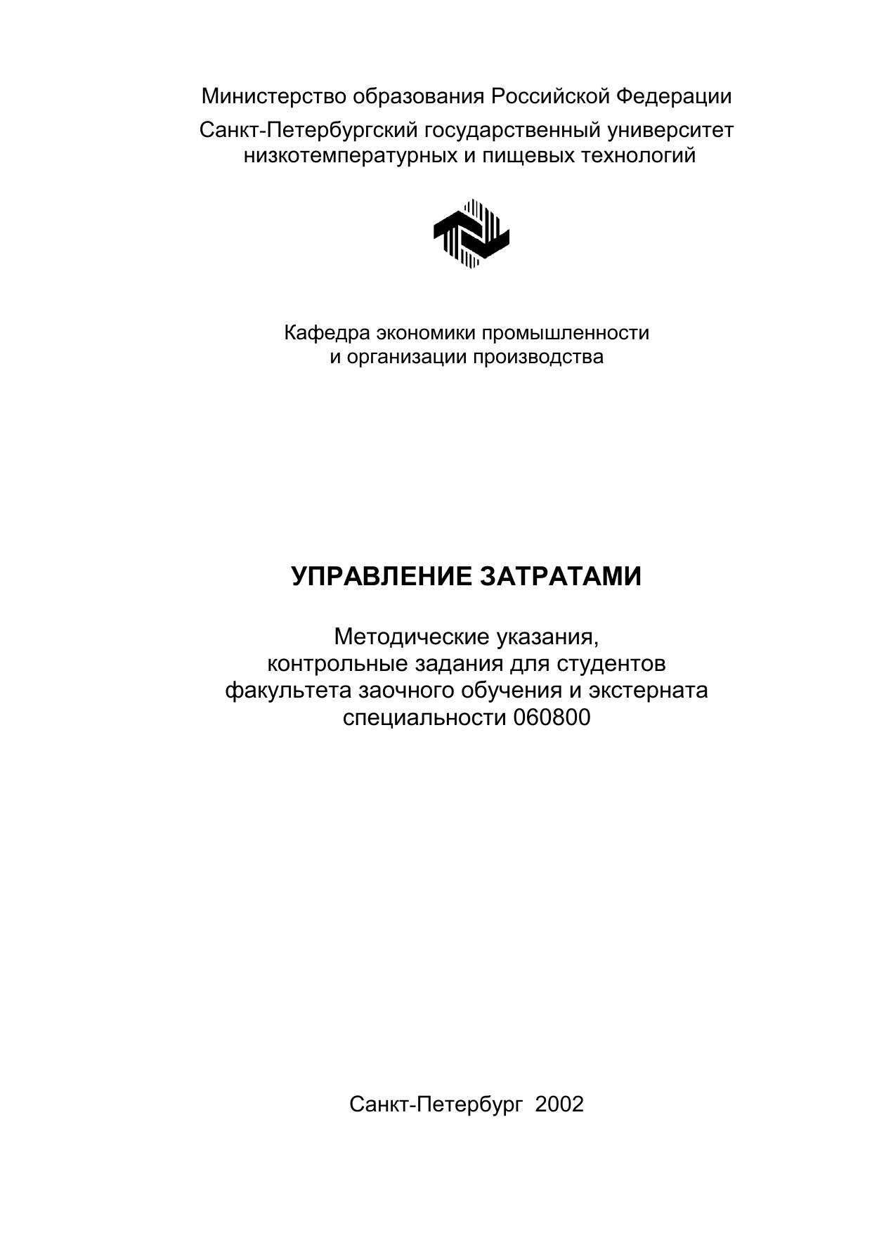 Управление затратами: Методические указания, контрольные задания для студентов заочного обучения и экстерната специальности 060800