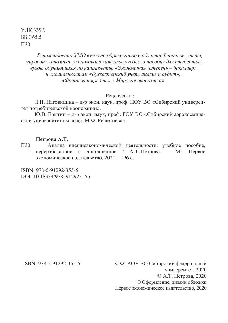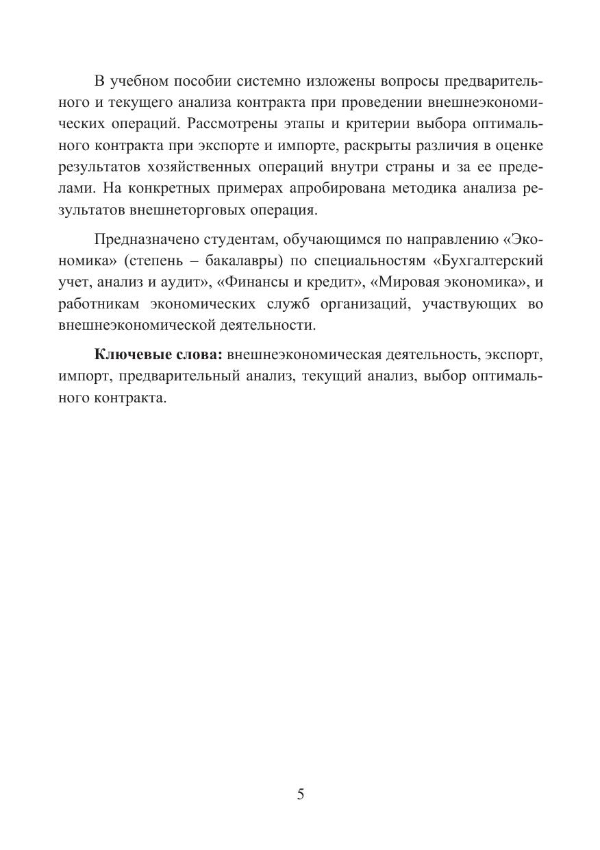 В учебном пособии системно изложены вопросы предварительного и текущего анализа контракта при проведении внешнеэкономических операций. Рассмотрены этапы и критерии выбора оптимального контракта при экспорте и импорте, раскрыты различия в оценке результатов хозяйственных операций внутри страны и за ее пределами. На конкретных примерах апробирована методика анализа результатов внешнеторговых операция. Предназначено студентам, обучающимся по направлении «Экономика» (степень- бакалавры) специальностям «Бухгалтерский учет, анализ и аудит», «Финансы и кредит», Мировая экономика» и работникам экономических служб организаций, участвующих во внешнеэкономической деятельности.