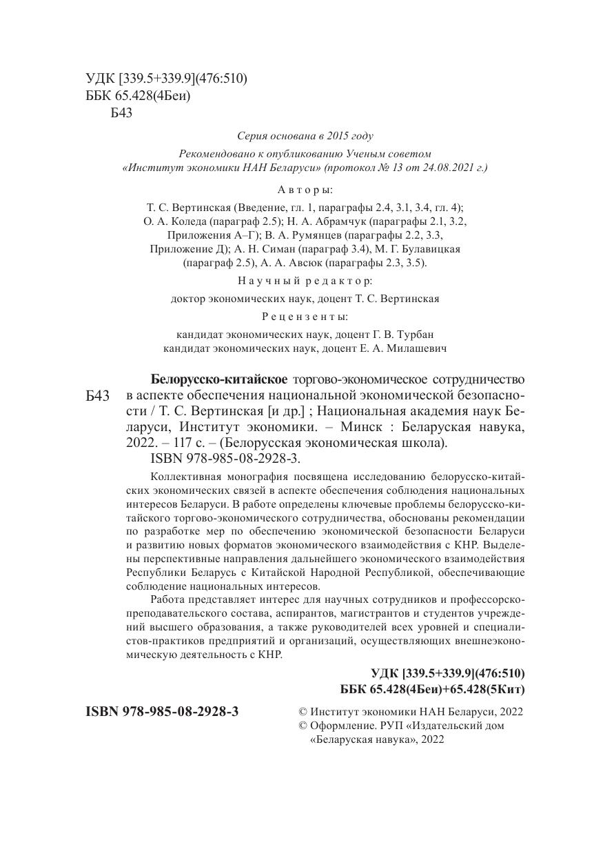 Коллективная монография посвящена исследованию белорусско-китайских экономических связей в аспекте обеспечения соблюдения национальных интересов Беларуси. В работе определены ключевые проблемы белорусско-китайского торгово-экономического сотрудничества, обоснованы рекомендации по разработке мер по обеспечению экономической безопасности Беларуси и развитию новых форматов экономического взаимодействия с КНР. Выделены перспективные направления дальнейшего экономического взаимодействия Республики Беларусь с Китайской Народной Республикой, обеспечивающие соблюдение национальных интересов. Работа представляет интерес для научных сотрудников и профессорско-преподавательского состава, аспирантов, магистрантов и студентов учреждений высшего образования, а также руководителей всех уровней и специалистов-практиков предприятий и организаций, осуществляющих внешнеэкономическую деятельность с КНР.