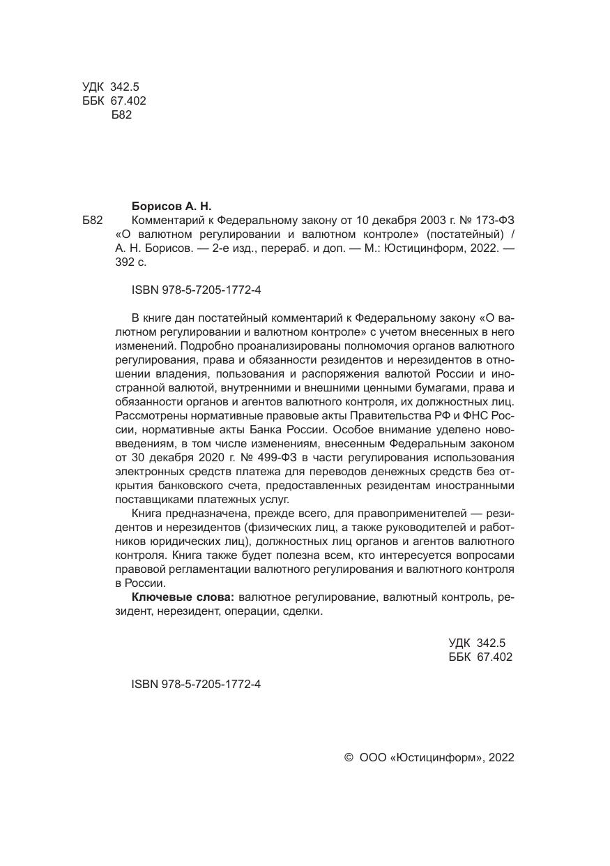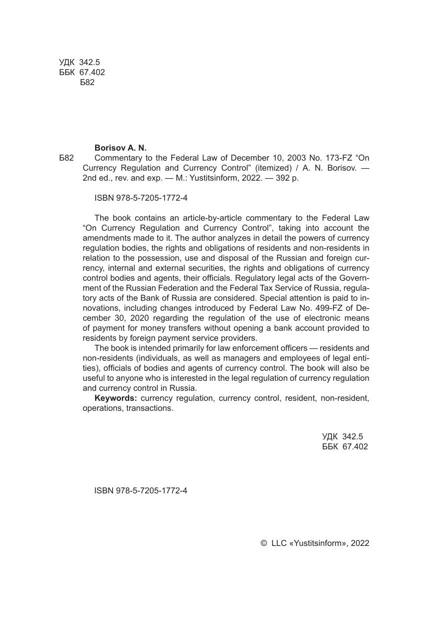 В книге дан постатейный комментарий к Федеральному закону «О валютном регулировании и валютном контроле» с учетом внесенных в него изменений. Подробно проанализированы полномочия органов валютного регулирования, права и обязанности резидентов и нерезидентов в отношении владения, пользования и распоряжения валютой России и иностранной валютой, внутренними и внешними ценными бумагами, права и обязанности органов и агентов валютного контроля, их должностных лиц. Рассмотрены нормативные правовые акты Правительства РФ и ФНС России, нормативные акты Банка России. Особое внимание уделено нововведениям, в том числе изменениям, внесенным Федеральным законом от 30 декабря 2020 г. № 499-ФЗ в части регулирования использования электронных средств платежа для переводов денежных средств без открытия банковского счета, предоставленных резидентам иностранными поставщиками платежных услуг. Книга предназначена, прежде всего, для правоприменителей — резидентов и нерезидентов (физических лиц, а также руководителей и работников юридических лиц), должностных лиц органов и агентов валютного контроля. Книга также будет полезна всем, кто интересуется вопросами правовой регламентации валютного регулирования и валютного контроля в России.