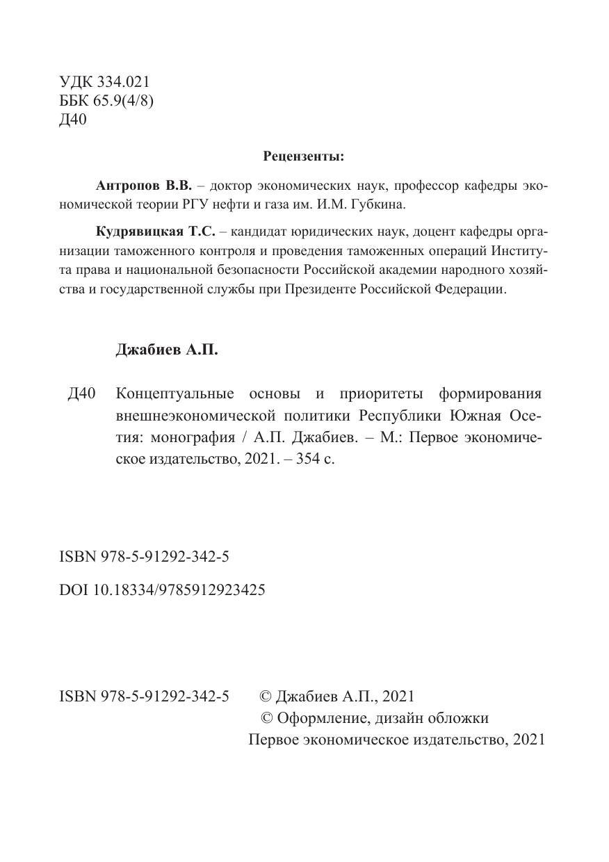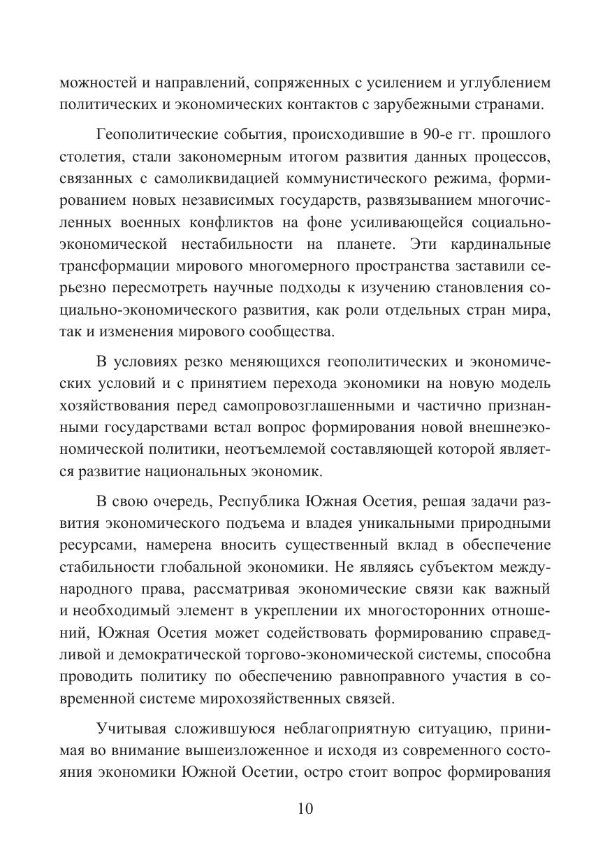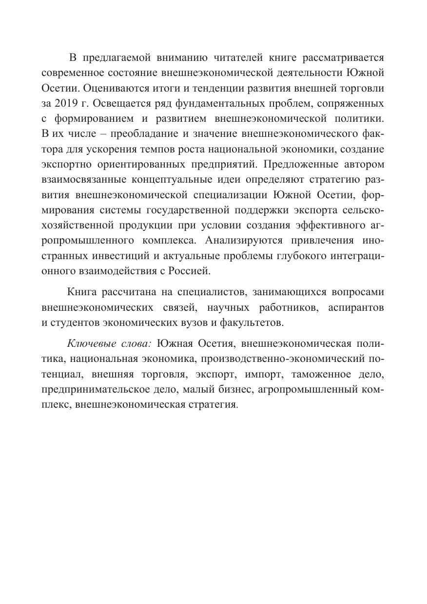В предлагаемой вниманию читателей книге рассматривается современное состояние внешнеэкономической деятельности Южной Осетии. Оцениваются итоги и тенденции развития внешней торговли за 2019 г. Освещается ряд фундаментальных проблем, сопряженных с формированием и развитием внешнеэкономической политики. В их числе – преобладание и значение внешнеэкономического фактора для ускорения темпов роста национальной экономики, создание экспортно ориентированных предприятий. Предложенные автором взаимосвязанные концептуальные идеи определяют стратегию развития внешнеэкономической специализации Южной Осетии, формирования системы государственной поддержки экспорта сельскохозяй-ственной продукции при условии создания эффективного агропромышленного комплекса. Анализируются привлечения иностранных инвестиций и актуальные проблемы глубокого интеграционного взаимодействия с Россией.