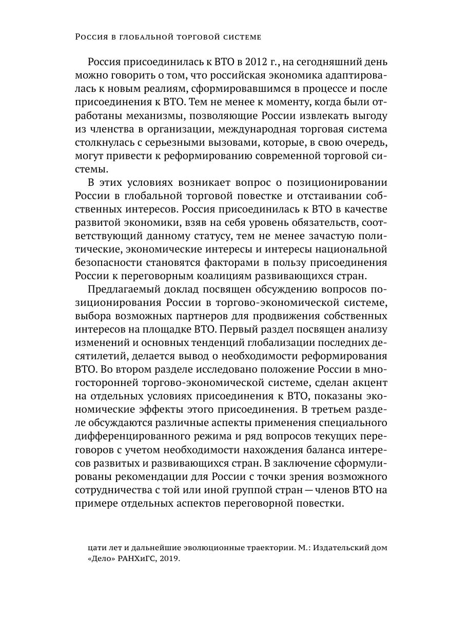 В докладе анализируются тенденции развития мировой экономики, обусловившие тематику и ход переговоров на площадке ВТО, а также формирование запроса на реформирование многосторонней торговой системы. В качестве одной из основных причин указывается смещение баланса сил в сторону развивающихся стран при неизменности действующих правил глобального торгово-экономического взаимодействия. Россия как член ВТО со статусом «развитая экономика» только адаптировалась к правилам и начала извлекать первые выгоды от членства в организации. В докладе рассмотрены условия присоединения России к ВТО и дана оценка результатам членства за последние семь лет. Отдельно проанализированы предложения по развитию повестки отдельных переговорных треков, таких как вопросы специального и дифференцированного режима, электронной коммерции, представления нотификаций, торговли услугами. Рассмотрен вопрос о выборе блока союзников с целью продвижения национальных экономических интересов на глобальном уровне. Показано, что, несмотря на статус развитого члена ВТО, по отдельным вопросам регулирования интересы России сходятся с развивающимися странами.