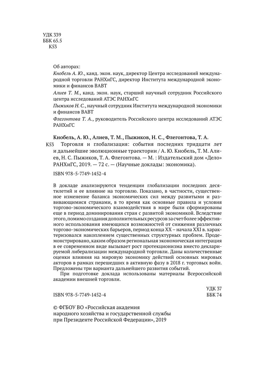 В докладе анализируются тенденции глобализации последних десятилетий и ее влияние на торговлю. Показано, в частности, существенное изменение баланса экономических сил между развитыми и развивающимися странами, в то время как основные правила и условия торгово-экономического взаимодействия в мире были сформированы еще в период доминирования стран с развитой экономикой. Вследствие этого, помимо создания дополнительных ресурсов за счет более эффективного использования имеющихся возможностей от снижения различных торгово-экономических барьеров, период конца XX – начала XXI в. характеризовался накоплением существенных структурных проблем. Продемонстрировано, каким образом региональная экономическая интеграция в ее современном виде вызывает рост протекционизма вместо декларируемой либерализации международной торговли. Даны количественные оценки влияния на мировую экономику действий основных мировых акторов в рамках перешедших в активную фазу в 2018 г. торговых войн. Предложены три варианта дальнейшего развития событий. При подготовке доклада использованы материалы Всероссийской академии внешней торговли.