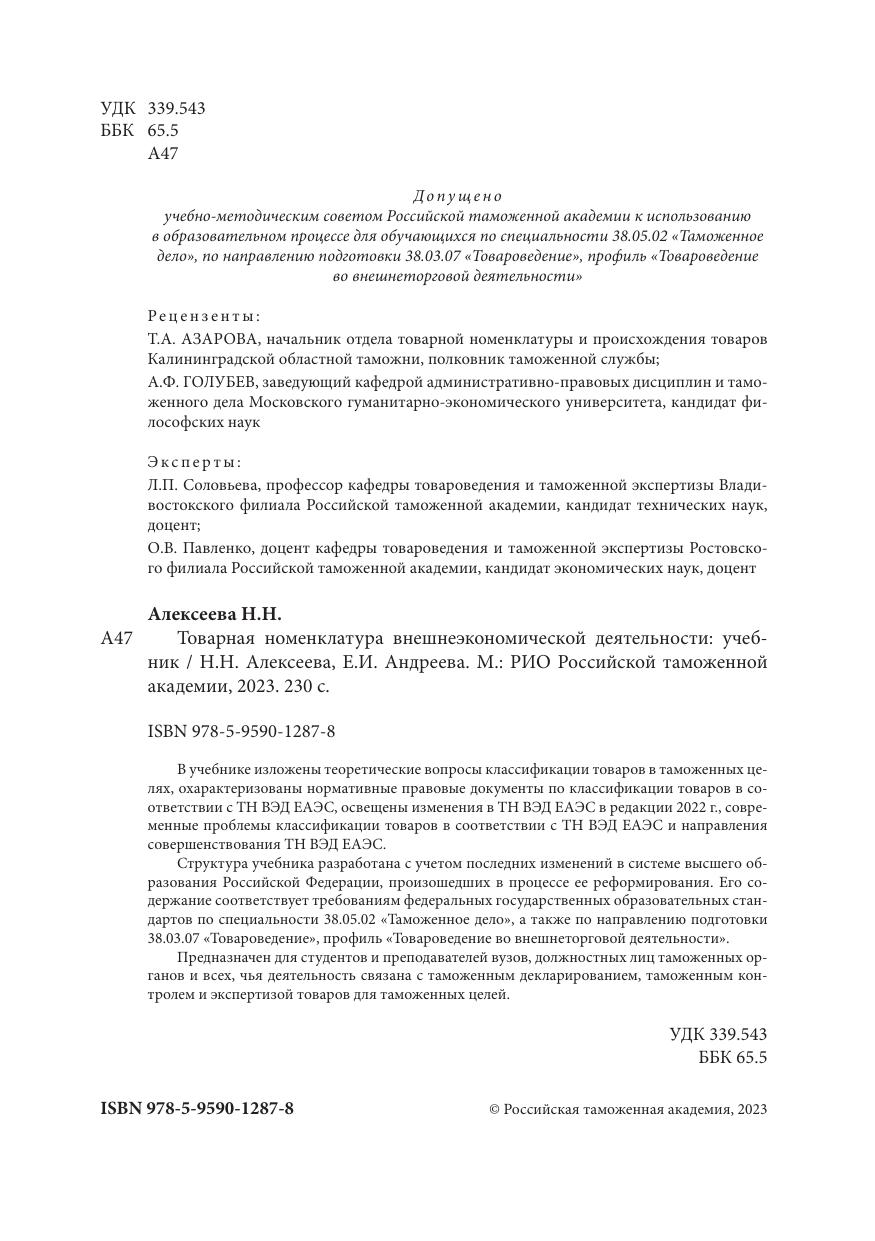 В учебнике изложены теоретические вопросы классификации товаров в таможенных целях, охарактеризованы нормативные правовые документы по классификации товаров в соответствии с ТН ВЭД ЕАЭС, освещены изменения в ТН ВЭД ЕАЭС в редакции 2022 г., современные проблемы классификации товаров в соответствии с ТН ВЭД ЕАЭС и направления совершенствования ТН ВЭД ЕАЭС.