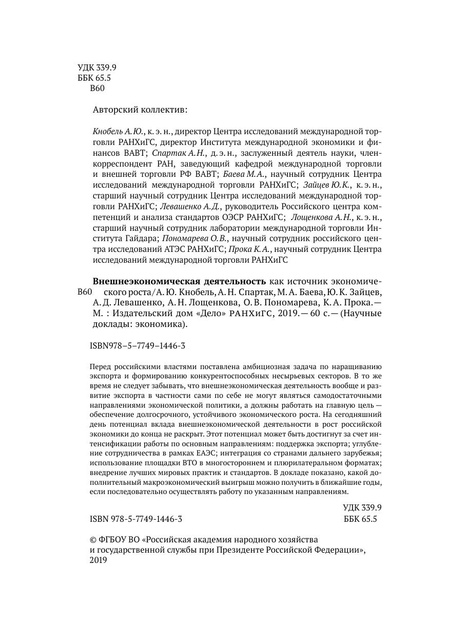 Перед российскими властями поставлена амбициозная задача по наращиванию экспорта и формированию конкурентоспособных несырьевых секторов. В то же время не следует забывать, что внешнеэкономическая деятельность вообще и развитие экспорта в частности сами по себе не могут являться самодостаточными направлениями экономической политики, а должны работать на главную цель — обеспечение долгосрочного, устойчивого экономического роста. На сегодняшний день потенциал вклада внешнеэкономической деятельности в рост российской экономики до конца не раскрыт. Этот потенциал может быть достигнут за счет интенсификации работы по основным направлениям: поддержка экспорта, углубление сотрудничества в рамках ЕАЭС, интеграция со странами дальнего зарубежья, использование площадки ВТО в многостороннем и плюрилатеральном форматах, внедрение лучших мировых практик и стандартов. В докладе показано, какой дополнительный макроэкономический выигрыш можно получить в ближайшие годы, если последовательно осуществлять работу по указанным направлениям.