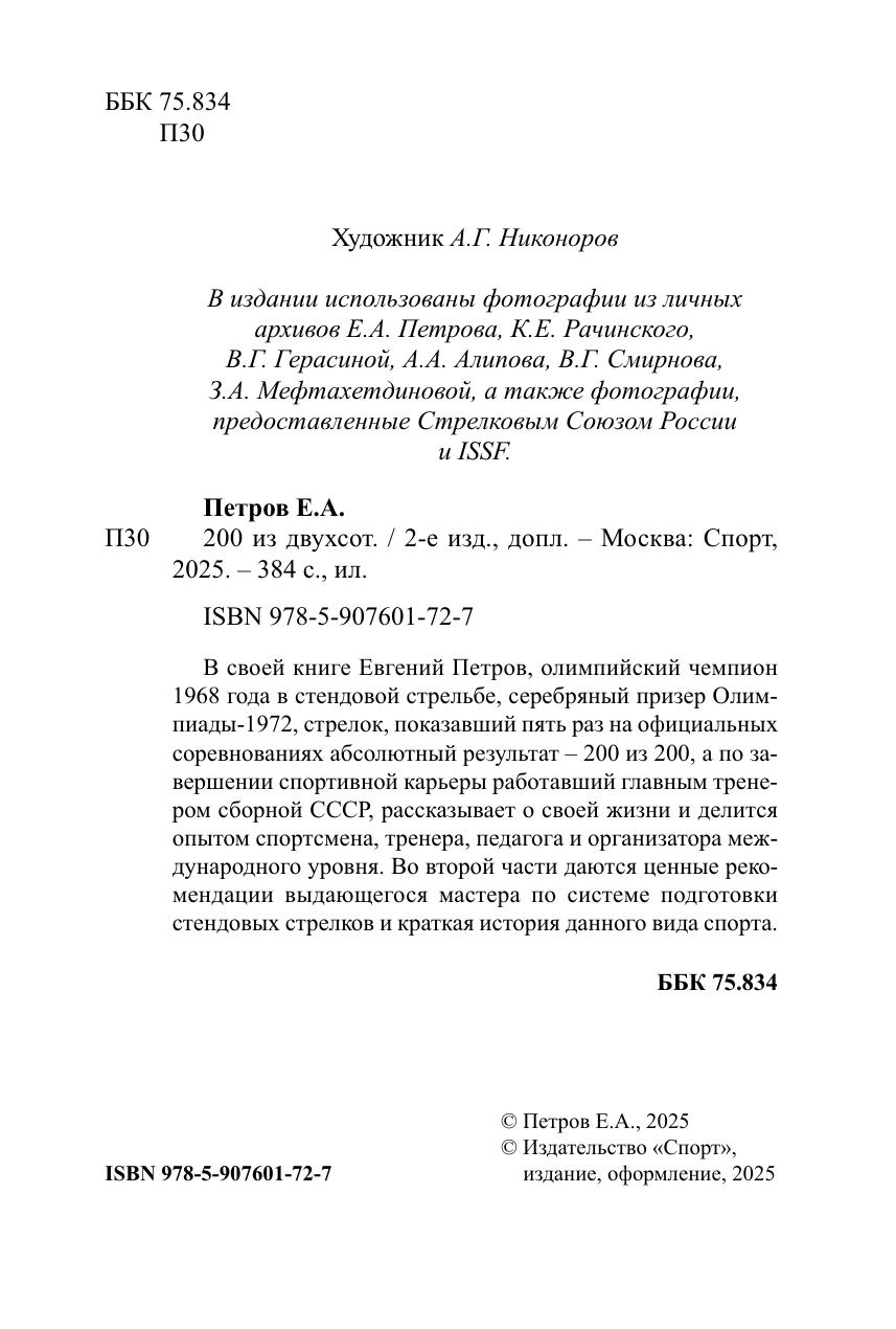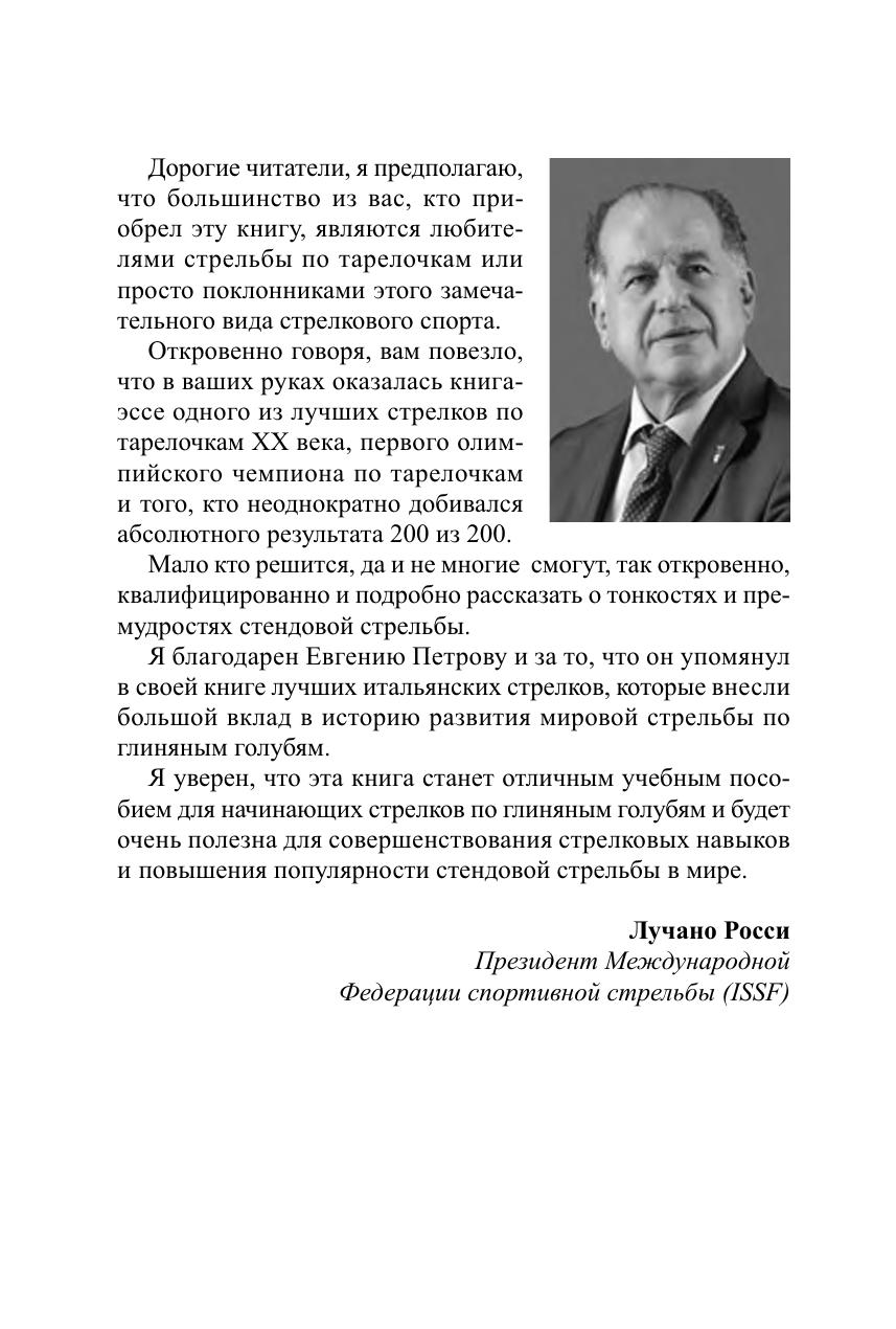 В своей книге Евгений Петров, олимпийский чемпион 1968 года в стендовой стрельбе, серебряный призер Олимпиады-1972, стрелок, показавший пять раз на официальных соревнованиях абсолютный результат – 200 из 200, а по завершении спортивной карьеры работавший главным тренером сборной СССР, рассказывает о своей жизни и делится опытом спортсмена, тренера, педагога и организатора международного уровня. Во второй части даются ценные рекомендации выдающегося мастера по системе подготовки стендовых стрелков и краткая история данного вида спорта.