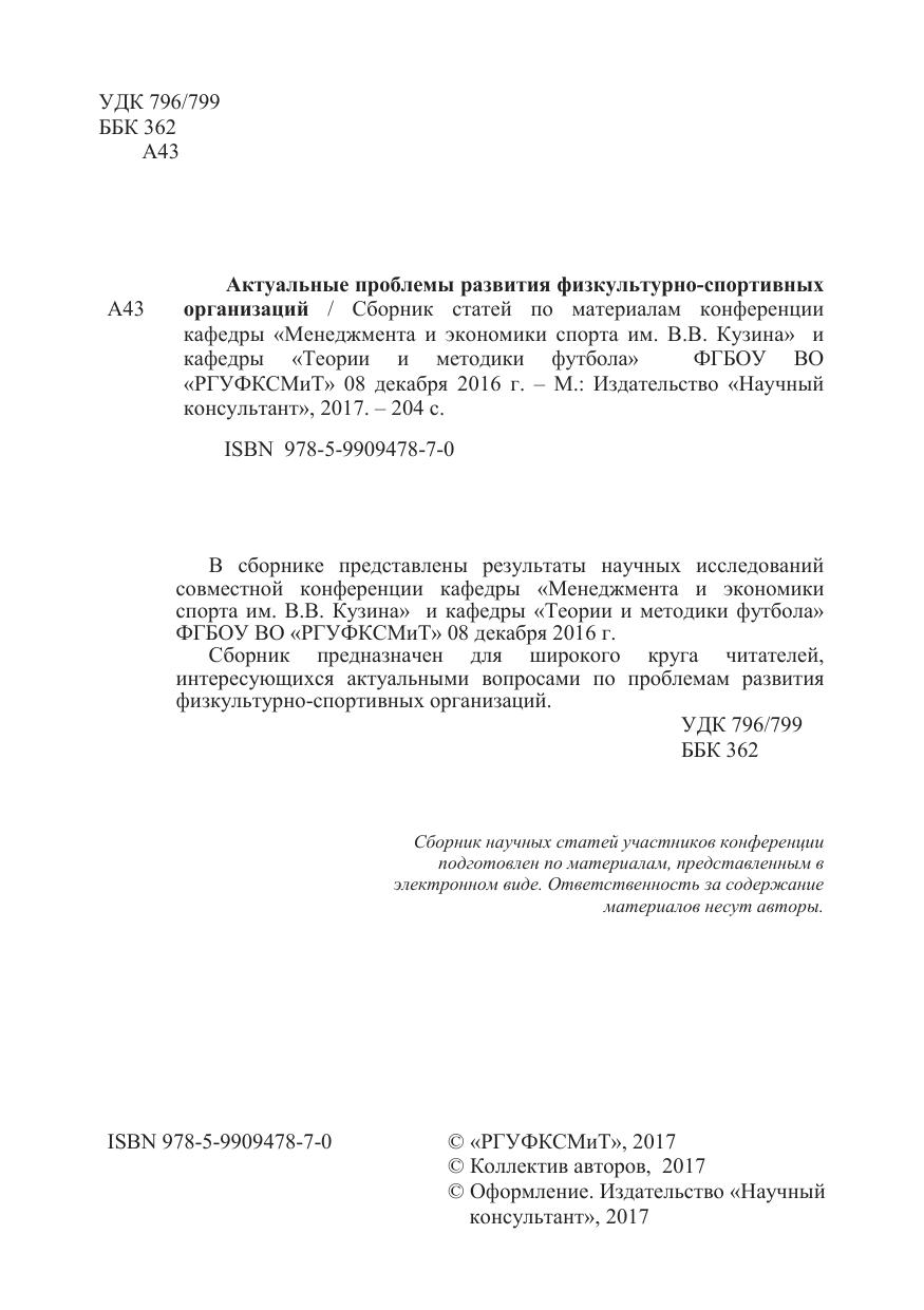В сборнике представлены результаты научных исследований совместной конференции кафедры «Менеджмента и экономики спорта им. В.В. Кузина» и кафедры «Теории и методики футбола» ФГБОУ ВО «РГУФКСМиТ» 08 декабря 2016 г.