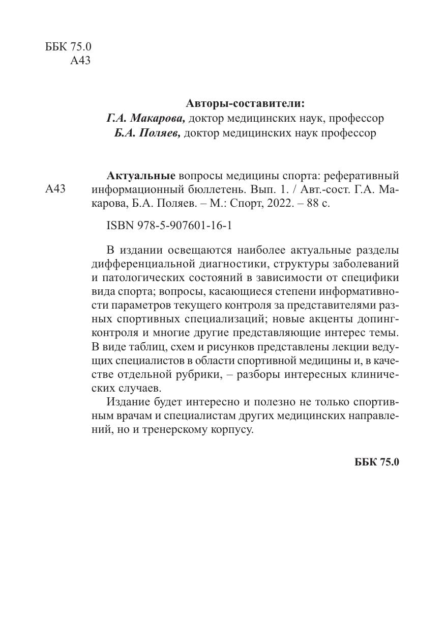 Актуальные вопросы медицины спорта. Выпуск № 1 Реферативный информационный бюллетень
