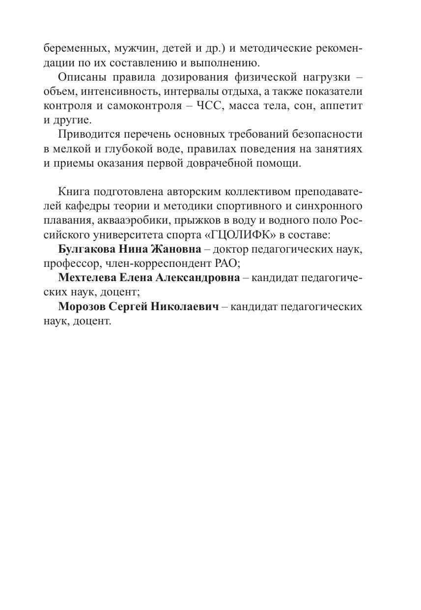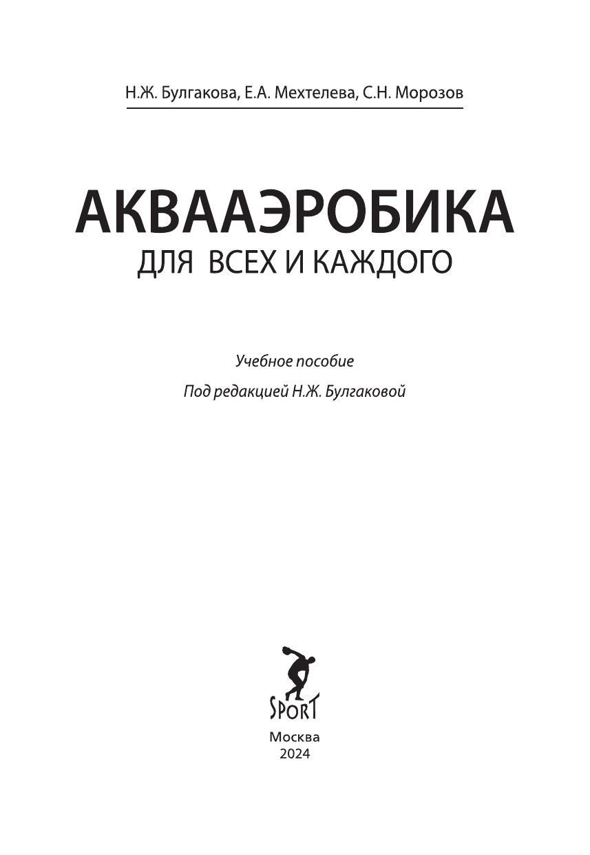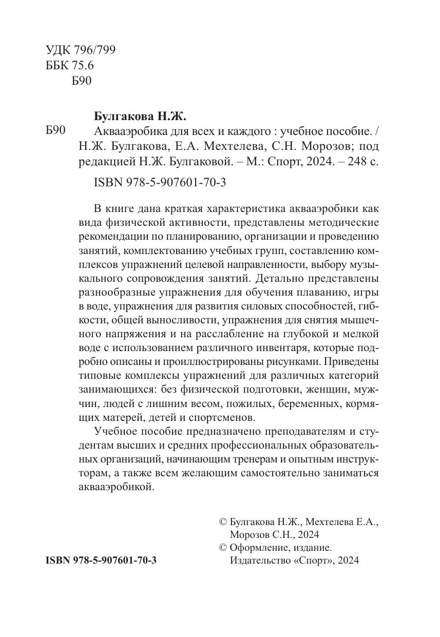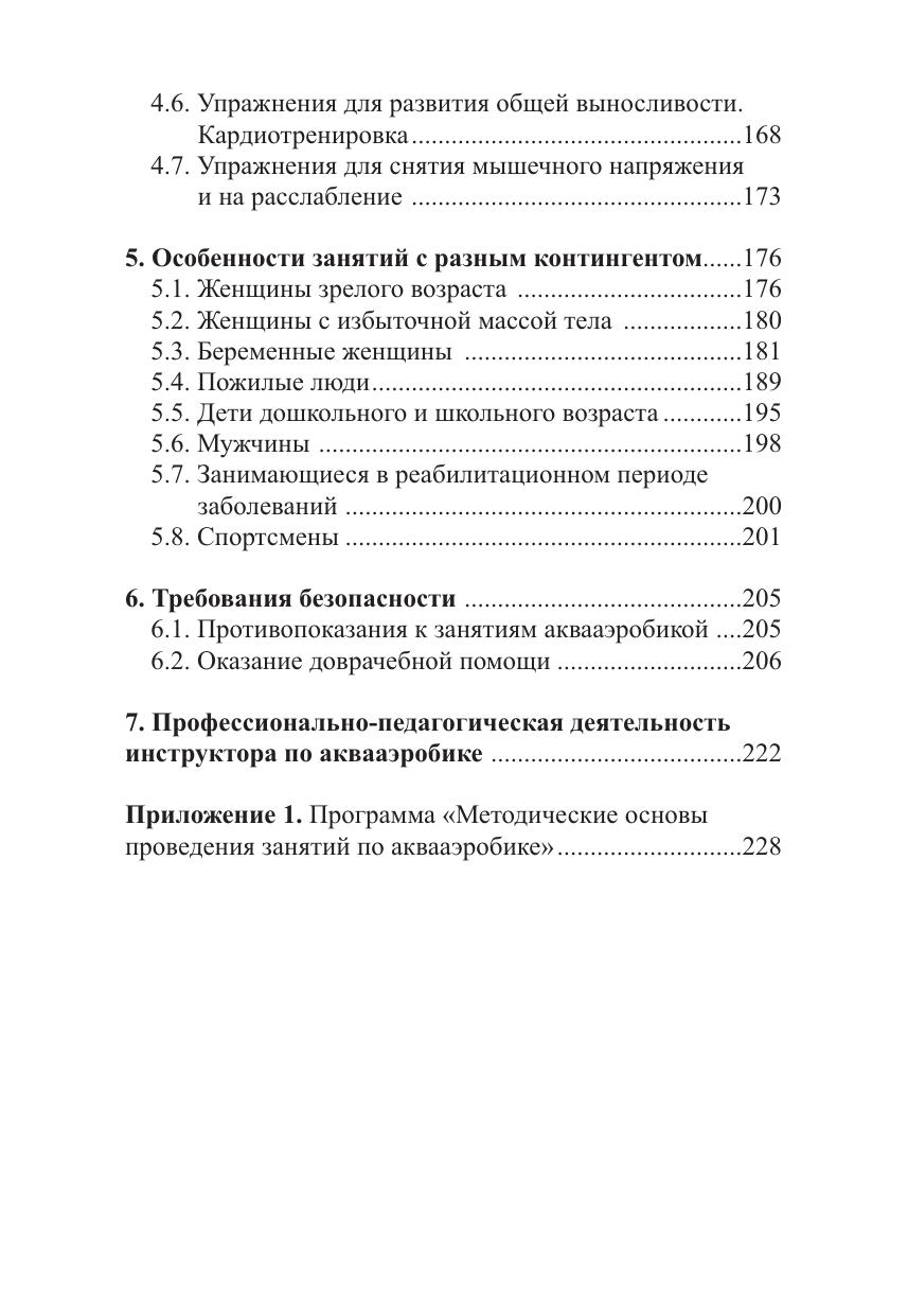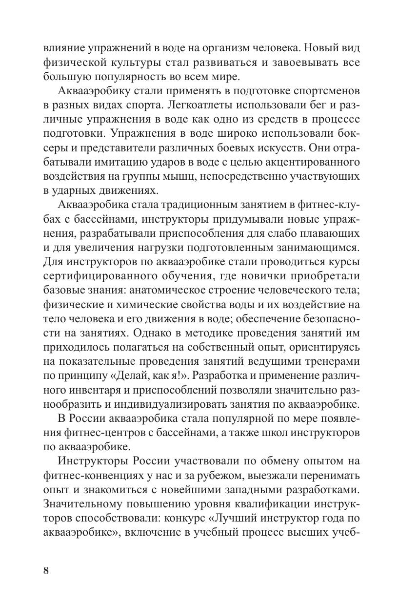 В книге дана краткая характеристика аквааэробики как вида физической активности, представлены методические рекомендации по планированию, организации и проведению занятий, комплектованию учебных групп, составлению комплексов упражнений целевой направленности, выбору музыкального сопровождения занятий. Детально представлены разнообразные упражнения для обучения плаванию, игры в воде, упражнения для развития силовых способностей, гибкости, общей выносливости, упражнения для снятия мышечного напряжения и на расслабление на глубокой и мелкой воде с использованием различного инвентаря, которые подробно описаны и проиллюстрированы рисунками. Приведены типовые комплексы упражнений для различных категорий занимающихся: без физической подготовки, женщин, мужчин, людей с лишним весом, пожилых, беременных, кормящих матерей, детей и спортсменов. Учебное пособие предназначено преподавателям и студентам высших и средних профессиональных образовательных организаций, начинающим тренерам и опытным инструкторам, а также всем желающим самостоятельно заниматься аквааэробикой.