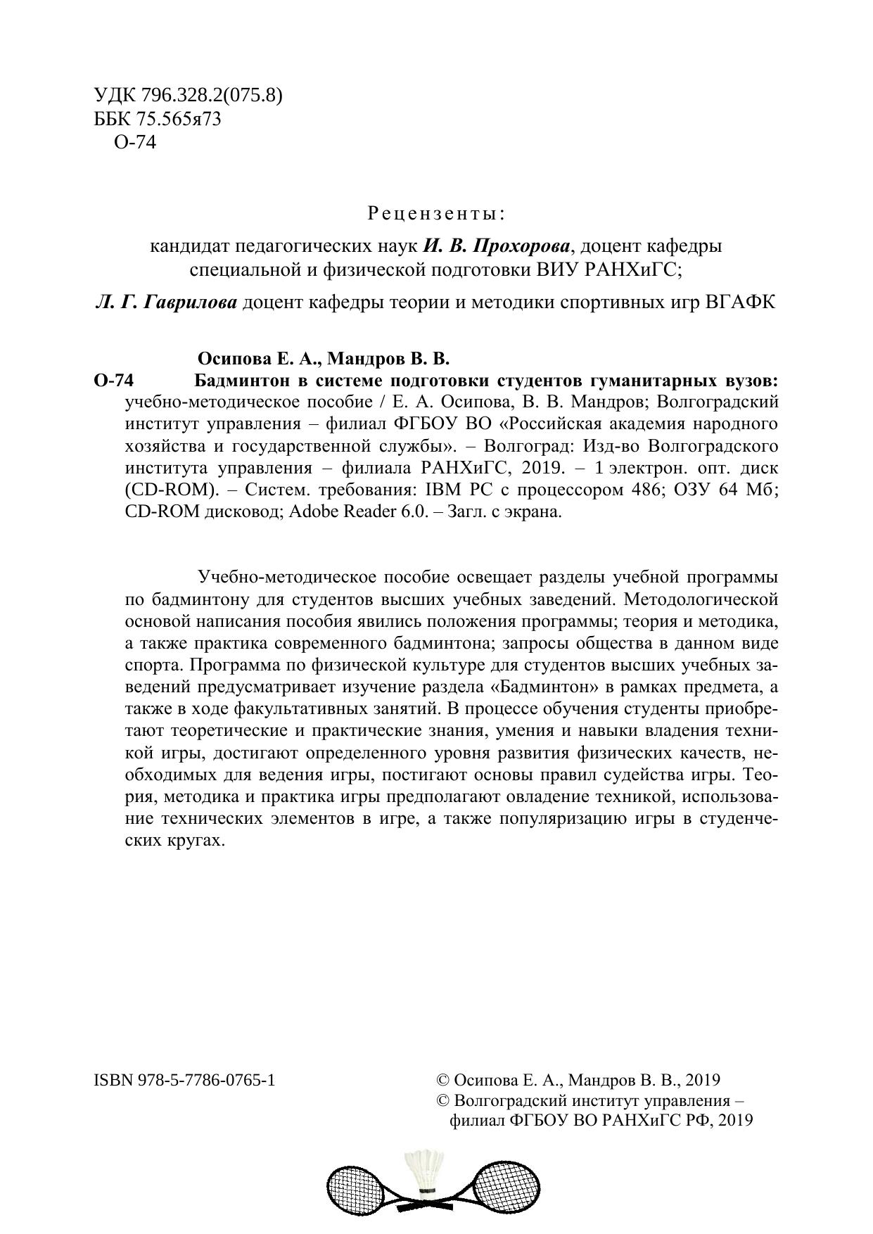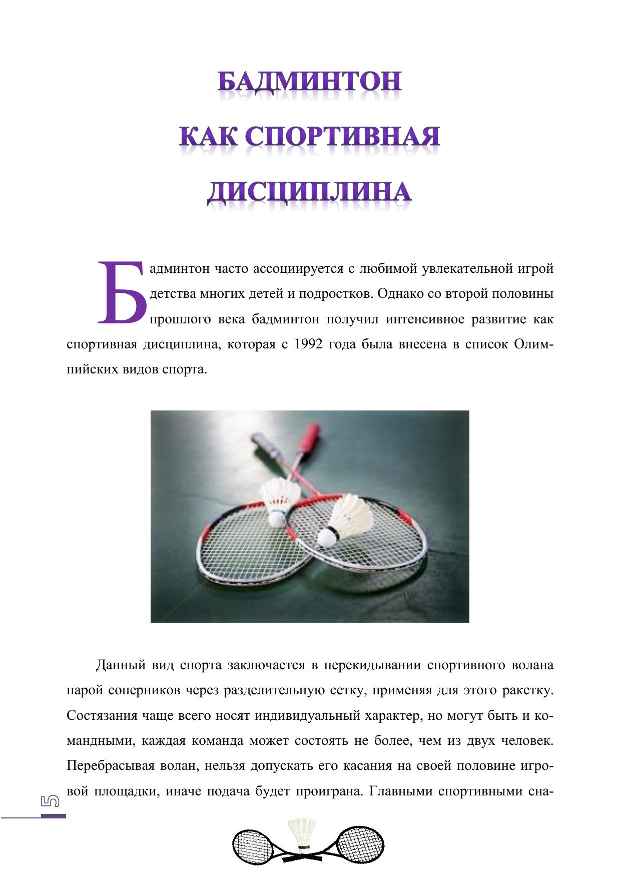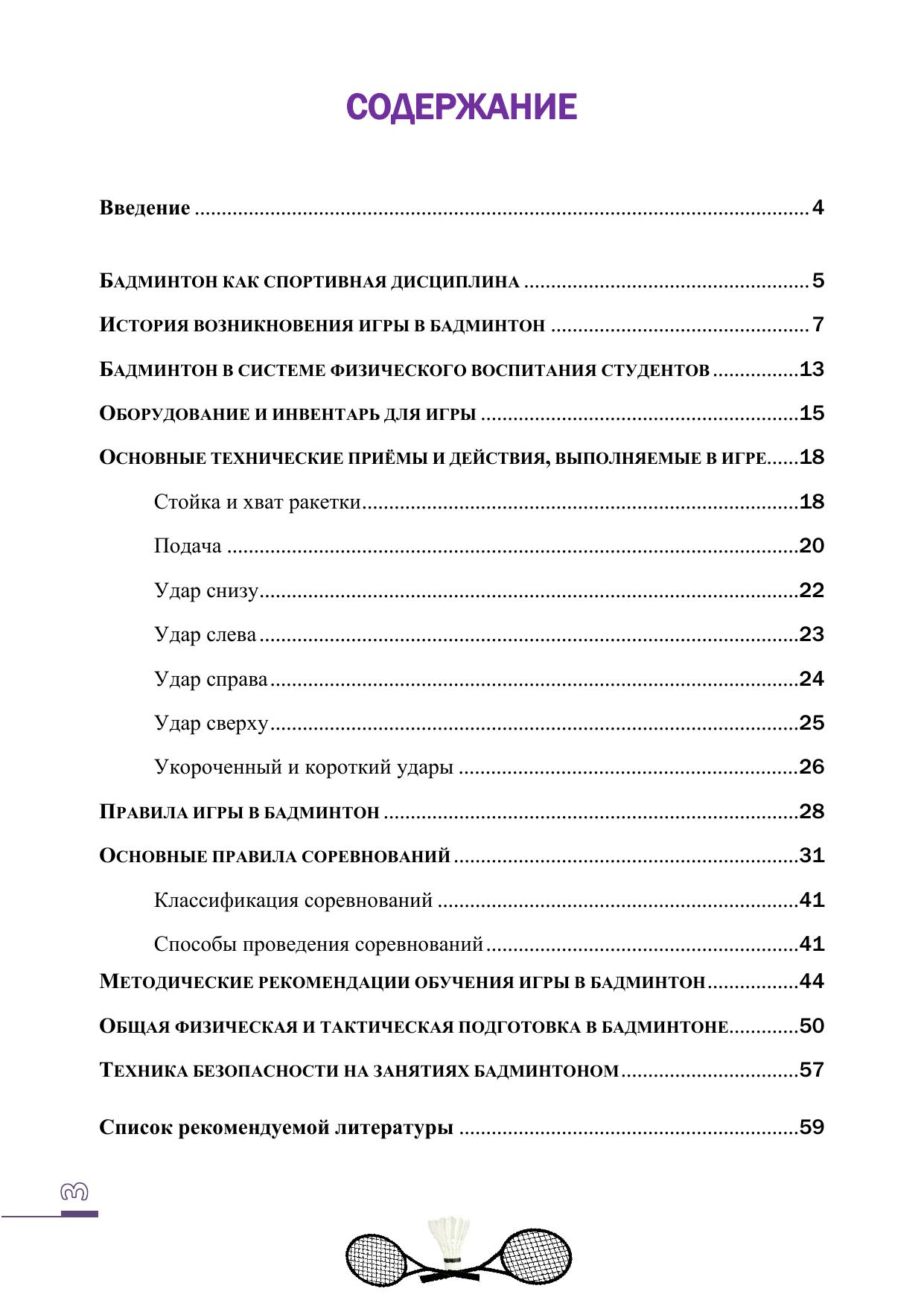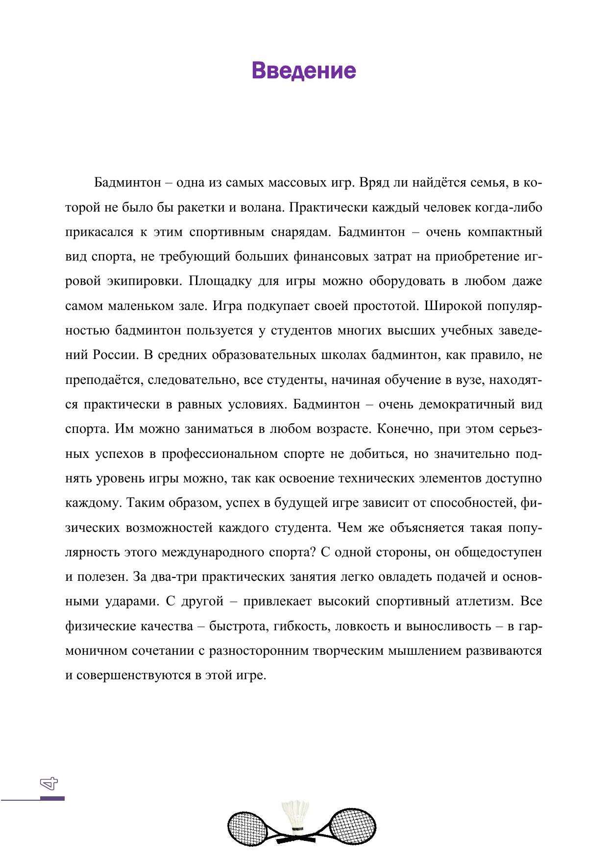 Учебно-методическое пособие освещает разделы учебной программы по бадминтону для студентов высших учебных заведений. Методологической основой написания пособия явились положения программы; теория и методика, а также практика современного бадминтона; запросы общества в данном виде спорта. Программа по физической культуре для студентов высших учебных за-ведений предусматривает изучение раздела «Бадминтон» в рамках предмета, а также в ходе факультативных занятий. В процессе обучения студенты приобре-тают теоретические и практические знания, умения и навыки владения техни-кой игры, достигают определенного уровня развития физических качеств, не-обходимых для ведения игры, постигают основы правил судейства игры. Тео-рия, методика и практика игры предполагают овладение техникой, использова-ние технических элементов в игре, а также популяризацию игры в студенче-ских кругах.
