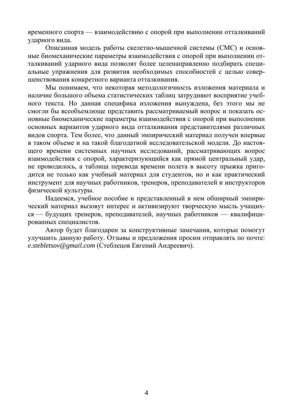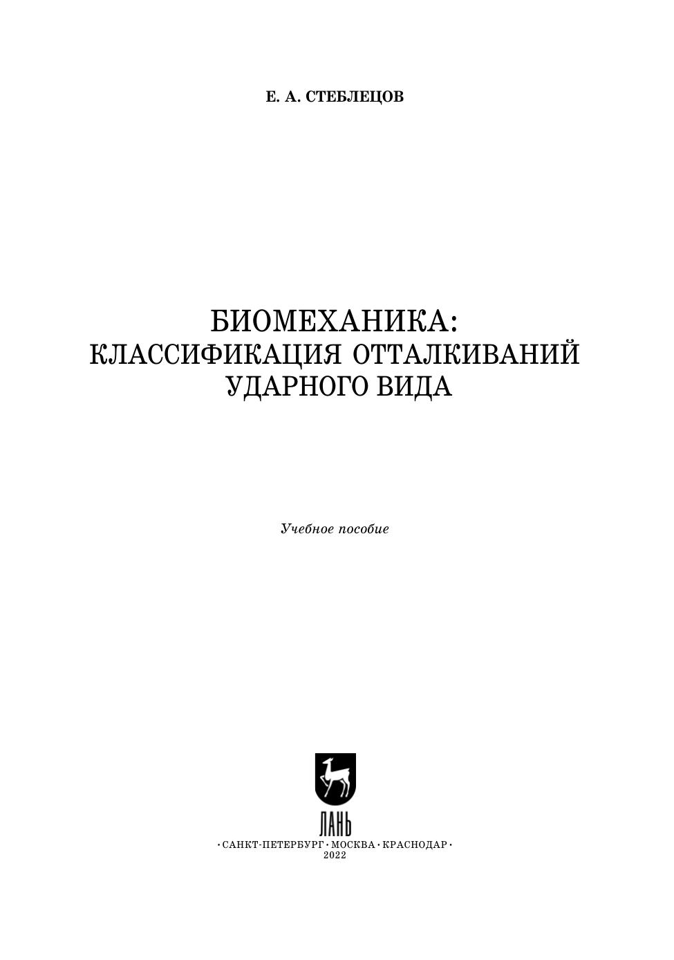 В учебном пособии рассматривается один из наиболее важных вопросов биомеханики опорного взаимодействия — отталкивания ударного вида. Подробно описывается динамическая структура опорного взаимодействия при выполнении основных видов отталкиваний ударного характера приводится их классификация и основные классификационные биомеханические признаки взаимодействия с опорой. Соответствует современным требованиям Федерального государственного образовательного стандарта среднего профессионального образования и профессиональным квалификационным требованиям. Учебное пособие «Биомеханика: классификация отталкиваний ударного вида» предназначено для учащихся учебных учреждений высшего образования по программам подготовки специалистов в соответствии с требованиями Федерального государственного образовательного стандарта высшего образования по специальностям «Физическая культура», «Спорт» и «Физическая культура для лиц с отклонениями в состоянии здоровья (адаптивная физическая культура)», а также для студентов специальности «Педагогическое образование» (профиль «Образование в области физической культуры и спорта») и аспирантов направления «Образование и педагогические науки» по научным специальностям «Физическая культура и профессиональная физическая подготовка», «Теория и методика спорта», «Оздоровительная и адаптивная физическая культура».