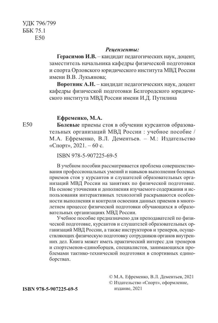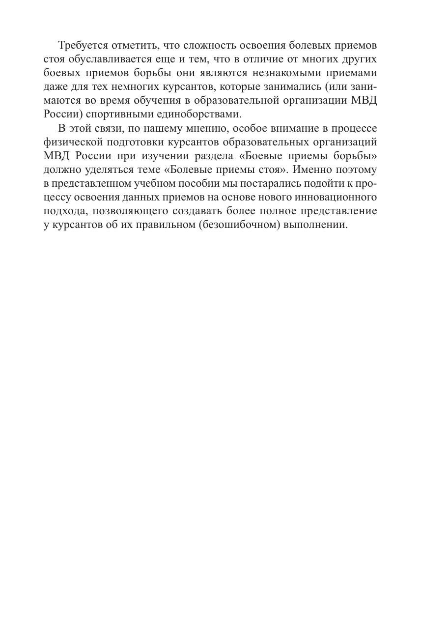 В учебном пособии рассматривается проблема совершенствования профессиональных умений и навыков выполнения болевых приемов стоя у курсантов и слушателей образовательных организаций МВД России на занятиях по физической подготовке. На основе уточнения и дополнения изучаемого содержания и использования интерактивных технологий раскрываются особенности выполнения и контроля освоения данных приемов в многолетнем процессе физической подготовки обучающихся в образовательных организациях МВД России.
