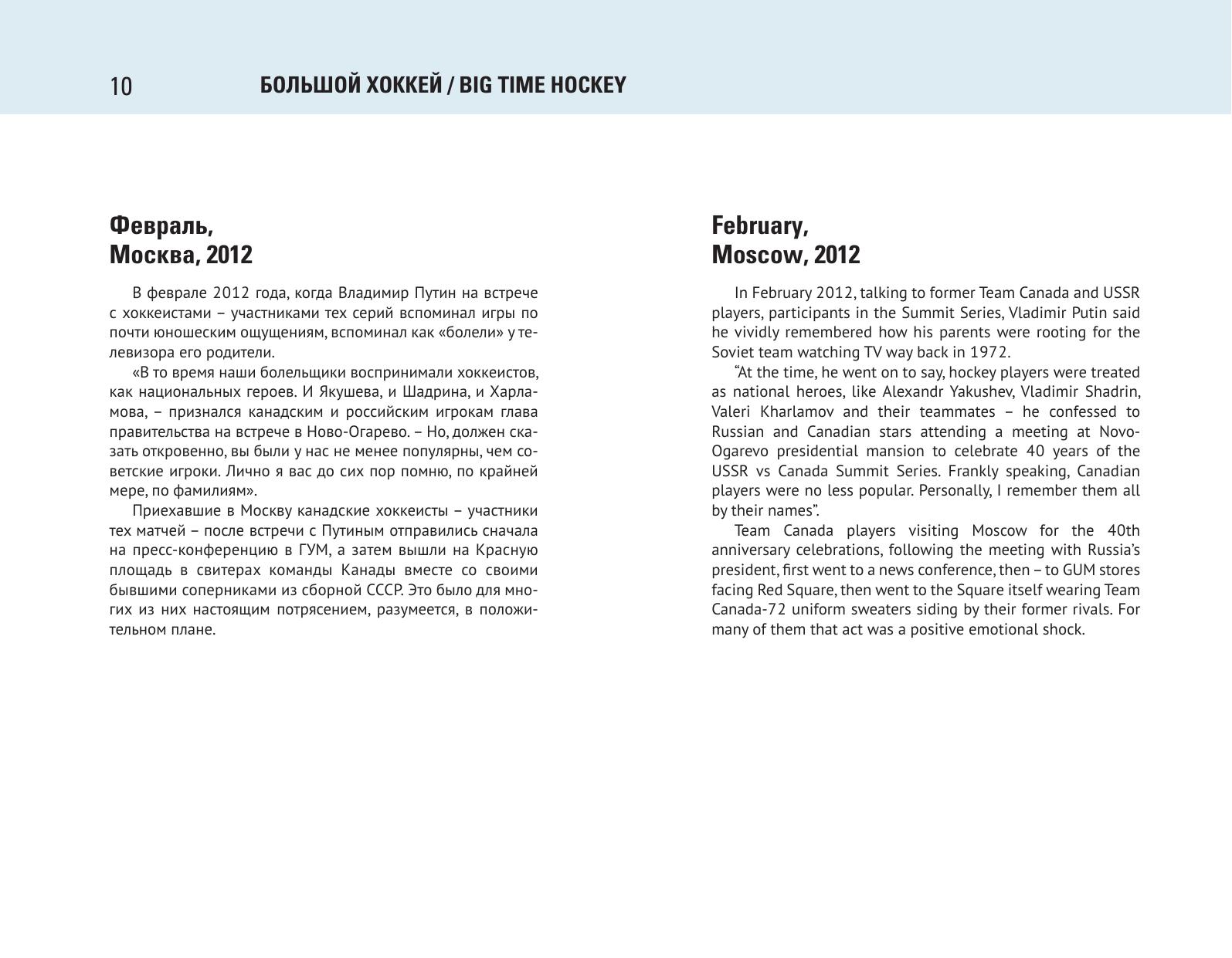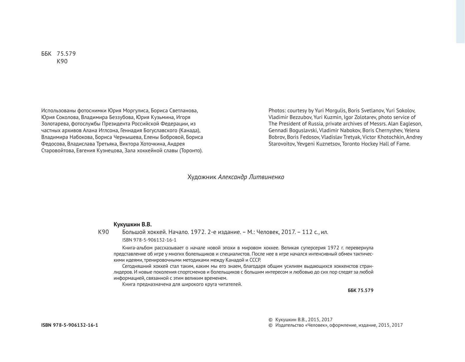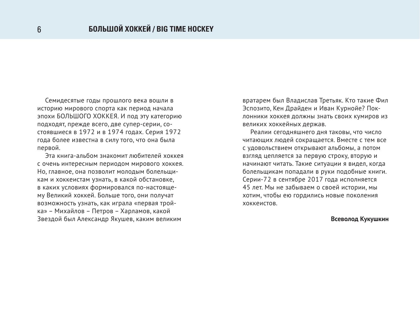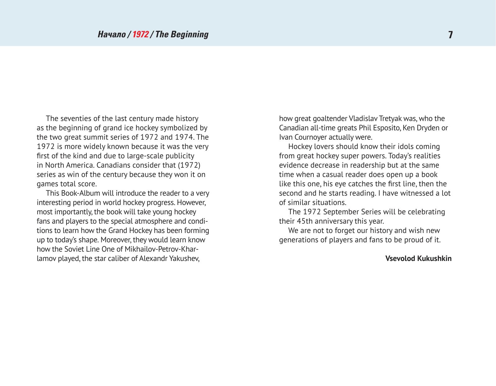 Книга-альбом рассказывает о начале новой эпохи в мировом хоккее. Великая суперсерия 1972 г. перевернула представление об игре у многих болельщиков и специалистов. После нее в игре начался интенсивный обмен тактическими идеями, тренировочными методиками между Канадой и СССР.