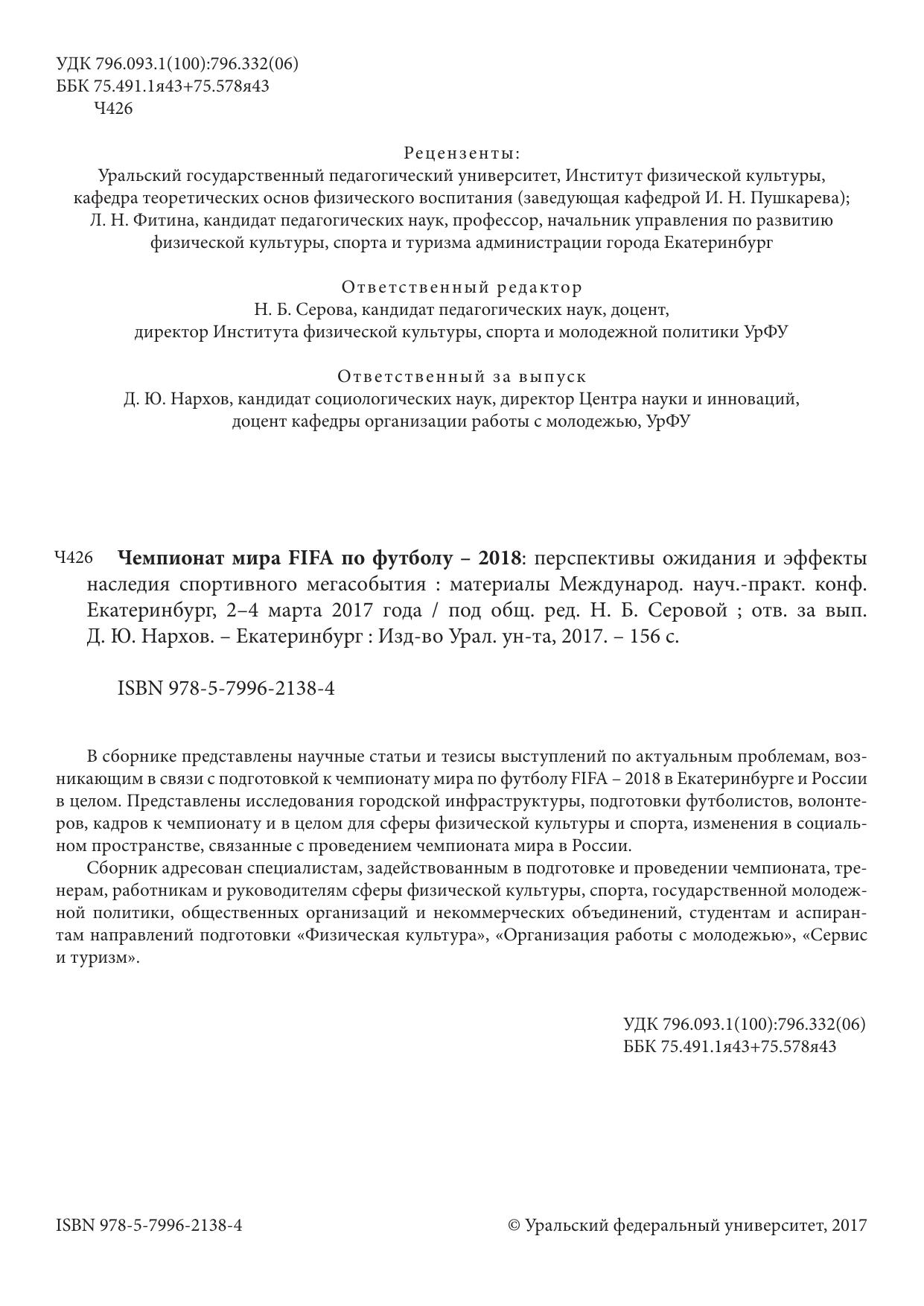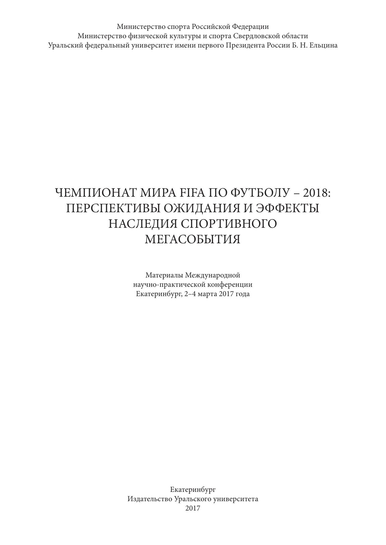 Чемпионат мира FIFA по футболу – 2018: перспективы ожидания и эффекты наследия спортивного мегасобытия: материалы Международ. науч.-практ. конф. Екатеринбург, 2–4 марта 2017 года