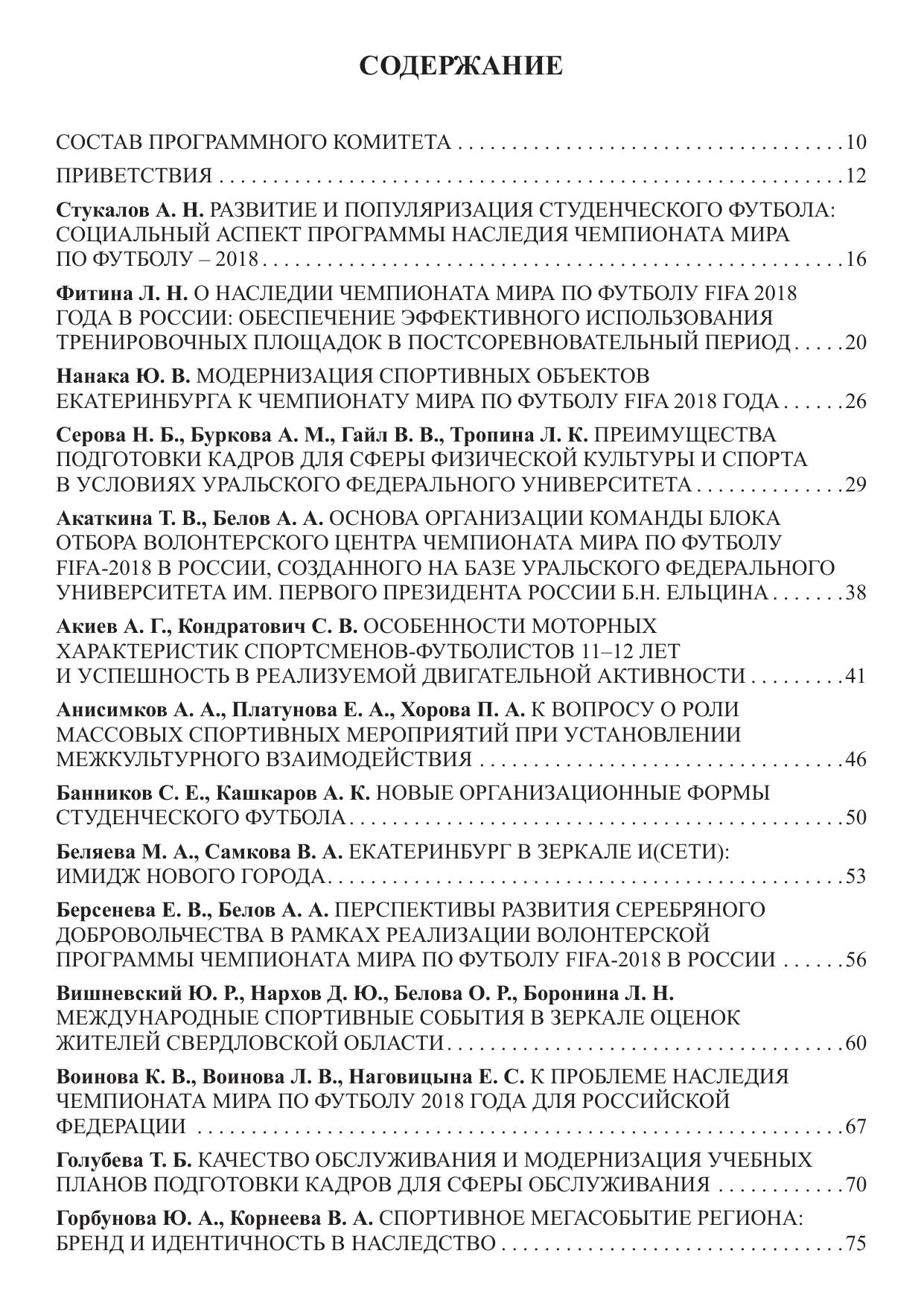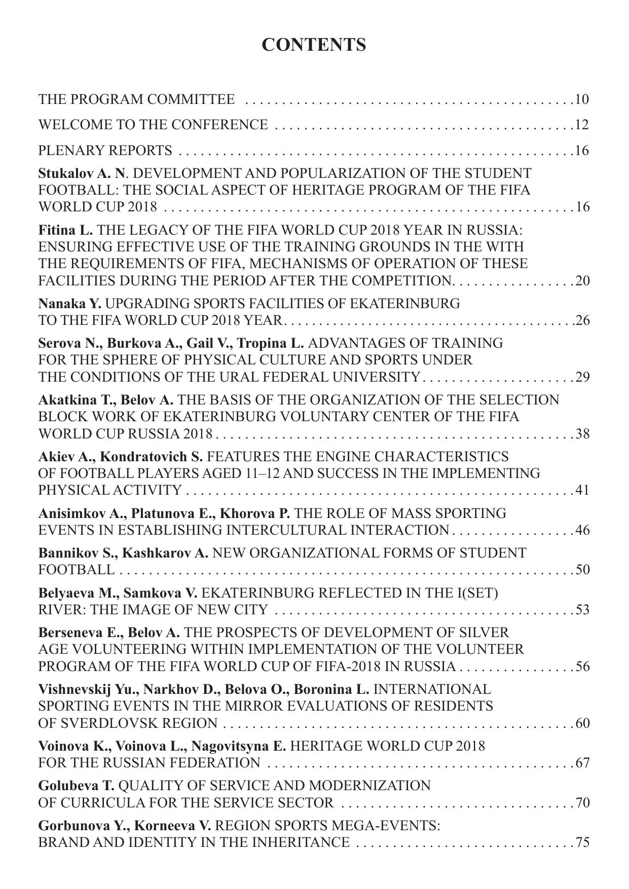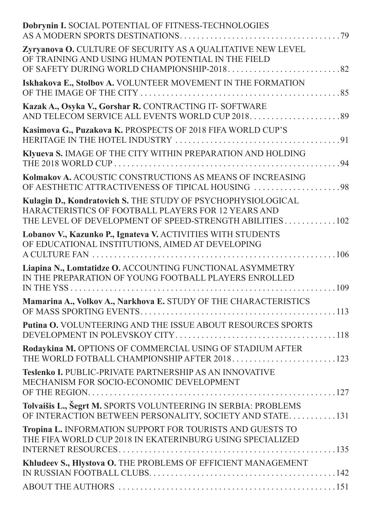 В сборнике представлены научные статьи и тезисы выступлений по актуальным проблемам, возникающим в связи с подготовкой к чемпионату мира по футболу FIFA – 2018 в Екатеринбурге и России в целом. Представлены исследования городской инфраструктуры, подготовки футболистов, волонтеров, кадров к чемпионату и в целом для сферы физической культуры и спорта, изменения в социальном пространстве, связанные с проведением чемпионата мира в России. Сборник адресован специалистам, задействованным в подготовке и проведении чемпионата, тренерам, работникам и руководителям сферы физической культуры, спорта, государственной молодежной политики, общественных организаций и некоммерческих объединений, студентам и аспирантам направлений подготовки «Физическая культура», «Организация работы с молодежью», «Сервис и туризм».