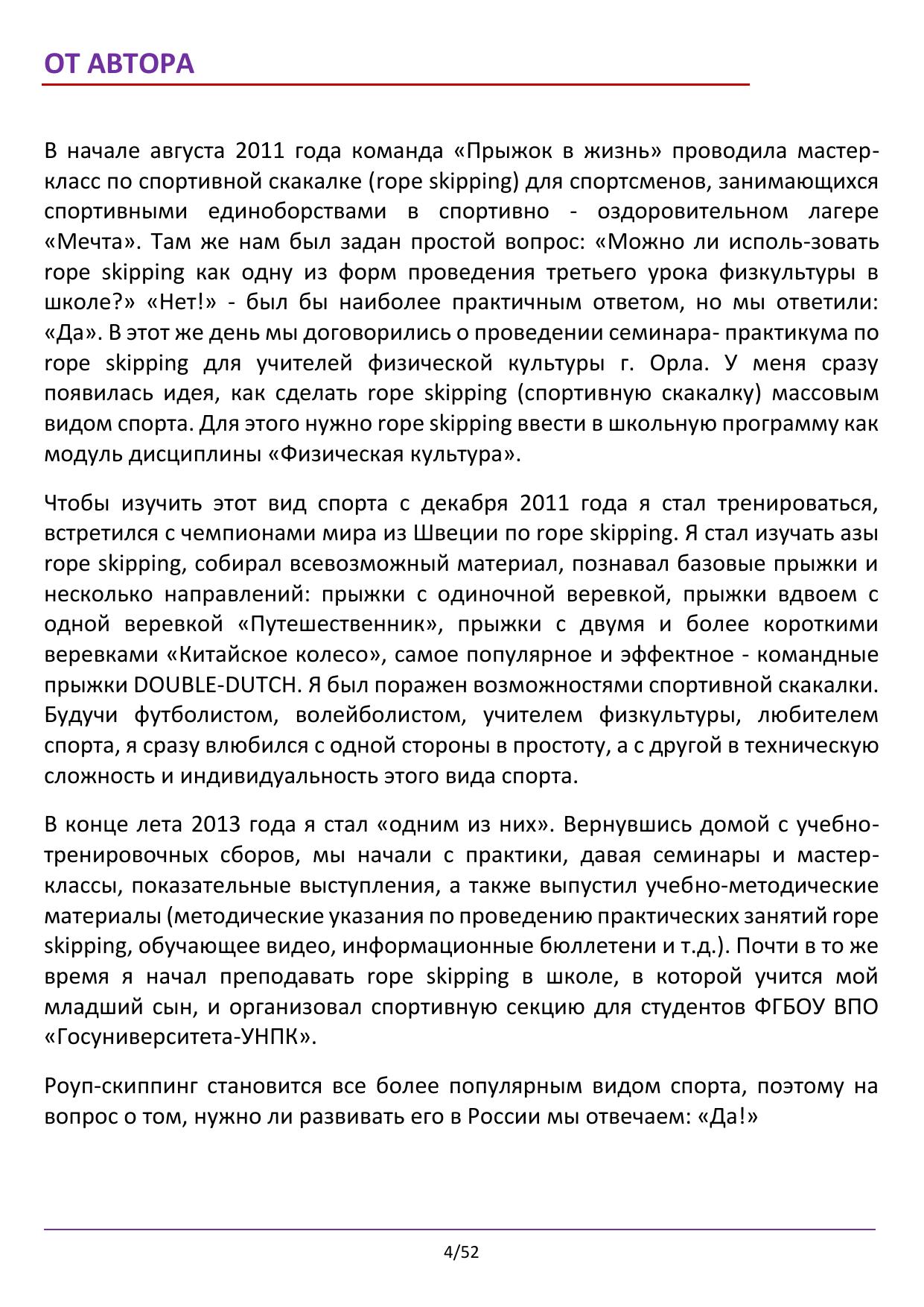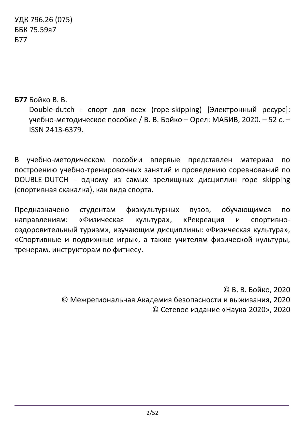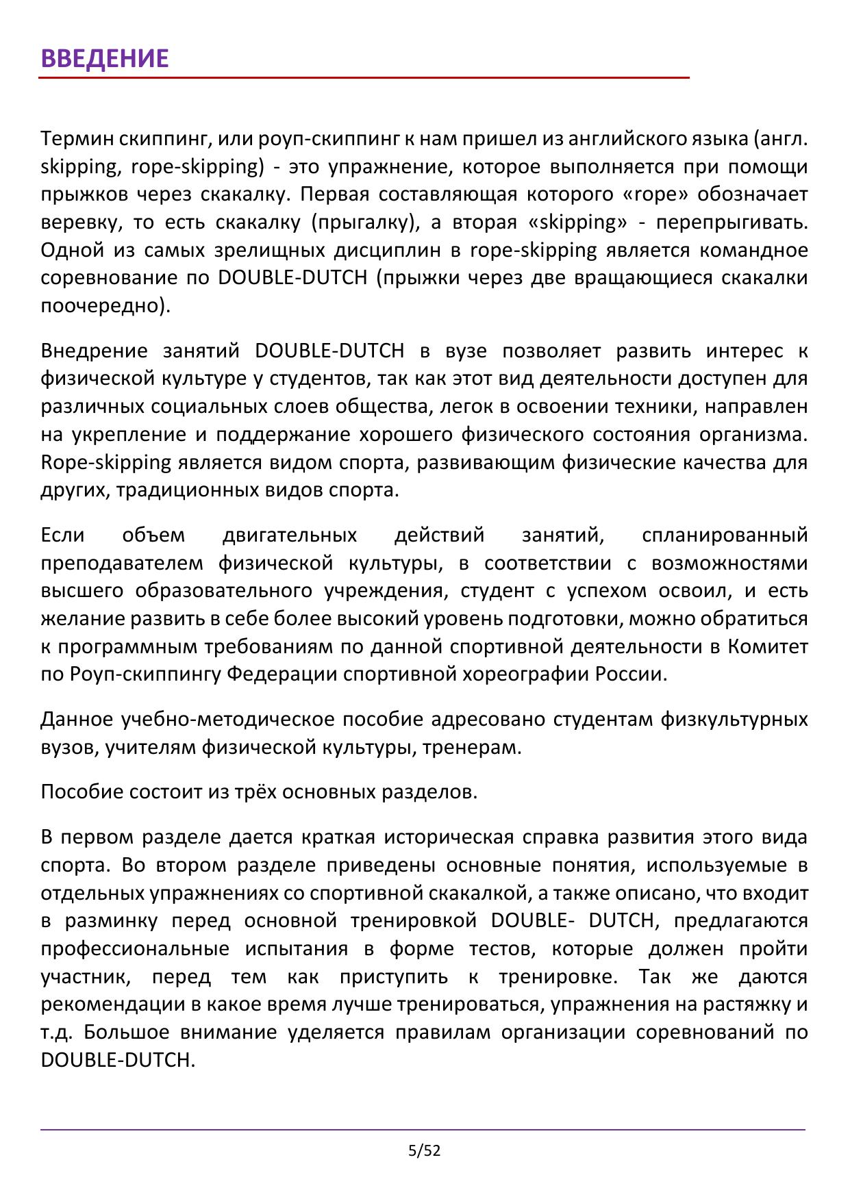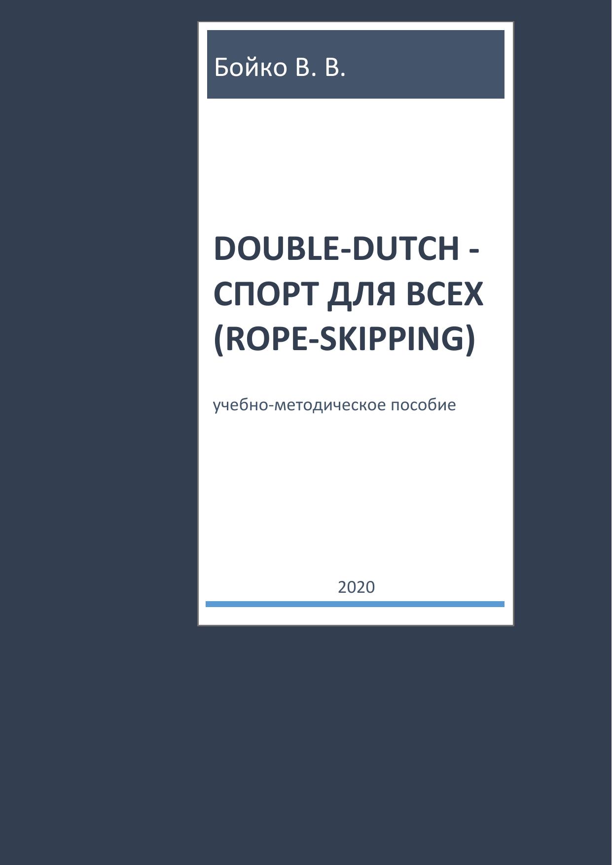 В учебно-методическом пособии впервые представлен материал по построению учебно-тренировочных занятий и проведению соревнований по DOUBLE-DUTCH - одному из самых зрелищных дисциплин rope skipping (спортивная скакалка), как вида спорта. Предназначено студентам физкультурных вузов, обучающимся по направлениям: «Физическая культура», «Рекреация и спортивно-оздоровительный туризм», изучающим дисциплины: «Физическая культура», «Спортивные и подвижные игры», а также учителям физической культуры, тренерам, инструкторам по фитнесу.