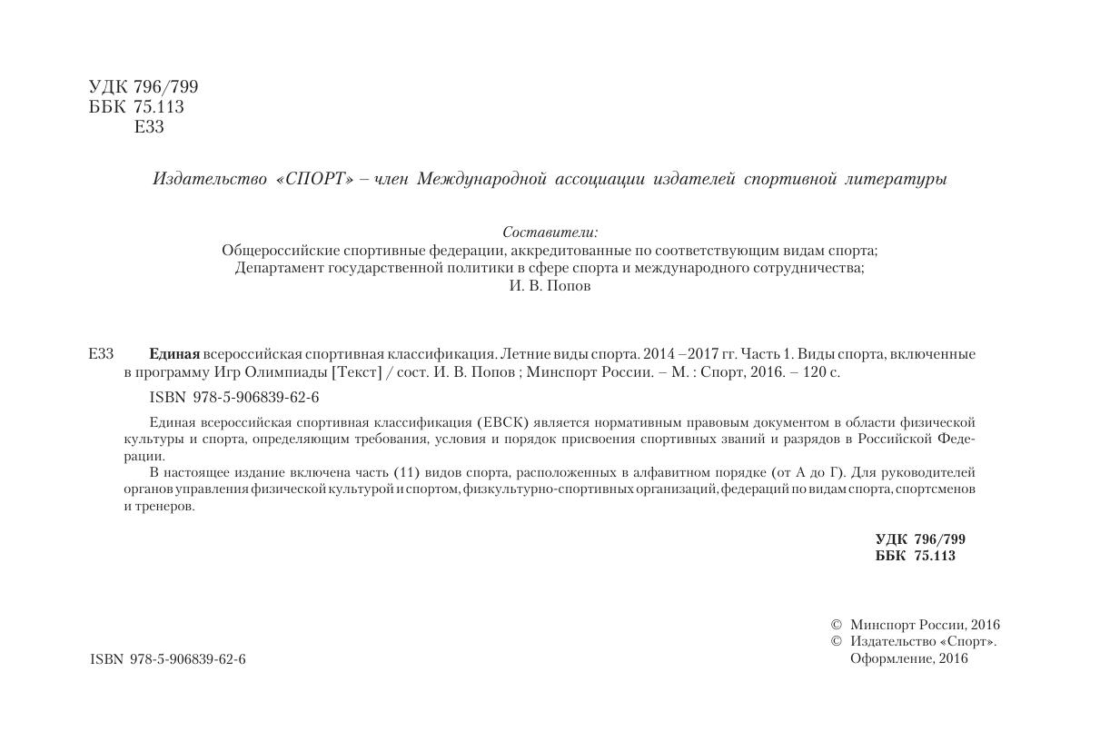 Единая всероссийская спортивная классификация (ЕВСК) является нормативным правовым документом в области физическойкультуры и спорта, определяющим требования, условия и порядок присвоения спортивных званий и разрядов в Российской Федерации. В настоящее издание включена часть (11) видов спорта, расположенных в алфавитном порядке (от А до Г). Для руководителей органов управления физической культурой и спортом, физкультурно-спортивных организаций, федераций по видам спорта, спортсменов и тренеров.