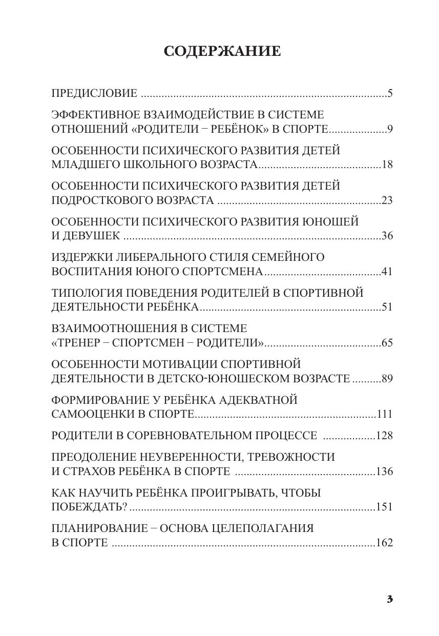 В пособии детально раскрываются психические особенности детей разных возрастных групп, обосновывается необходимость и инструменты формирования у юных спортсменов адекватной самооценки и уверенности в своих силах, действенной спортивной мотивации и умения ставить адекватные цели. Значительное внимание уделено анализу роли родителей в соревновательном процессе, в частности, вопросам о том, как помочь ребёнку справиться с предстартовой тревожностью, страхами, преодолеть стресс в случае возможного проигрыша.