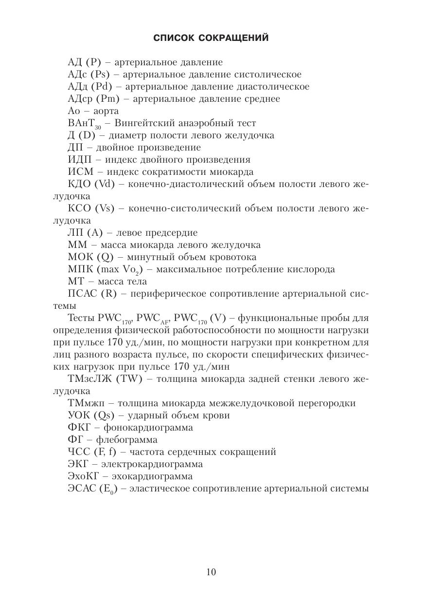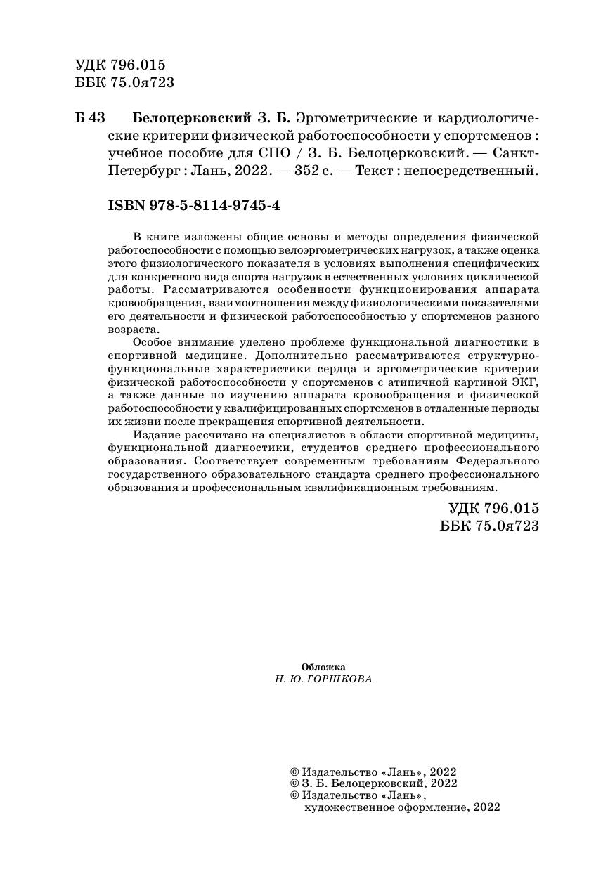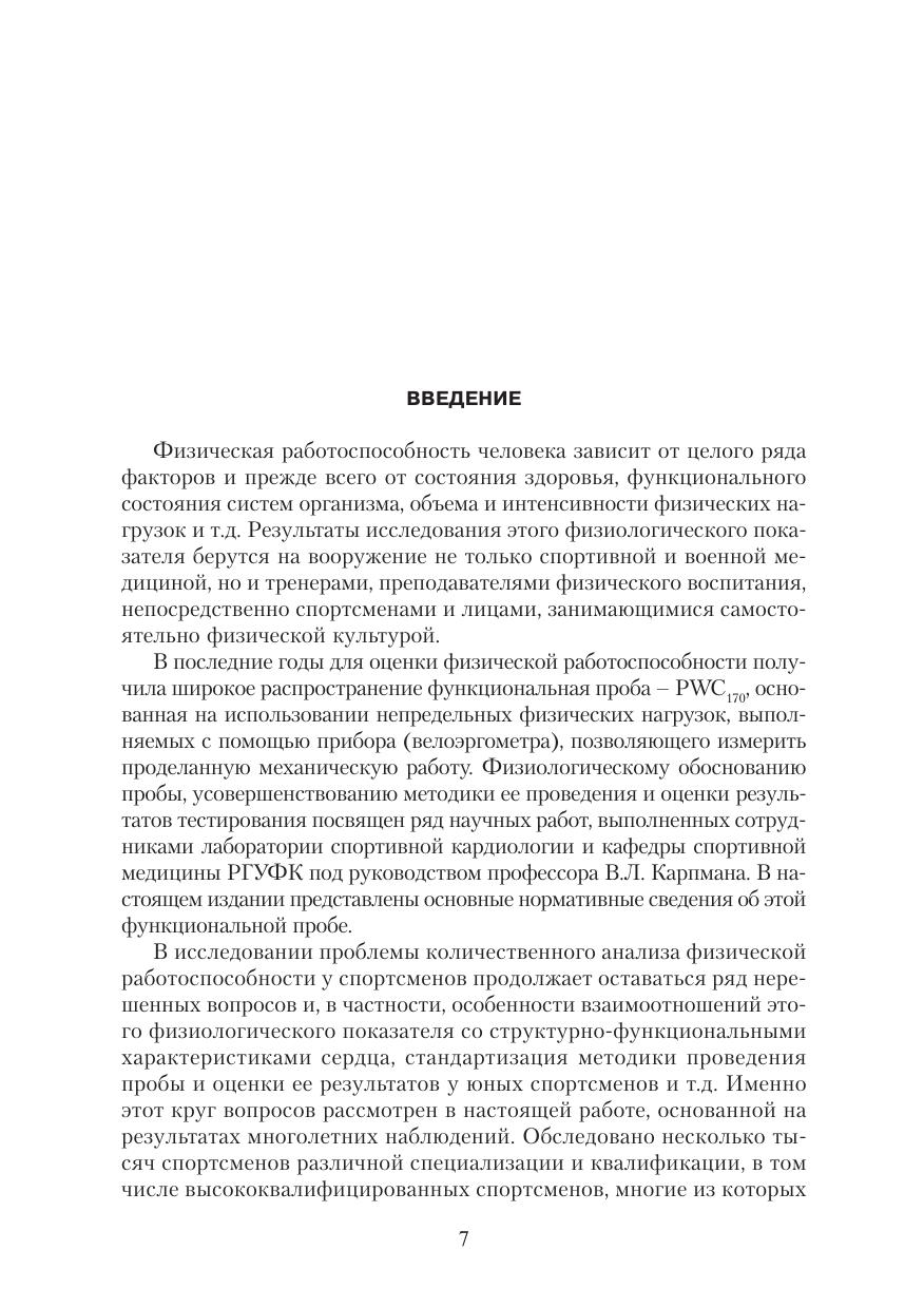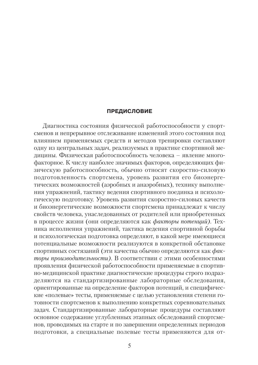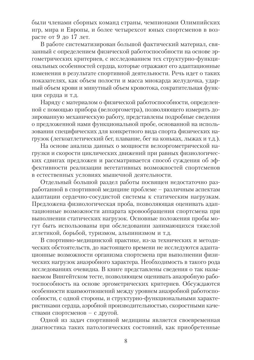 В книге изложены общие основы и методы определения физической работоспособности с помощью велоэргометрических нагрузок, а также оценка этого физиологического показателя в условиях выполнения специфических для конкретного вида спорта нагрузок в естественных условиях циклической работы. Рассматриваются особенности функционирования аппарата кровообращения, взаимоотношения между физиологическими показателями его деятельности и физической работоспособностью у спортсменов разного возраста. Особое внимание уделено проблеме функциональной диагностики в спортивной медицине. Дополнительно рассматриваются структурно-функциональные характеристики сердца и эргометрические критерии физической работоспособности у спортсменов с атипичной картиной ЭКГ, а также данные по изучению аппарата кровообращения и физической работоспособности у квалифицированных спортсменов в отдаленные периоды их жизни после прекращения спортивной деятельности. Издание рассчитано на специалистов в области спортивной медицины, функциональной диагностики, студентов среднего профессионального образования. Соответствует современным требованиям Федерального государственного образовательного стандарта среднего профессионального образования и профессиональным квалификационным требованиям.