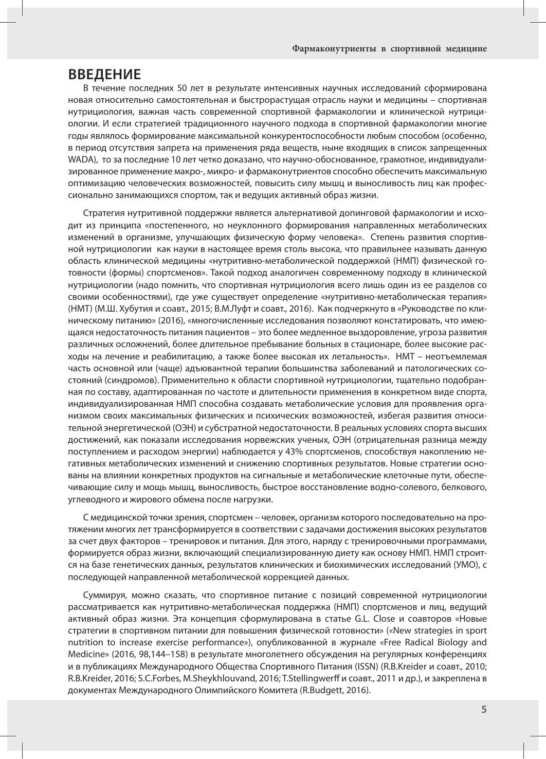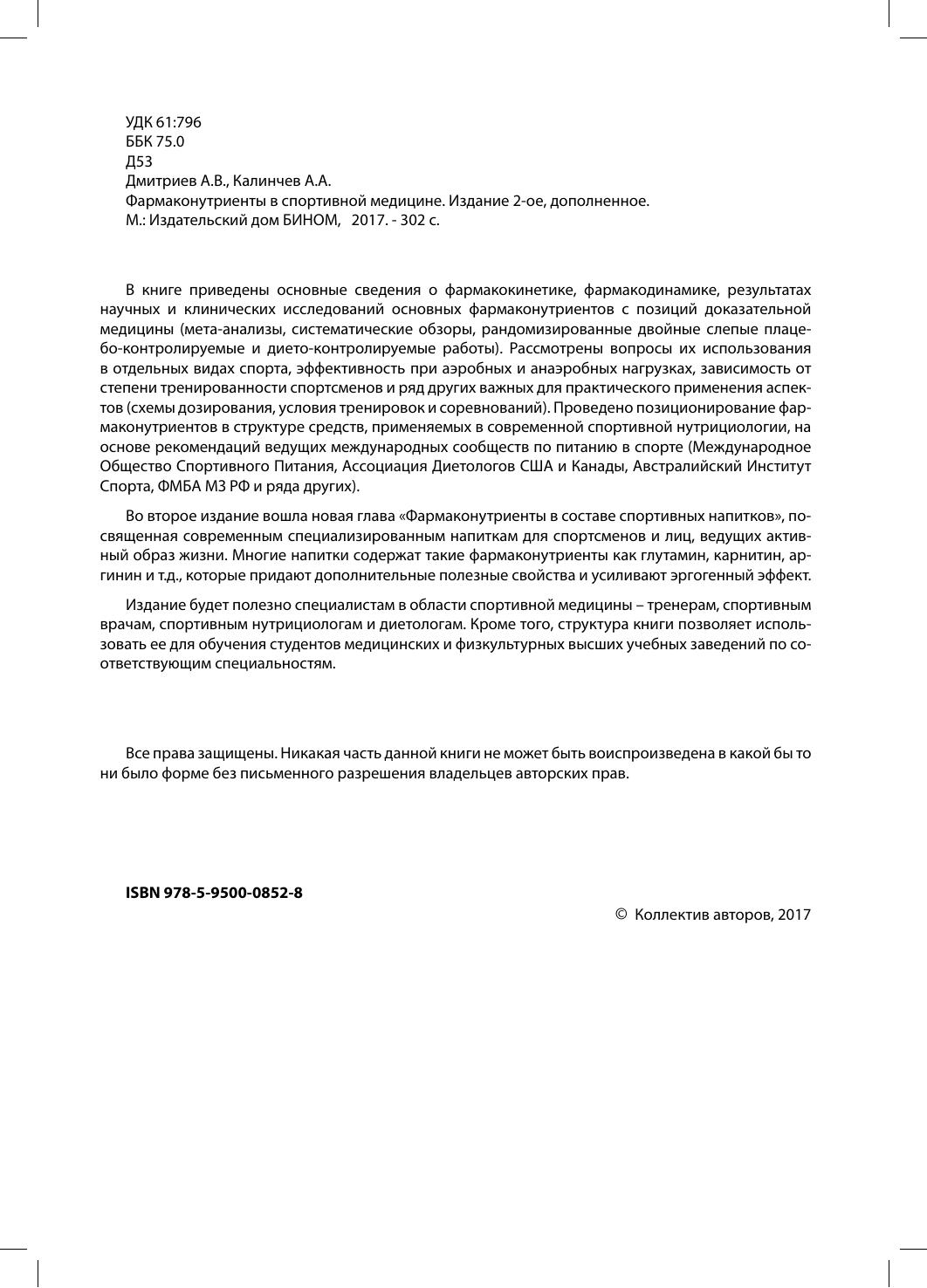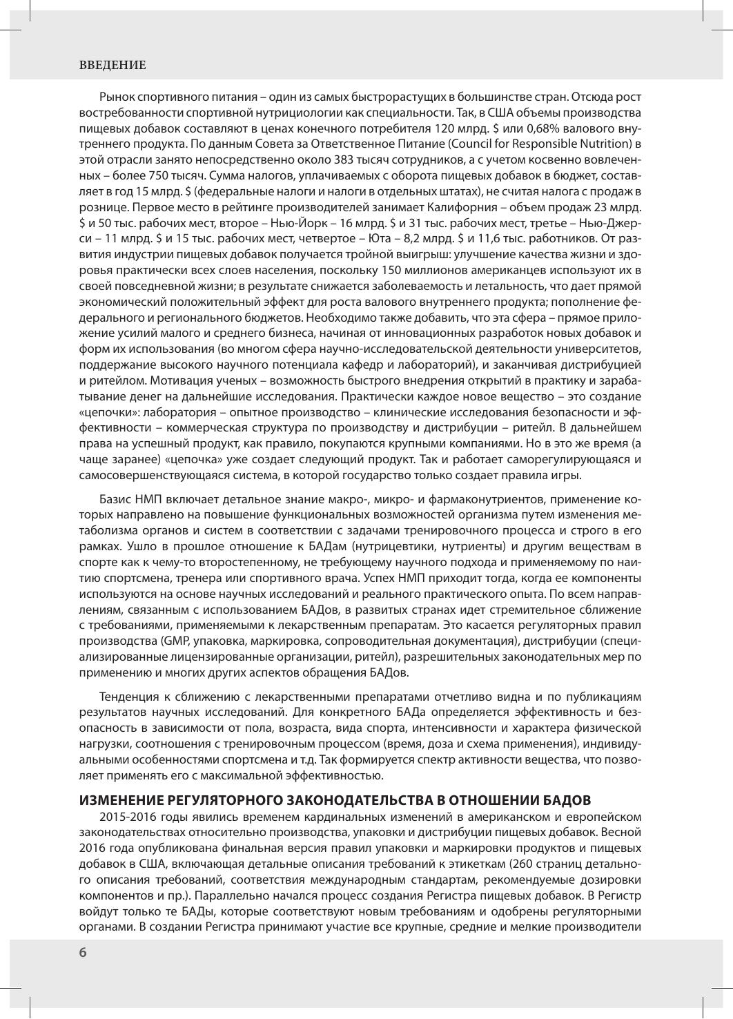 Спорта, ФМБА МЗ РФ и ряда других). Во второе издание вошла новая глава «Фармаконутриенты в составе спортивных напитков», посвященная современным специализированным напиткам для спортсменов и лиц, ведущих активный образ жизни. Многие напитки содержат такие фармаконутриенты как глутамин, карнитин, аргинин и т.д., которые придают дополнительные полезные свойства и усиливают эргогенный эффект. Издание будет полезно специалистам в области спортивной медицины – тренерам, спортивным врачам, спортивным нутрициологам и диетологам. Кроме того, структура книги позволяет использовать ее для обучения студентов медицинских и физкультурных высших учебных заведений по соответствующим специальностям.
