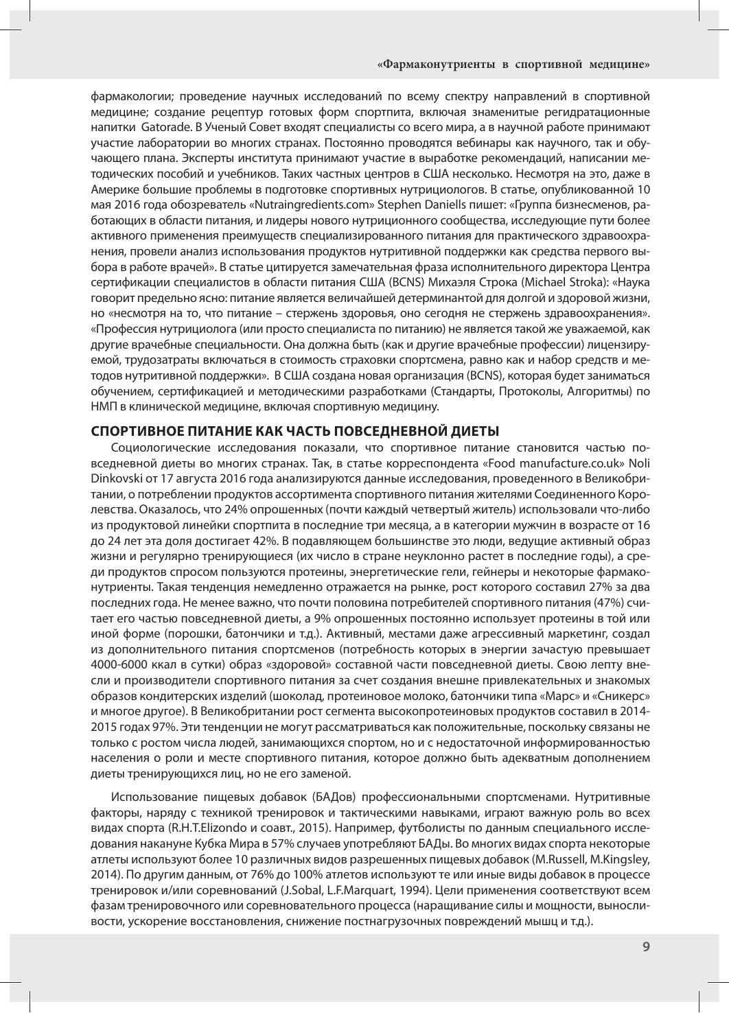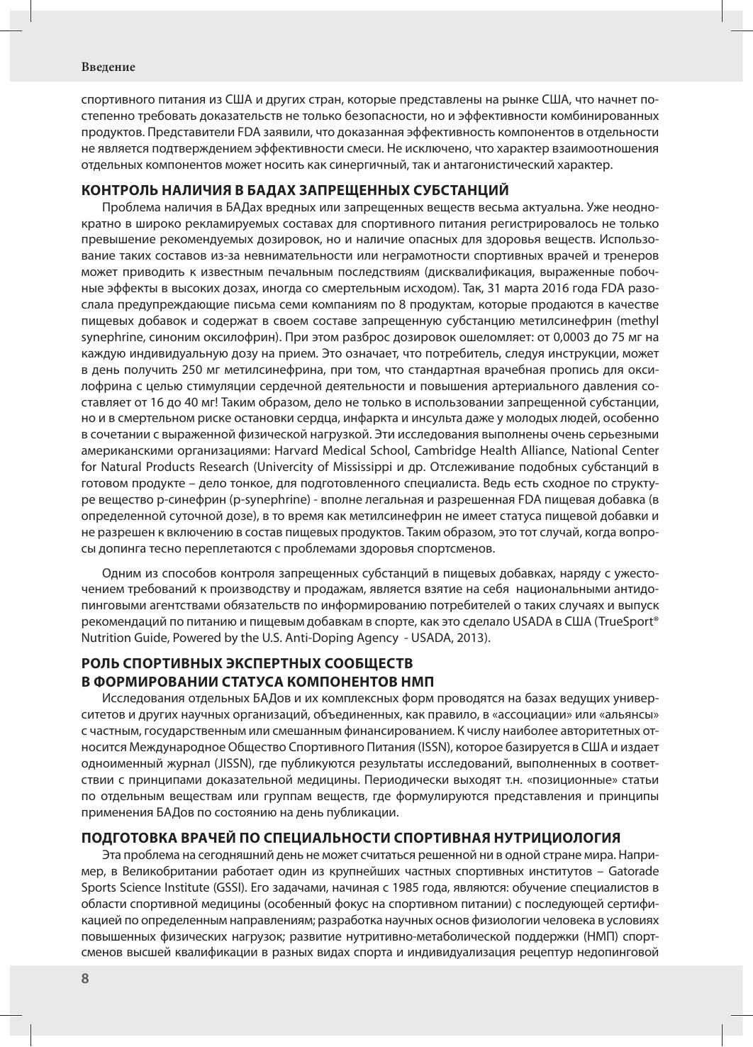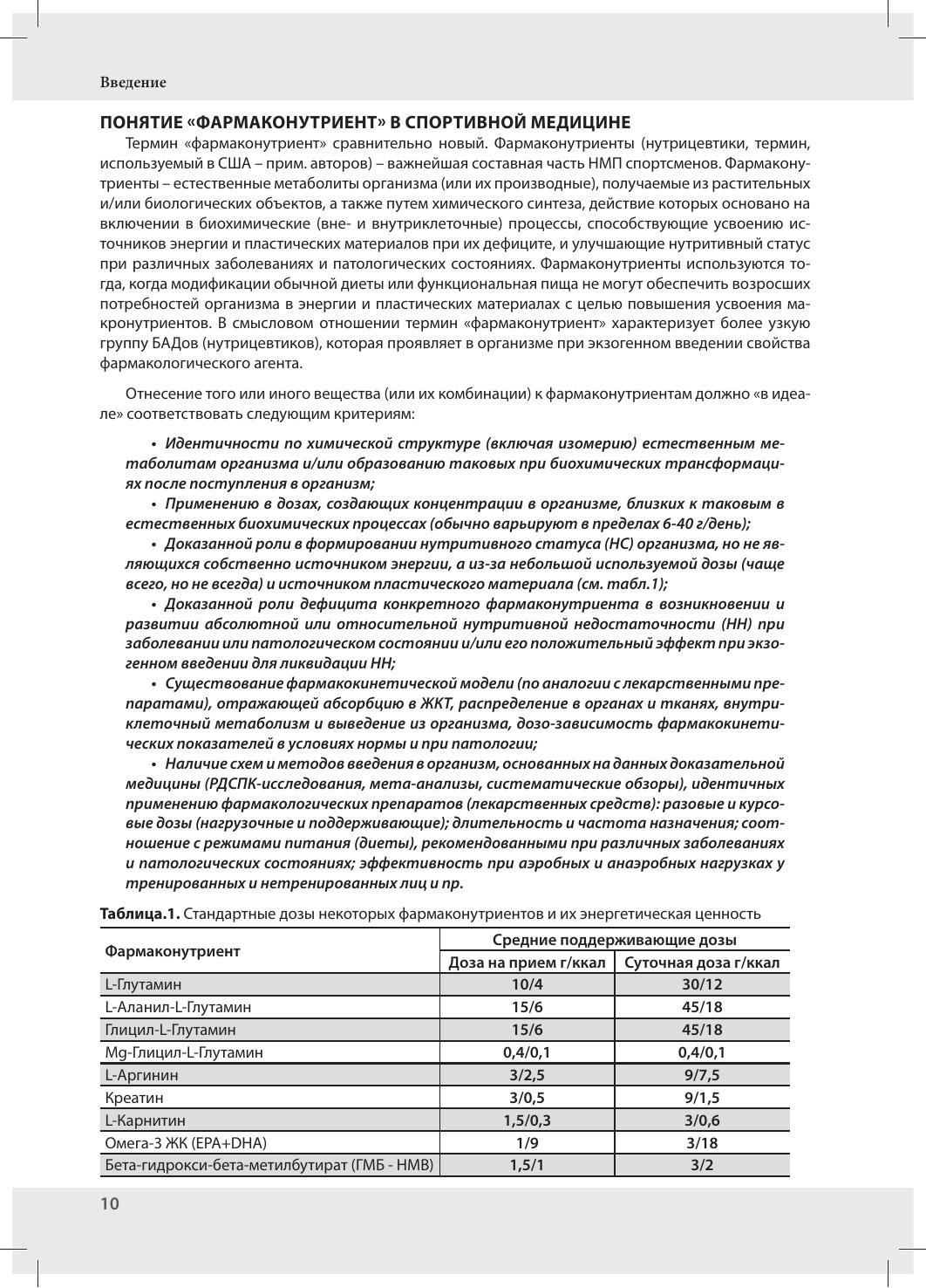 Спорта, ФМБА МЗ РФ и ряда других). Во второе издание вошла новая глава «Фармаконутриенты в составе спортивных напитков», посвященная современным специализированным напиткам для спортсменов и лиц, ведущих активный образ жизни. Многие напитки содержат такие фармаконутриенты как глутамин, карнитин, аргинин и т.д., которые придают дополнительные полезные свойства и усиливают эргогенный эффект. Издание будет полезно специалистам в области спортивной медицины – тренерам, спортивным врачам, спортивным нутрициологам и диетологам. Кроме того, структура книги позволяет использовать ее для обучения студентов медицинских и физкультурных высших учебных заведений по соответствующим специальностям.