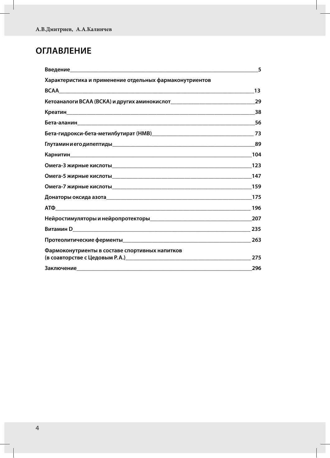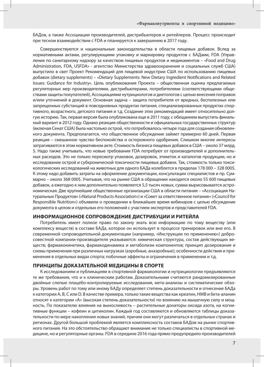 В книге приведены основные сведения о фармакокинетике, фармакодинамике, результатах научных и клинических исследований основных фармаконутриентов с позиций доказательной медицины (мета-анализы, систематические обзоры, рандомизированные двойные слепые плацебо-контролируемые и дието-контролируемые работы). Рассмотрены вопросы их использования в отдельных видах спорта, эффективность при аэробных и анаэробных нагрузках, зависимость от степени тренированности спортсменов и ряд других важных для практического применения аспектов (схемы дозирования, условия тренировок и соревнований). Проведено позиционирование фармаконутриентов в структуре средств, применяемых в современной спортивной нутрициологии, на основе рекомендаций ведущих международных сообществ по питанию в спорте (Международное Общество Спортивного Питания, Ассоциация Диетологов США и Канады, Австралийский Институт