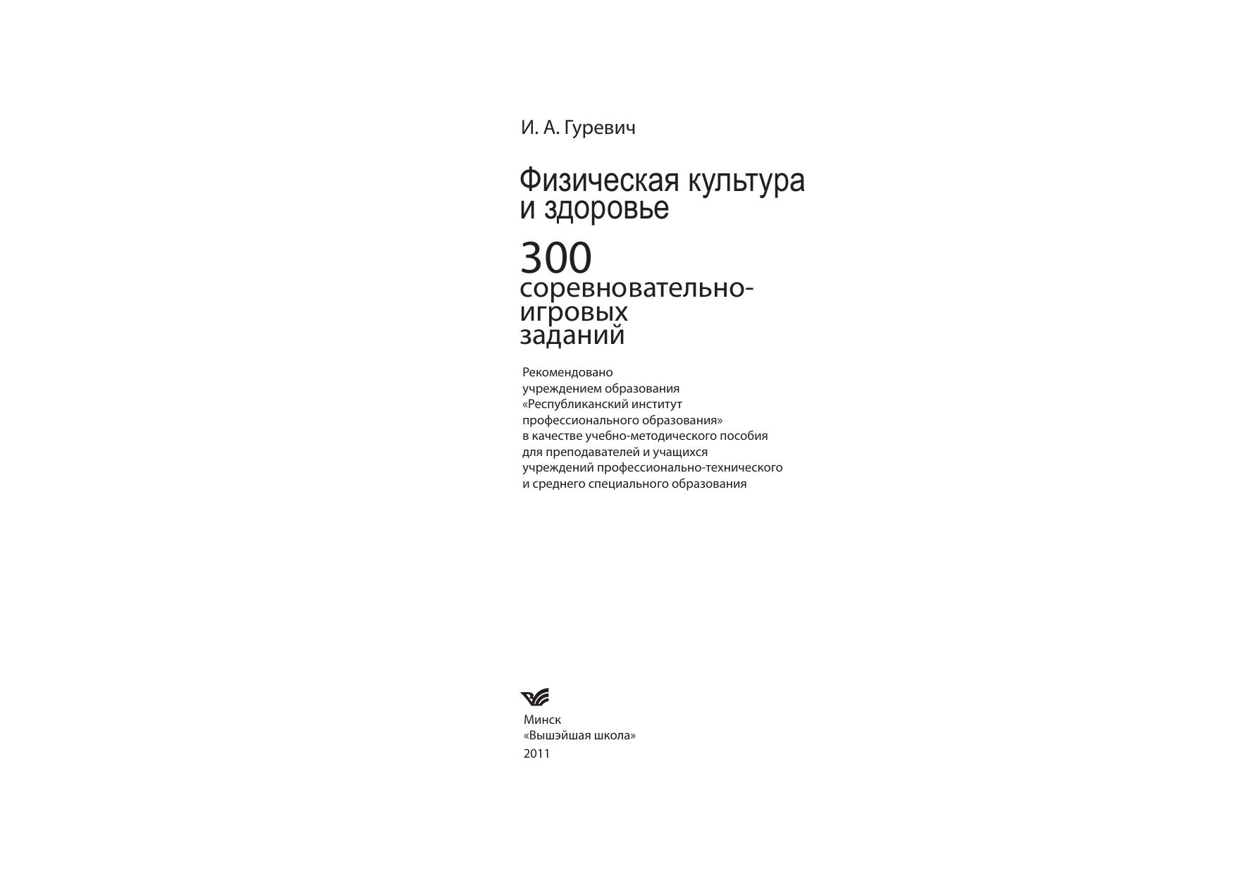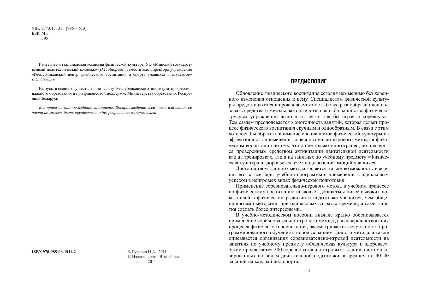 Рассматривается соревновательно-игровой метод проведения занятий по физическому воспитанию. Приведено 300 карточек соревновательно-игровых заданий, составленных на основе указанного метода с учетом программ по физическому воспитанию в Республике Беларусь. Для преподавателей и учащихся ПТУ и ССУЗов.