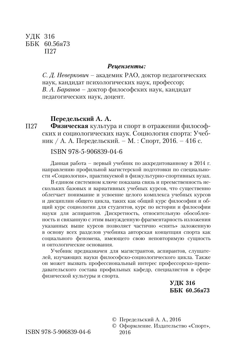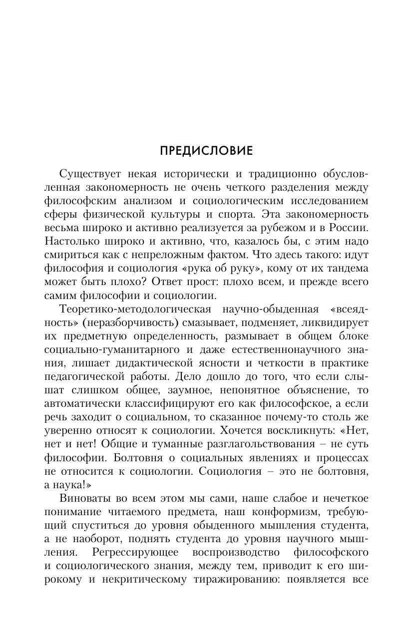 Данная работа – первый учебник по аккредитованному в 2014 г. направлению профильной магистерской подготовки по специальности «Социология», практикуемой в физкультурно-спортивных вузах. В едином системном ключе показана связь и преемственность нескольких базовых и вариативных учебных курсов, что существенно облегчает понимание и усвоение целого комплекса учебных курсов и дисциплин общего цикла, таких как общий курс философии и общий курс социологии для студентов, курс по истории и философии науки для аспирантов. Дискретность, относительную обособленность и связанную с этим вынужденную фрагментарность изложения указанных выше курсов позволяет частично «снять» заложенную в основу всех разделов учебника авторская концепция спорта как социального феномена, имеющего свою неповторимую сущность и онтологические основания. Учебник предназначен для магистрантов, аспирантов, слушателей, изучающих науки философско-оциологического цикла. Также он может вызвать профессиональный интерес профессорско-преподавательского состава профильных кафедр, специалистов в сфере физической культуры и спорта.
