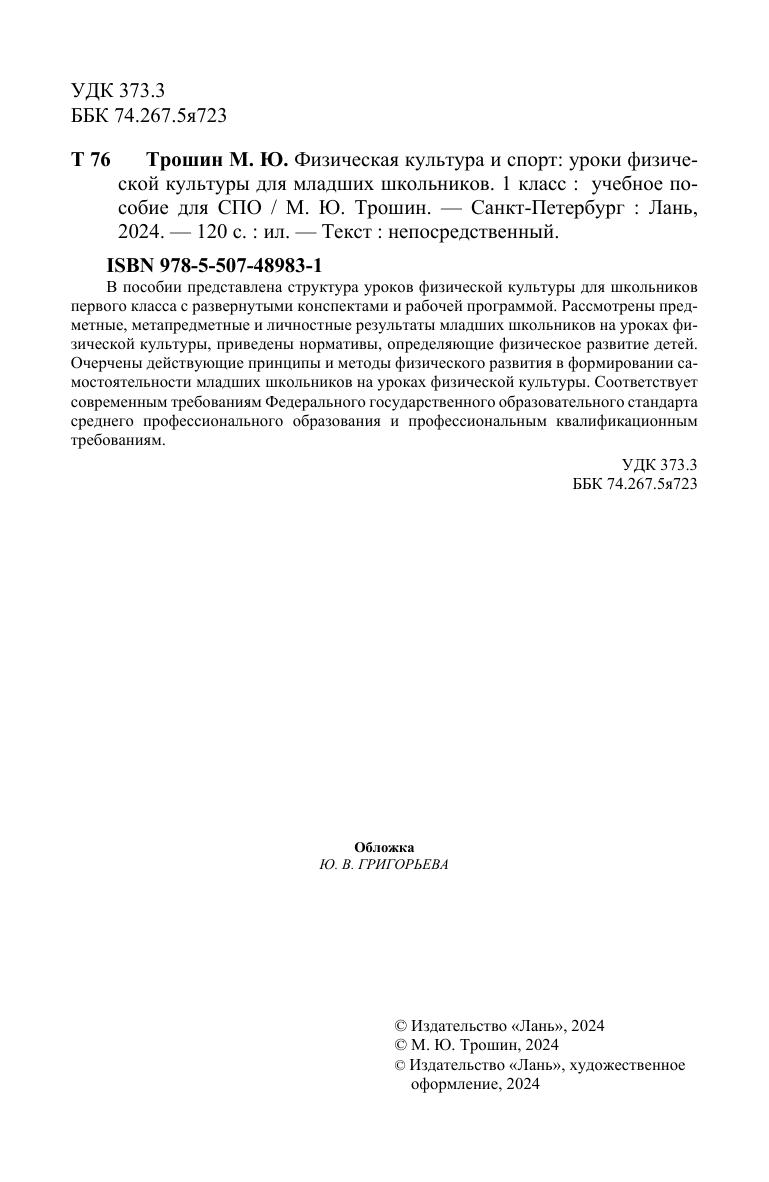 В пособии представлена структура уроков физической культуры для школьников первого класса с развернутыми конспектами и рабочей программой. Рассмотрены предметные, метапредметные и личностные результаты младших школьников на уро-ках физической культуры, приведены нормативы, определяющие физическое развитие детей. Очерчены действующие принципы и методы физического развития в формировании самостоятельности младших школьников на уроках физической культуры. Со-ответствует современным требованиям Федерального государственного образовательного стандарта среднего профессионального образования и профессиональным квалификационным требованиям.