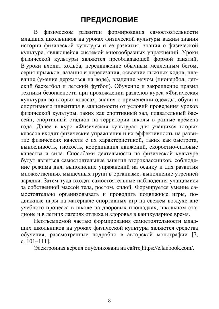 В пособии представлена структура уроков физической культуры для школьников второго класса с развернутыми конспектами и рабочей программой. Рассмотрены предметные, метапредметные и личностные результаты младших школьников на уроках физической культуры, приведены нормативы, определяющие физическое развитие детей. Очерчены действующие принципы и методы физического развития в формировании самостоятельности младших школьников на уроках физической культуры.