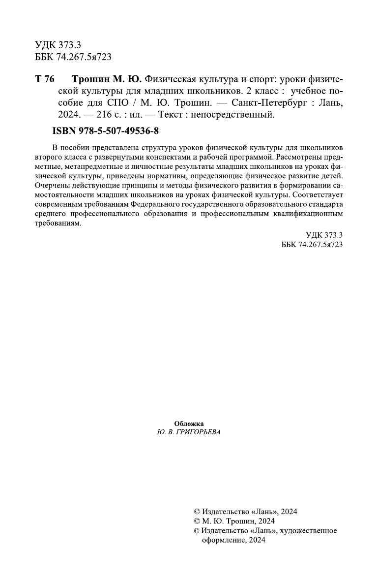 В пособии представлена структура уроков физической культуры для школьников второго класса с развернутыми конспектами и рабочей программой. Рассмотрены предметные, метапредметные и личностные результаты младших школьников на уроках физической культуры, приведены нормативы, определяющие физическое развитие детей. Очерчены действующие принципы и методы физического развития в формировании самостоятельности младших школьников на уроках физической культуры. Соответствует современным требованиям Федерального государственного образовательного стандарта среднего профессио-нального образования и профессиональным квалификационным требованиям.