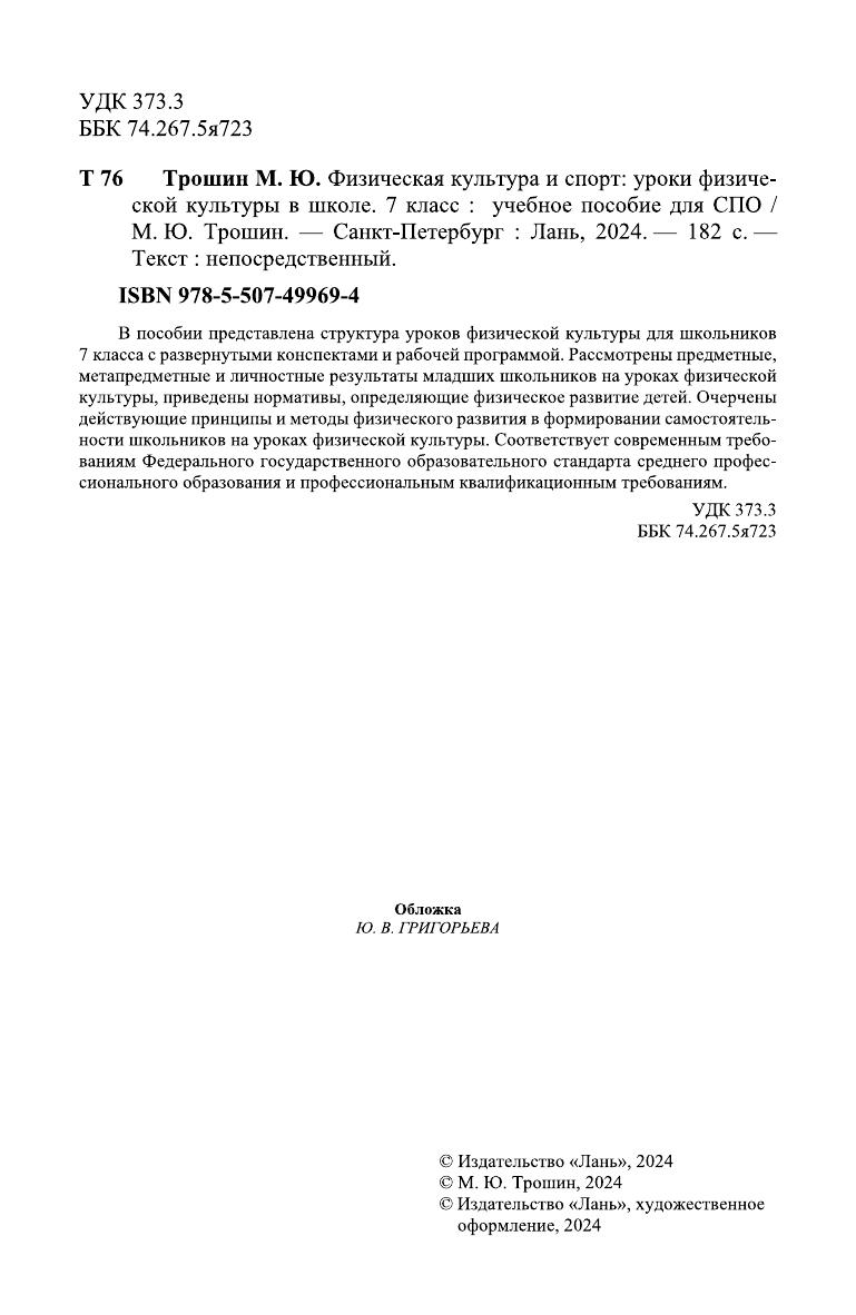 В пособии представлена структура уроков физической культуры для школьников 7 класса с развернутыми конспектами и рабочей программой. Рассмотрены предметные, метапредметные и личностные результаты школьников на уроках физической культуры, приведены нормативы, определяющие физическое развитие детей. Очерчены действующие принципы и методы физического развития в формировании самостоятельности школьников на уроках физической культуры. Соответствует современным требованиям Федерального государственного образовательного стандарта среднего профессионального образования и профессиональным квалификационным требованиям.