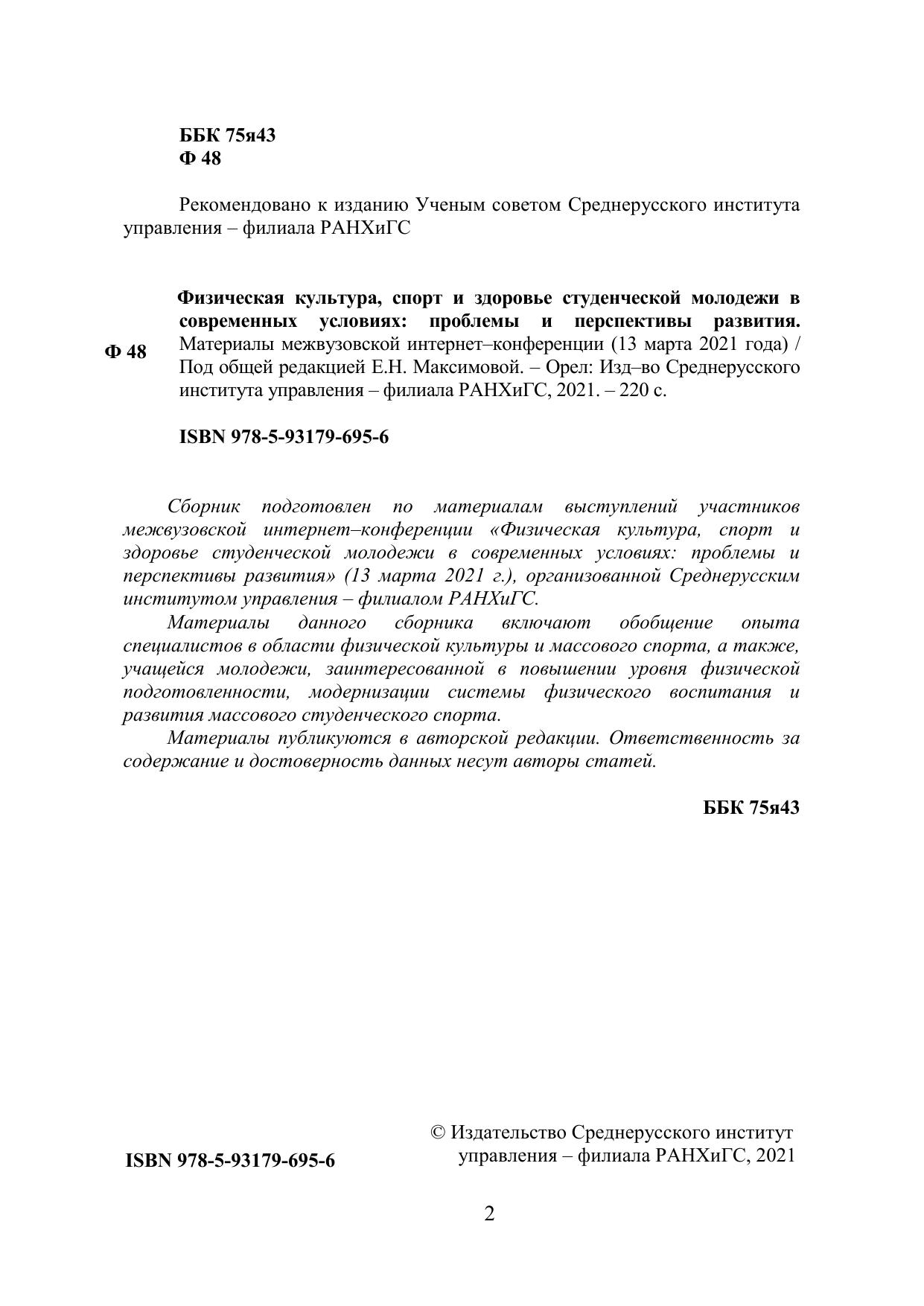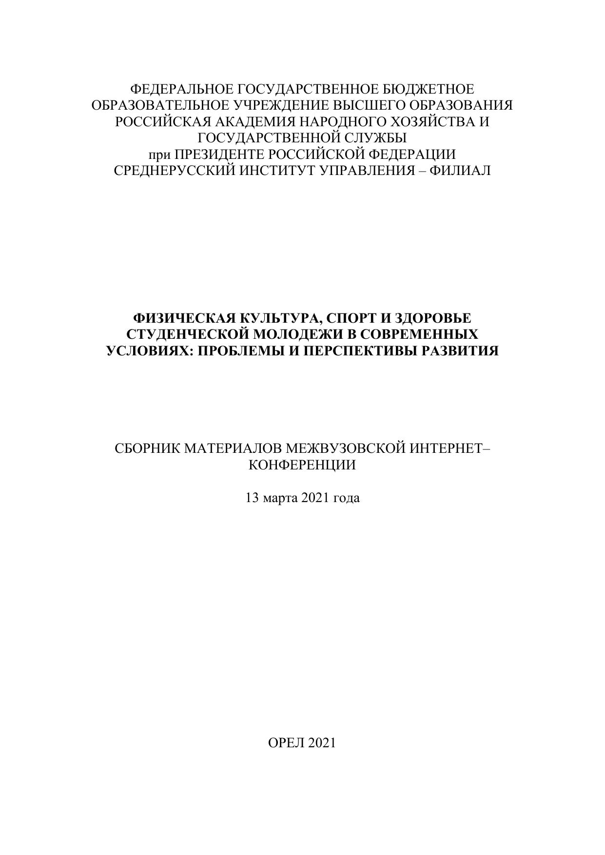 Физическая культура, спорт и здоровье студенческой молодежи в современных условиях: проблемы и перспективы развития. Материалы межвузовской интернет–конференции (13 марта 2021 года)