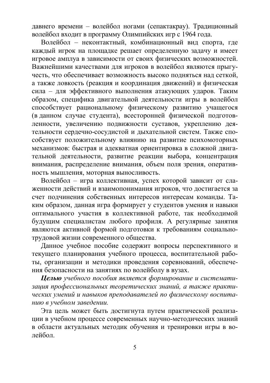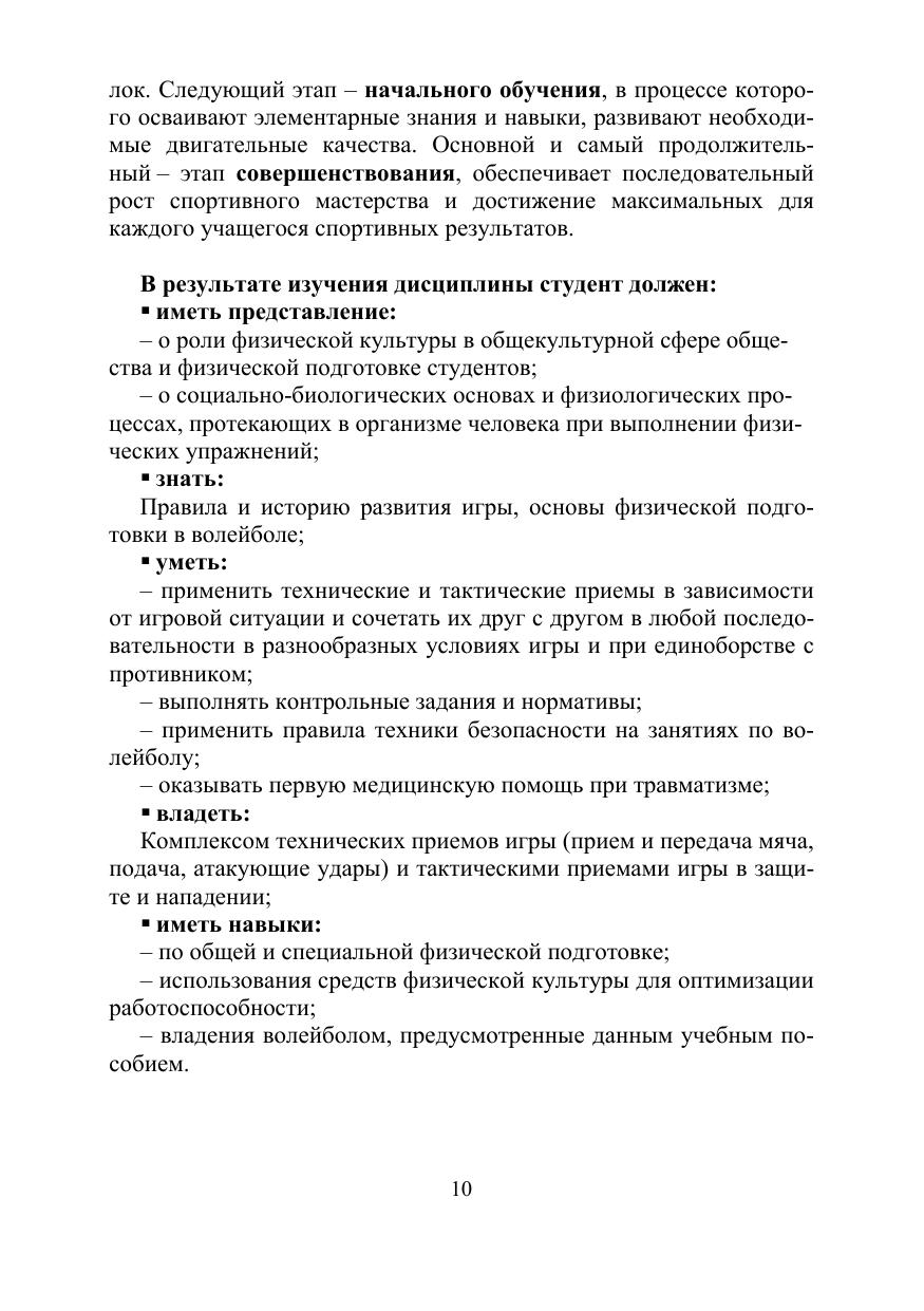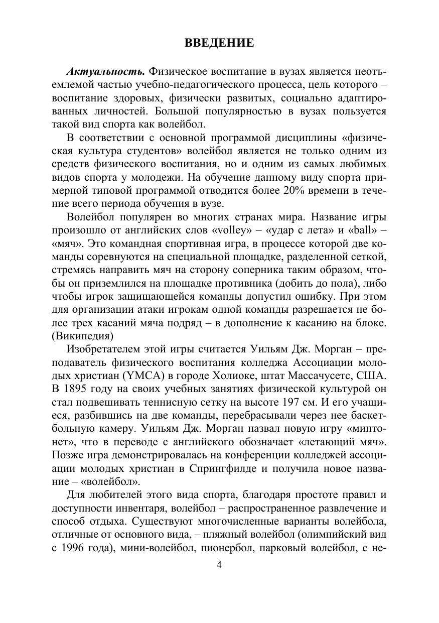 Учебное пособие предназначено для высших и средних профессио-нальных учебных заведений, обучающих дисциплинам «Физическая куль-тура» и «Элективные курсы по физической культуре и спорту». Программой предусмотрено 400 практических часов в течение всего периода обучения, их них 120 часов на игровые виды спорта (60 часов на волейбол и 60 часов на баскетбол). Таким образом, часы на обучение во-лейболу распределяются следующим образом: 1 и 2 курс по 16 часов, 3 и 4 курсы – по 14 часов. Практические занятия по разделу «Волейбол» про-граммы дисциплины «Элективные курсы» проводятся в середине осенне-го или весеннего семестров. В конце раздела программы по волейболу предусмотрено выполнение технических нормативов по данному виду спорта, а также инструкторская и судейская практика, участие во внут-ренних соревнованиях учебного заведения.