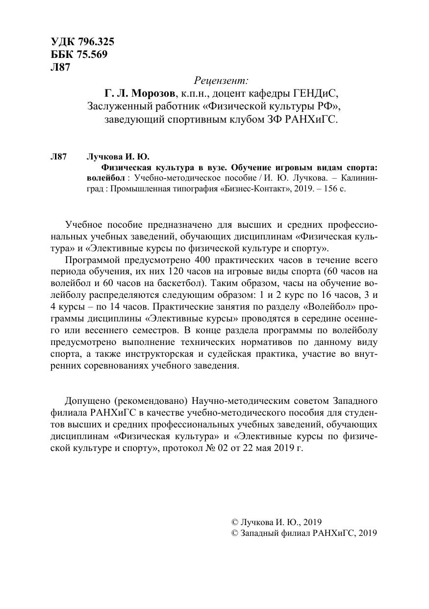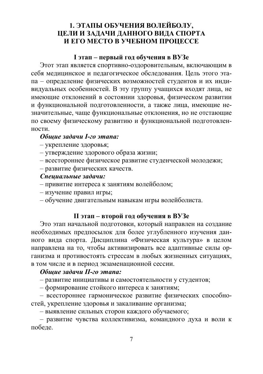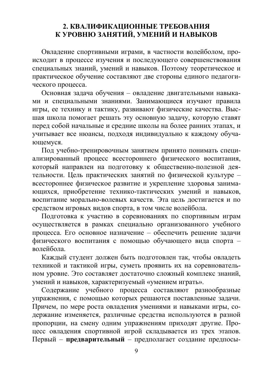 Учебное пособие предназначено для высших и средних профессио-нальных учебных заведений, обучающих дисциплинам «Физическая куль-тура» и «Элективные курсы по физической культуре и спорту». Программой предусмотрено 400 практических часов в течение всего периода обучения, их них 120 часов на игровые виды спорта (60 часов на волейбол и 60 часов на баскетбол). Таким образом, часы на обучение во-лейболу распределяются следующим образом: 1 и 2 курс по 16 часов, 3 и 4 курсы – по 14 часов. Практические занятия по разделу «Волейбол» про-граммы дисциплины «Элективные курсы» проводятся в середине осенне-го или весеннего семестров. В конце раздела программы по волейболу предусмотрено выполнение технических нормативов по данному виду спорта, а также инструкторская и судейская практика, участие во внут-ренних соревнованиях учебного заведения.