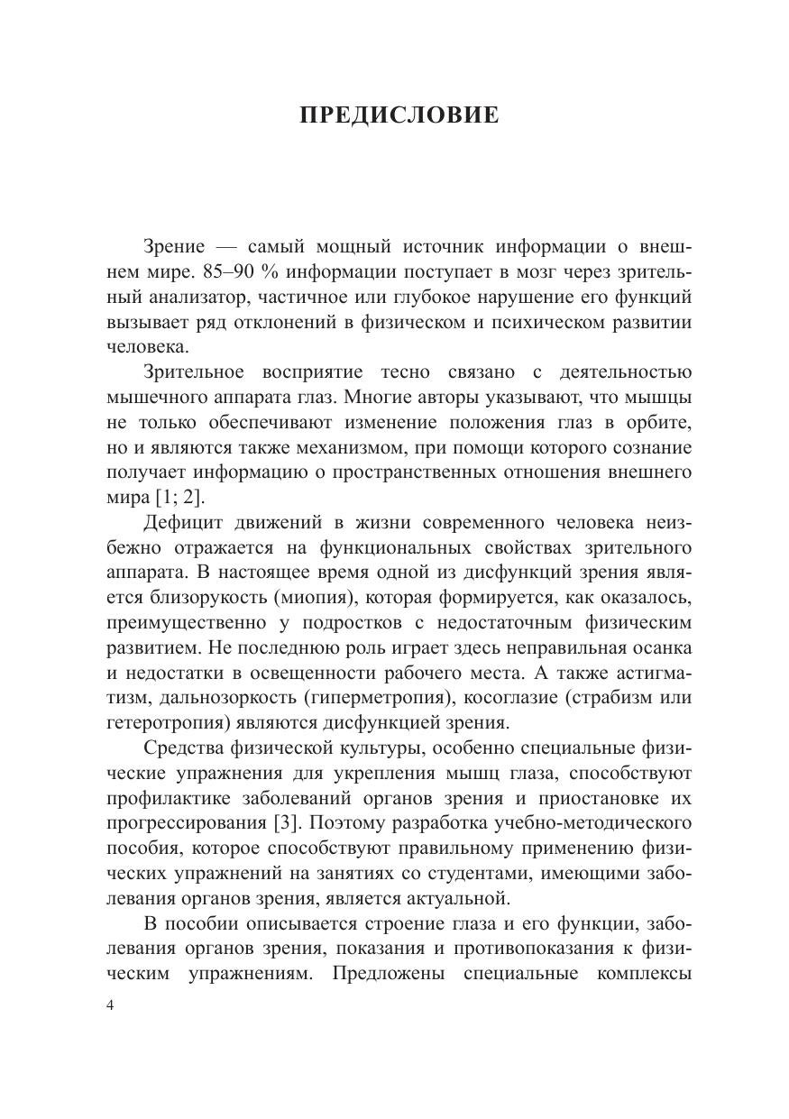 В учебно-методическом пособии рассматривается строение органа зрения и дается описание его функций. Показано значение занятий физическими упражнениями в профилактике заболеваний органов зрения, приводятся методики применения упражнений в занятиях со студентами, имеющими нарушение зрения. Материал рассчитан на студентов 1–3 курсов всех направлений и специальностей, а также на специалистов в области физической культуры и спорта.