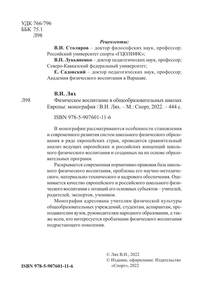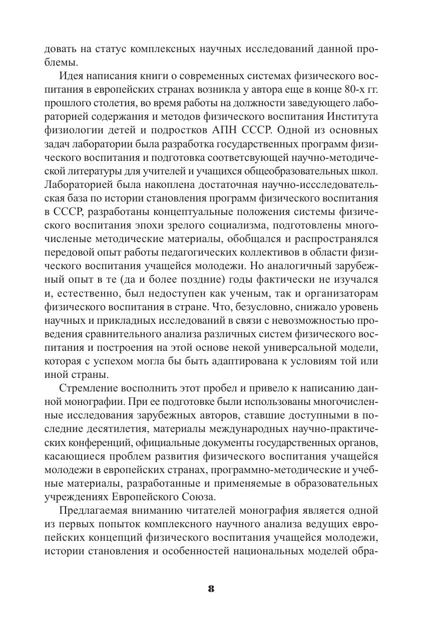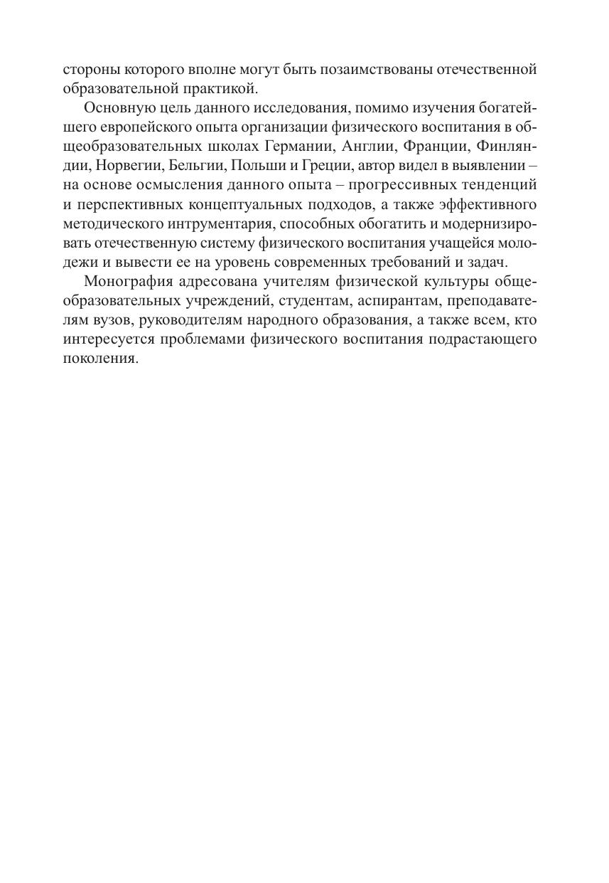 В монографии рассматриваются особенности становления и современного развития систем школьного физического образования в ряде европейских стран, проводится сравнительный анализ ведущих европейских и российских концепций школьного физического воспитания и созданных на их основе образовательных программ. Раскрывается современная нормативно-правовая база школьного физического воспитания, проблемы его научно-методического, материально-технического и кадрового обеспечения. Оценивается качество европейского и российского школьного физического воспитания с позиций его основных субъектов – учителей, родителей, экспертов, учеников. Монография адресована учителям физической культуры