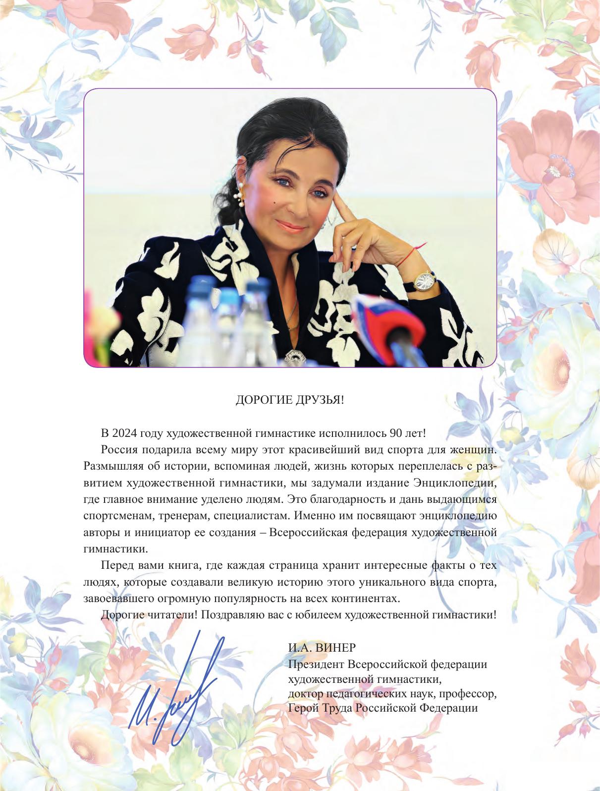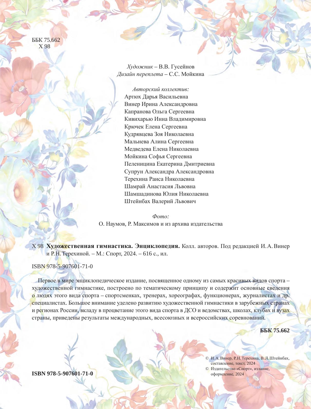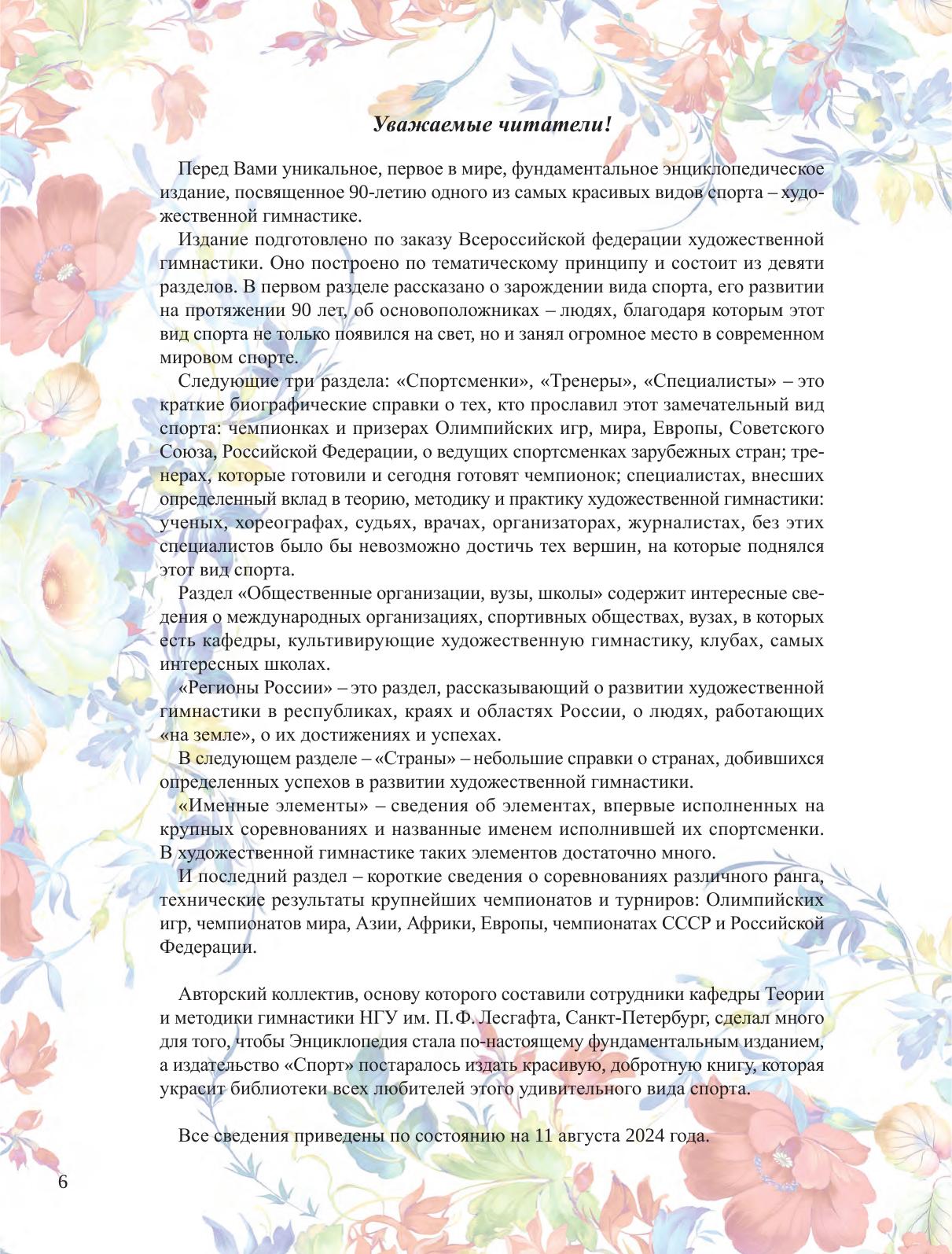 Первое в мире энциклопедическое издание, посвященное одному из самых красивых видов спорта – художественной гимнастике, построено по тематическому принципу и содержит основные сведения о людях этого вида спорта – спортсменках, тренерах, хореографах, функционерах, журналистах и др. специалистах. Большое внимание уделено развитию художественной гимнастики в зарубежных странах и регионах России, вкладу в процветание этого вида спорта в ДСО и ведомствах, школах, клубах и вузах страны, приведены результаты международных, всесоюзных и всероссийских соревнований.