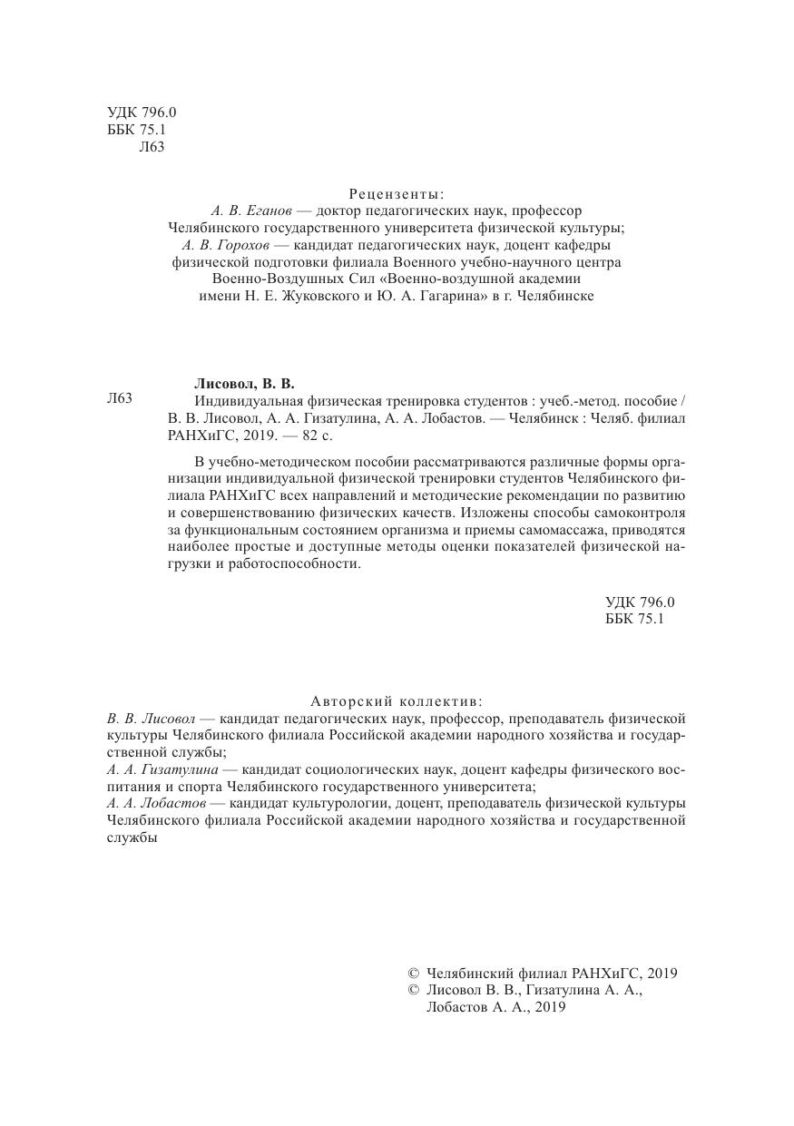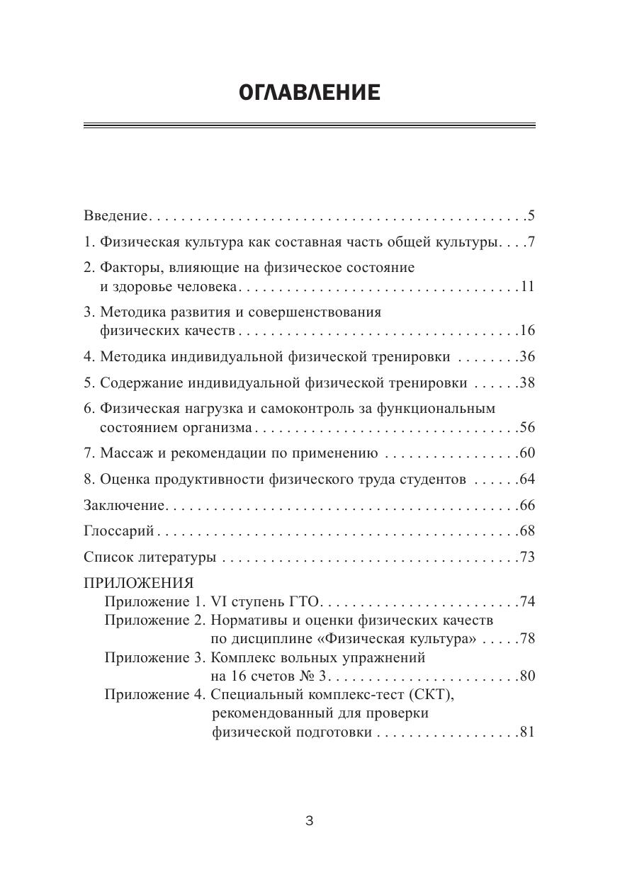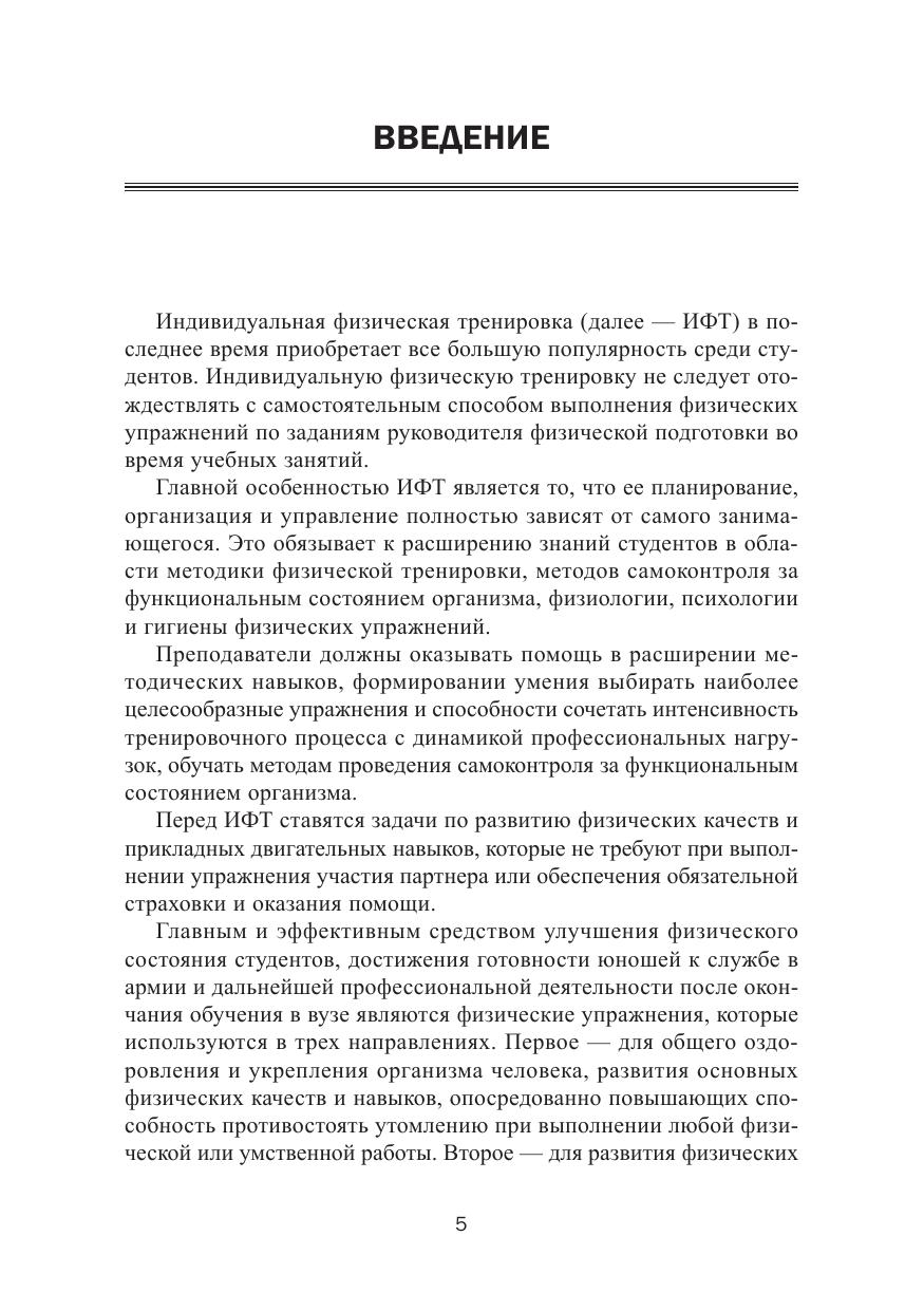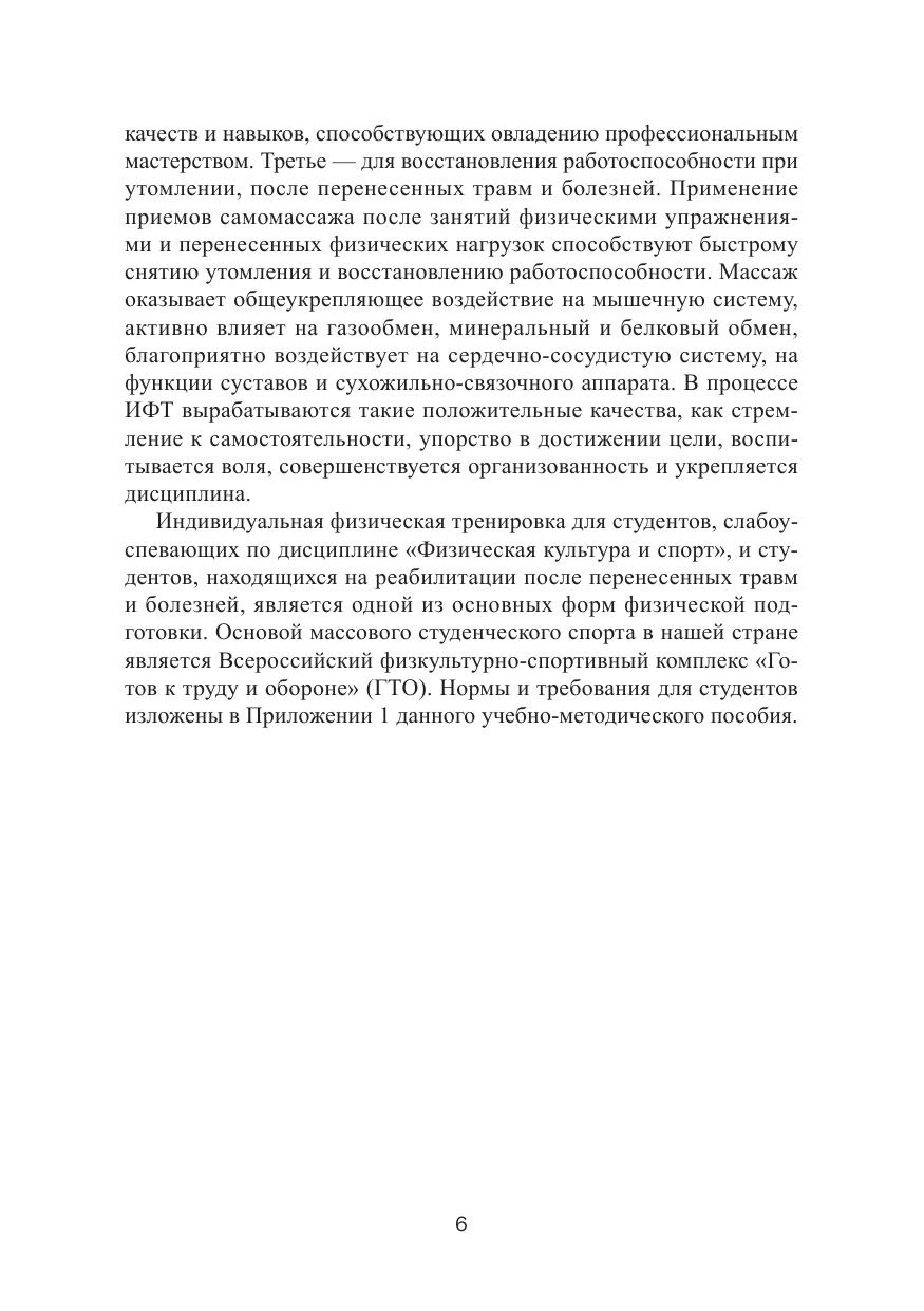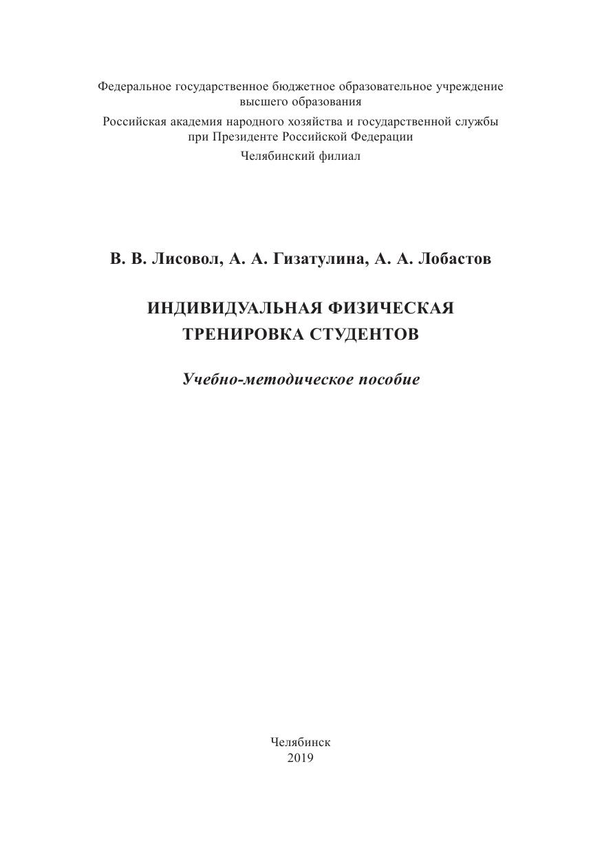 В учебно-методическом пособии рассматриваются различные формы организации индивидуальной физической тренировки студентов Челябинского филиала РАНХиГС всех направлений и методические рекомендации по развитию и совершенствованию физических качеств. Изложены способы самоконтроля за функциональным состоянием организма и приемы самомассажа, приводятся наиболее простые и доступные методы оценки показателей физической нагрузки и работоспособности.